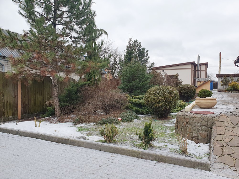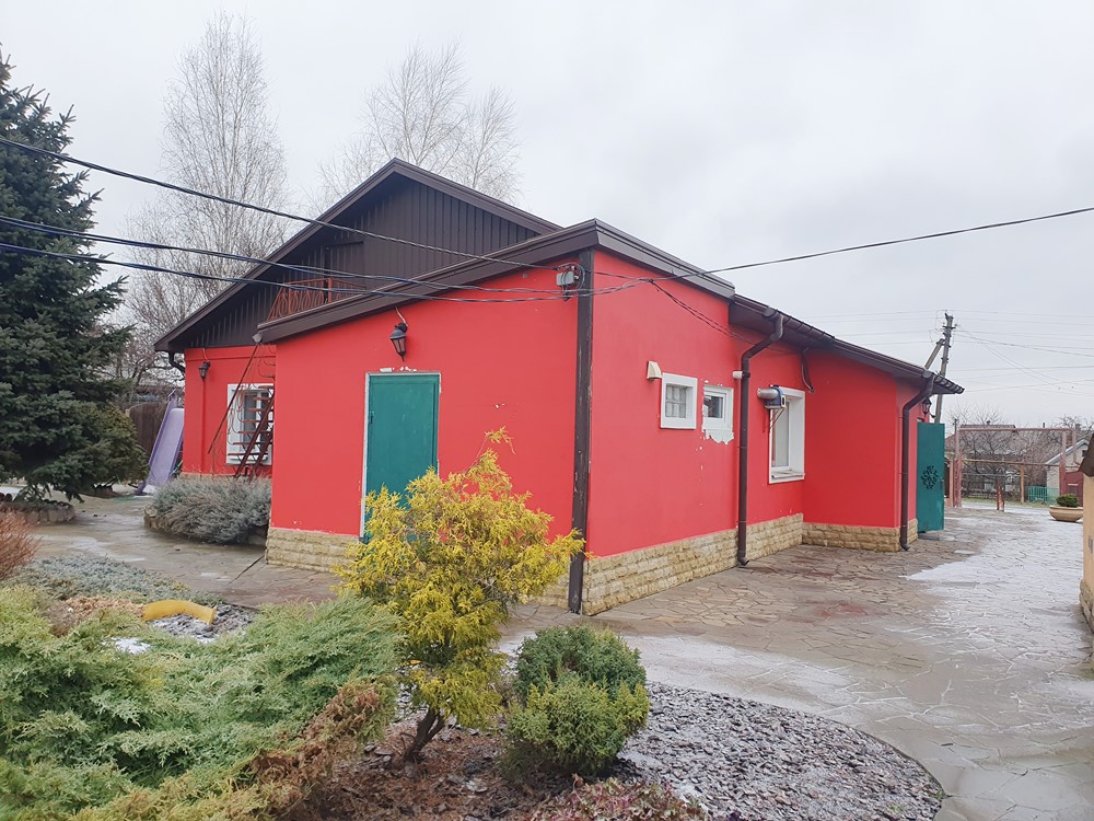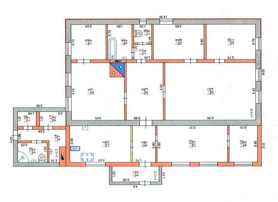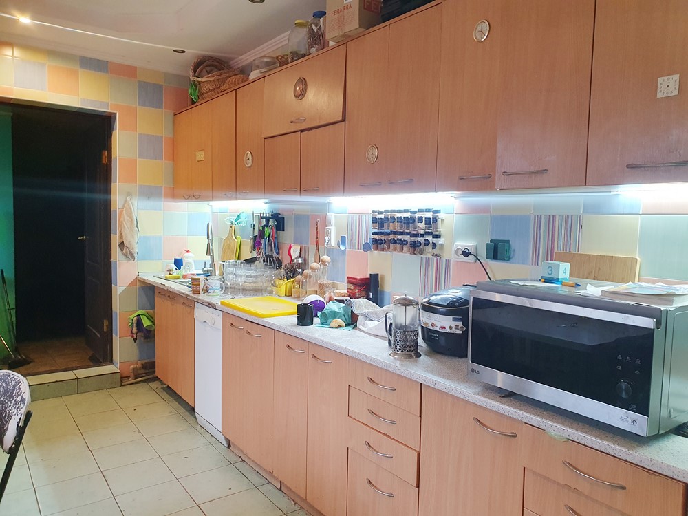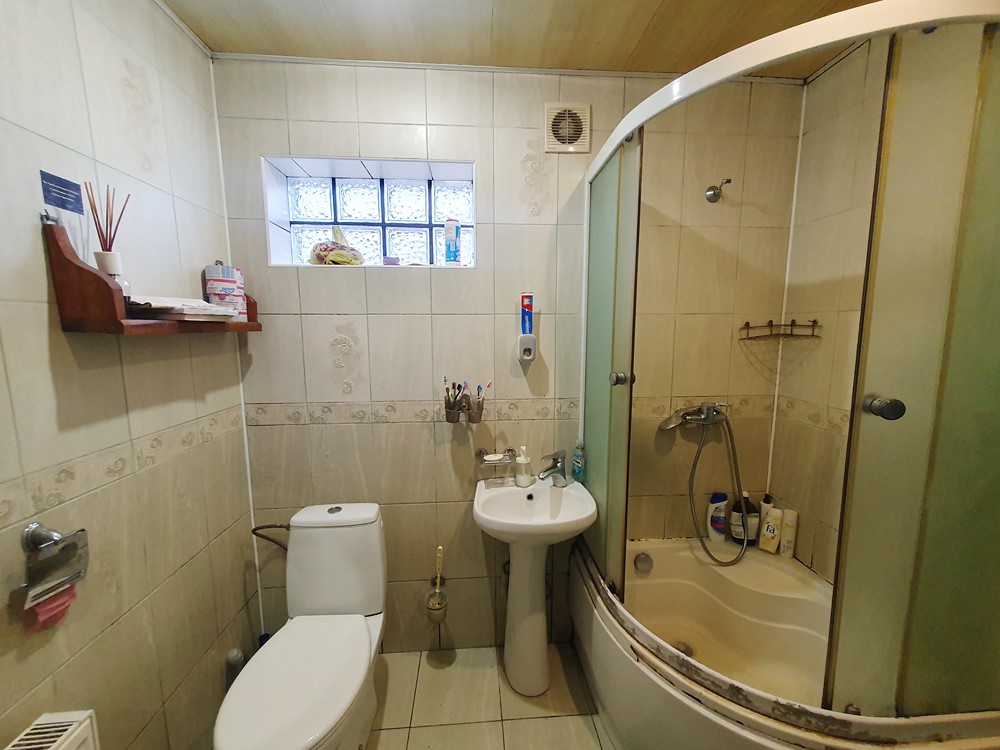 151,2м.кв. в 1-м этаже + отдельный вход на горище, стены кирпичные + утеплен, газ, свет 380V, заведено 15 киловатт. крыша метало черепица, кондиционеры, бойлер, спутниковые антенны. Планировка: гостиная с действующим камином, кухня, 7 комнат, 3 санузла, 3 коридора, 2 кладовки.