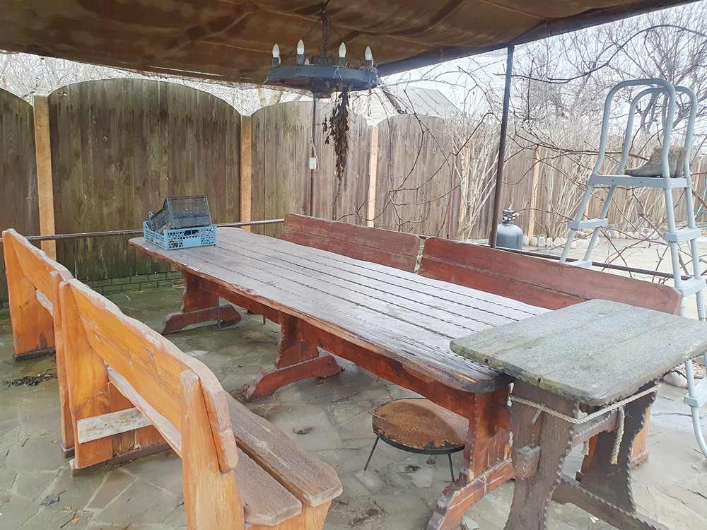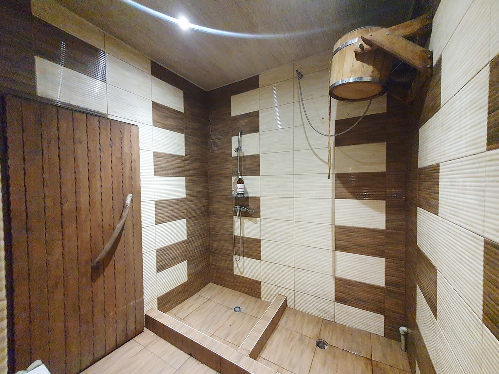 Двор: Огорожен забором, дорожки и парковка выложены плитняком, взрослое озеленение, фруктовый сад, бассейн под отделку, отдельно стоящая сауна с комнатой отдыха и санузлом, хоз/постройки с твердотопливным котлом, погреб, крытый дровяник, детская площадка, подземное хранилище питьевой воды на 10м. куб, беседка, теплица под восстановление, навес на несколько автомобилей. |
