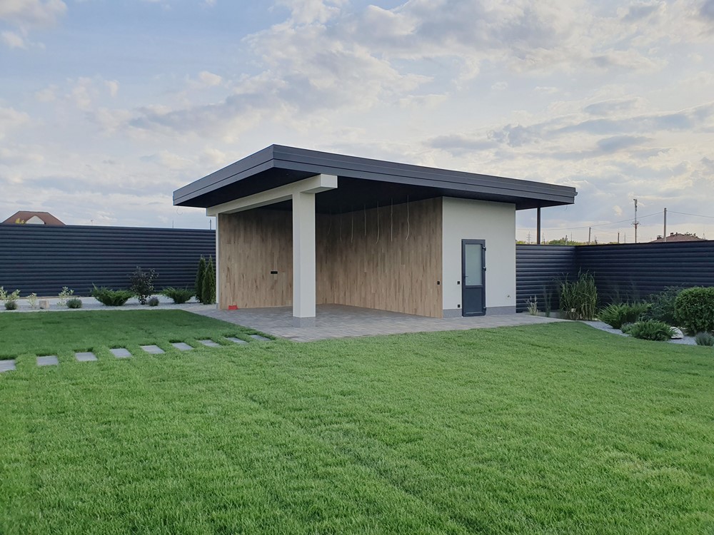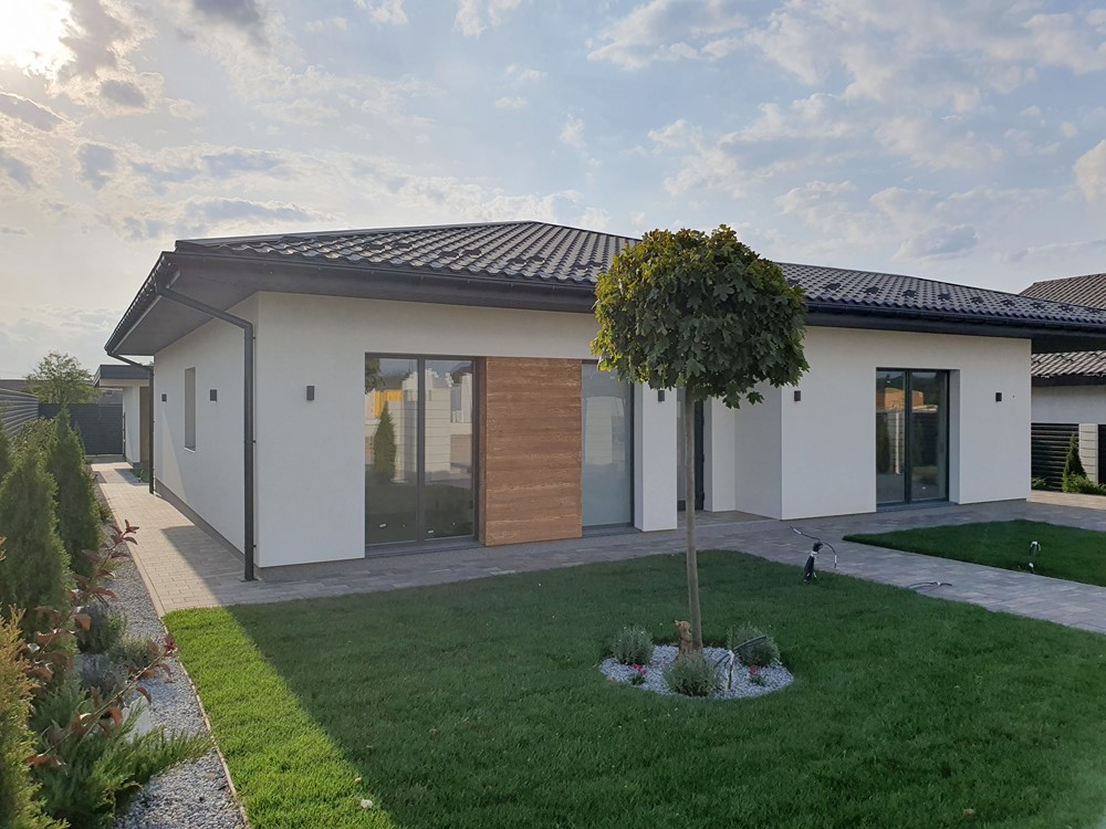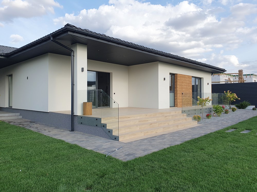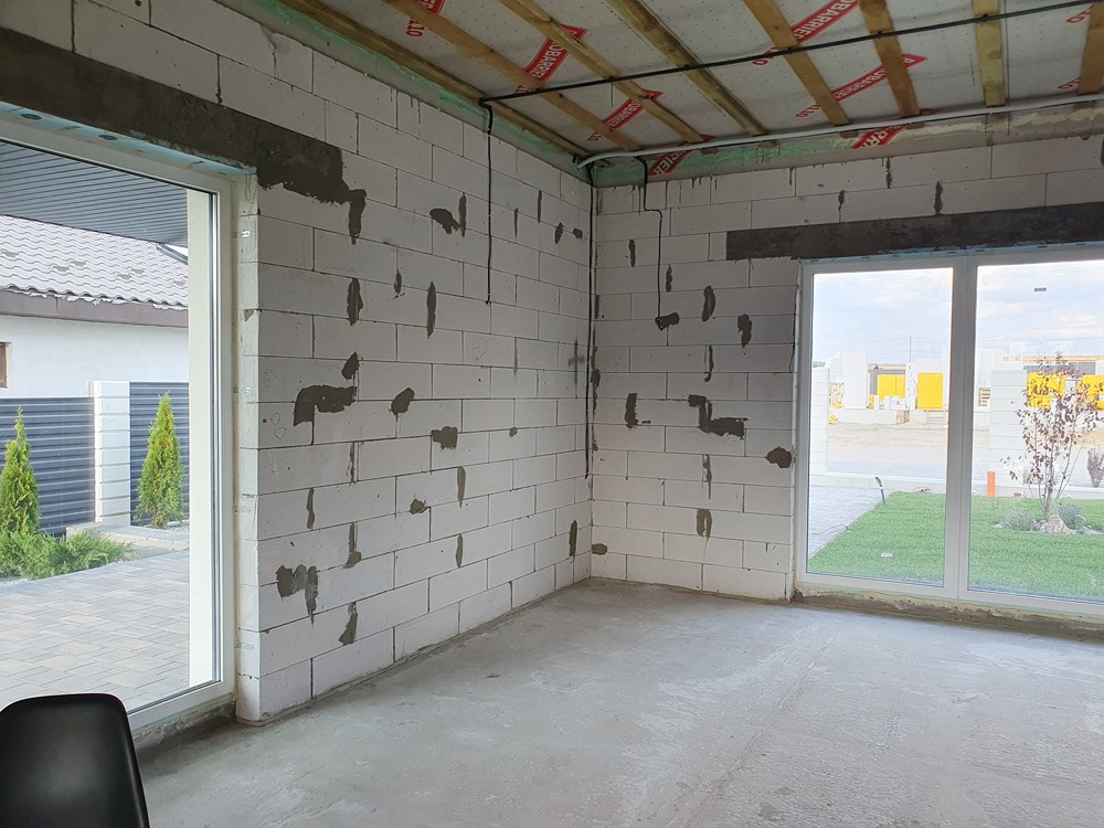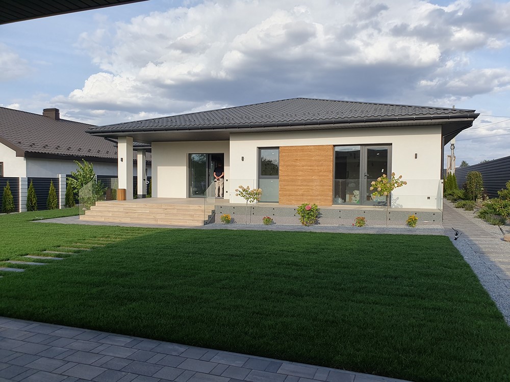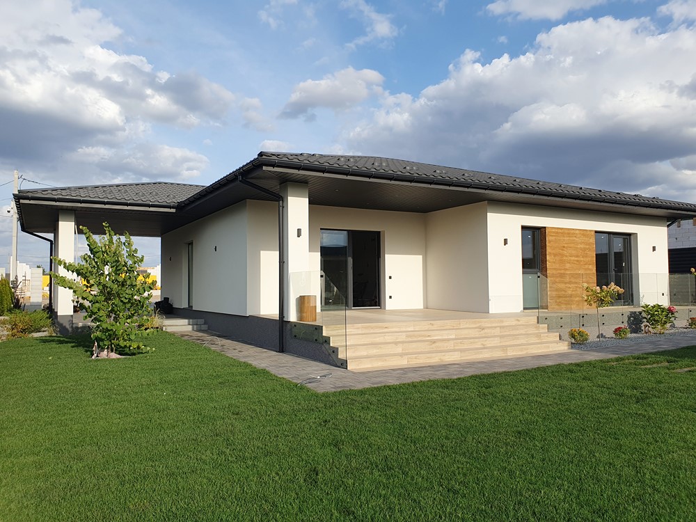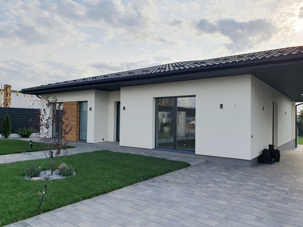 126м.кв. 1-но этажный + терраса 32м.кв. + встроенный навес для автомобиля, стены газобетон толщина 300мм. + утеплен минеральной ватой 100мм, окна металлопластиковые раздвижной системы с теплым монтажом, крыша метало черепица, высокие потолки, видеонаблюдение, охрана. Подготовлено под зарядку электромобиля, солнечные панели, генератор. Внутри состояние под отделку. Планировка: кухня - студия с выходом на террасу, детская спальня, гостевой санузел, кабинет, мастер спальня с гардеробной и своим санузлом, топочная, коридор.