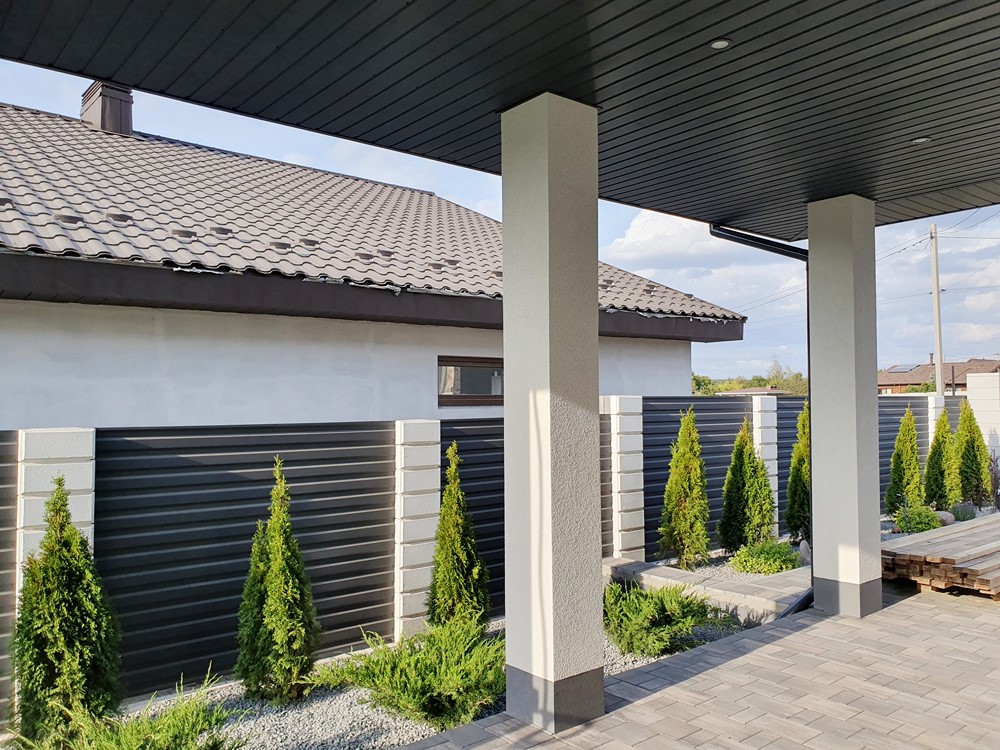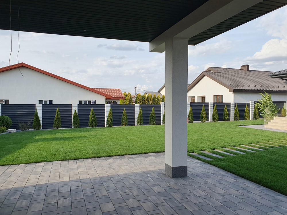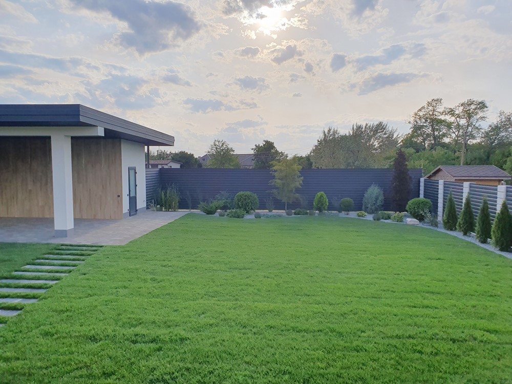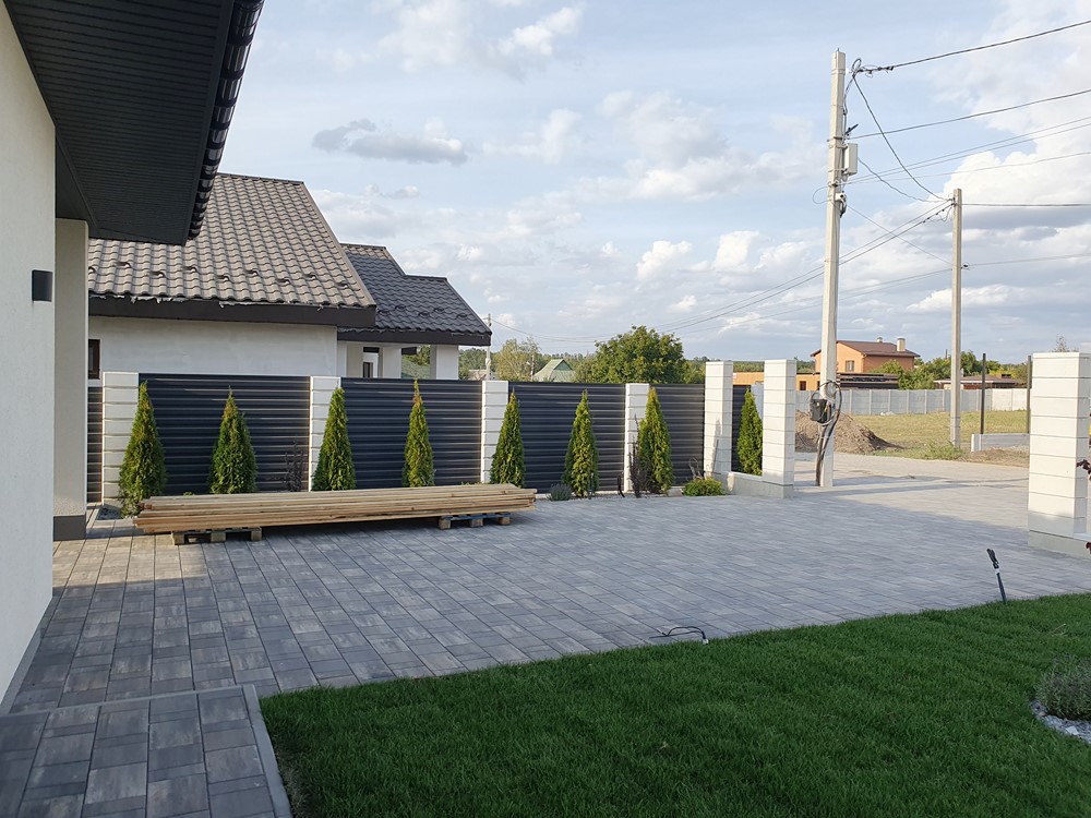 Двор: Огорожен забором, автоматические ворота, вечерняя подсветка территории, газон с автоматическим поливом, молодые деревья, дорожки выложены тротуарной плиткой, есть отдельно стоящее помещение с зоной барбекю, санузлом, и тех/помещением, место парковки для машин.. |