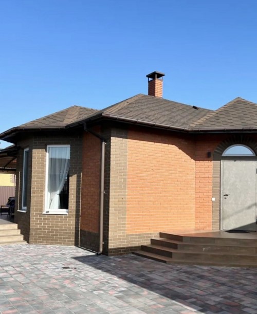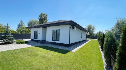 132м.кв. 1-но этажный, стены газобетон + утеплен, металлопластиковые окна, крыша металлочерепица, вода городская, солнечные панели, тепловой насос, стационарный инвертер, интернет, кондиционеры. Внутри заканчивают новый свежий современный ремонт с полной комплектацией мебелью и бытовой техникой. Осталось по мелочам, повесить шторы, и сделать уборку. Планировка: кухня – студия с выходом на террасу которая смотрит на задний двор с бассейном и шикарным видом на посадку, 3 спальни, два санузла, коридор, топочная.
