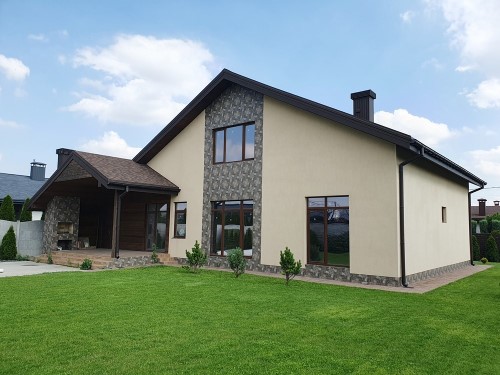 350м.кв. в 3-х уровнях. Крыша мягкая кровля, фасад утеплен и облицован навесными панелями, окна металлопластиковые, газ, вода городская, В доме выполнен ремонт в стиле современной классики, есть все необходимое, встроенная кухонная мебель и бытовая техника, кондиционеры, сигнализация, интернет, охрана. Планировка: кухня-соловая с выходом на террасу, просторная гостиная с двойным светом и действующим камином, санузел. 2-й этаж: 3 спальни, санузел, гардеробная. Мансарда: холл, 2 спальни