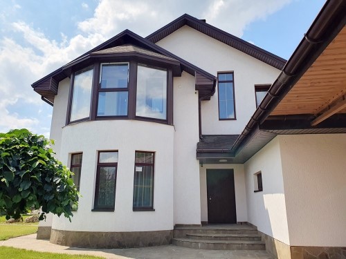 Огорожен капитальным забором, взрослый ухоженный ландшафтный дизайн, газон с автополивом, тротуарные дорожки выложены плиткой, 2 навеса под несколько автомобилей, крытая терраса, отдельно стоящие хоз. постройки + отдельно стоящий гостевой 2-х этажный домик, примерно под 100м.кв. с подвальной частью, внутри после строителей