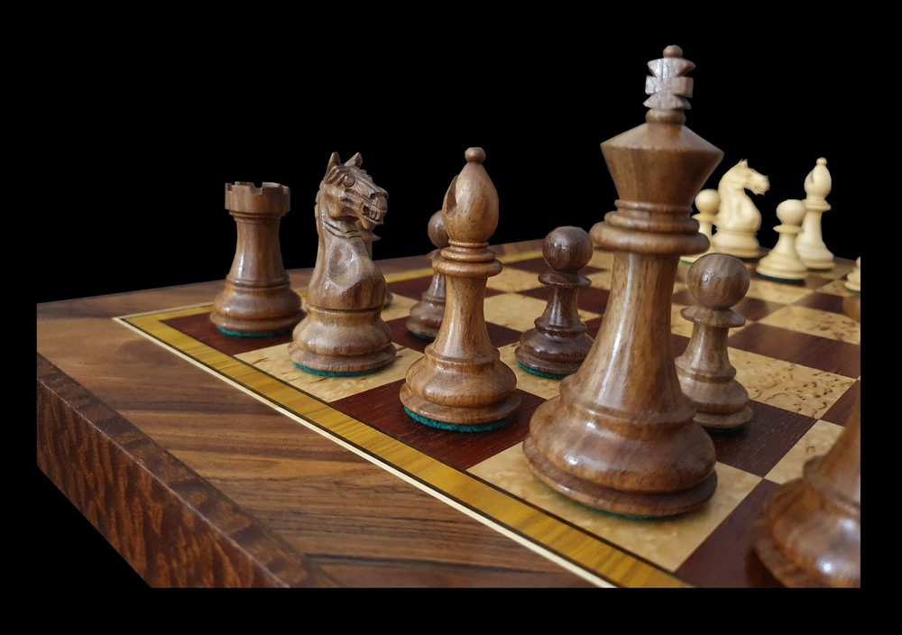 Фигуры: Шахматные Фигуры, ручной работы, выполнены из массива натуральных сортов древесины таких как Самшит и Индийский Палисандр, и отделаны качественным прозрачным лаком. Размеры шахматных фигур: пешка - 45/23мм. Король - 90/42мм. Снизу каждая фигурка оклеена сукном для безопасного скольжения по поверхности. В цокольной части все фигурки имеют утяжелитель.