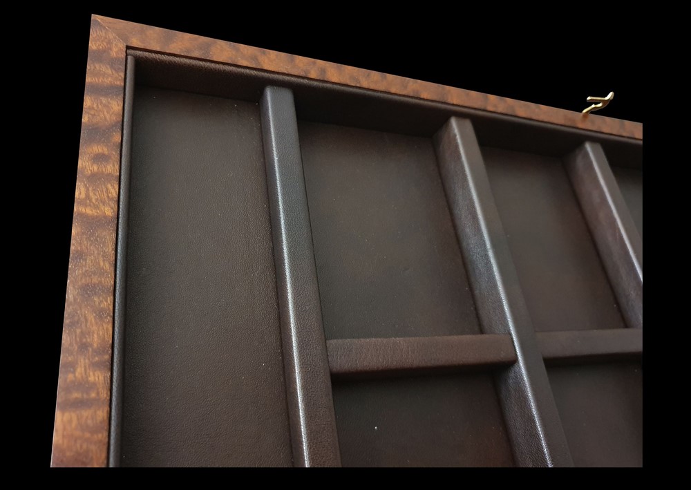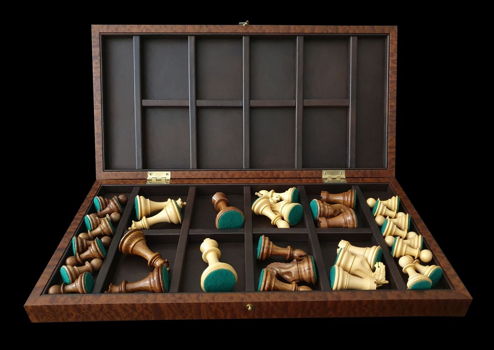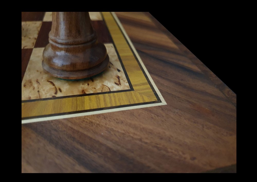 Подробное описание: Набор из экзотических натуральных шпонов сплошь облицованной столешницы: Светлая клетка из Карельской березы, темная из Красного Сандалового дерева. Обрамление выложено из Бразильского Палисандра Рио, рисунком текстуры, выложенной в конверт. Украшением композиции служит наборной пояс по периметру шахматного поля из Скумпии. Десятки маленьких геометрических деталей уложены с высокой точностью между собой в единую линию и обрамлены тонкими изящными жилками из Мореного Дуба и белоснежного Клена. Завершает набор по периметру всей доски Красное дерево Памеле, которое переходит и на торцы всего изделия и с частичным заходом на внутреннюю часть доски. Внутренние ячейки и бортики для безопасного хранения шахматных фигур, полностью облицованы натуральной кожей пр-во Италия - каждый бортик отдельной деталью. Фурнитура индивидуального изготовления: Запирающий латунный крючок ручной работы с боковой части изделия и внутренние навесы.