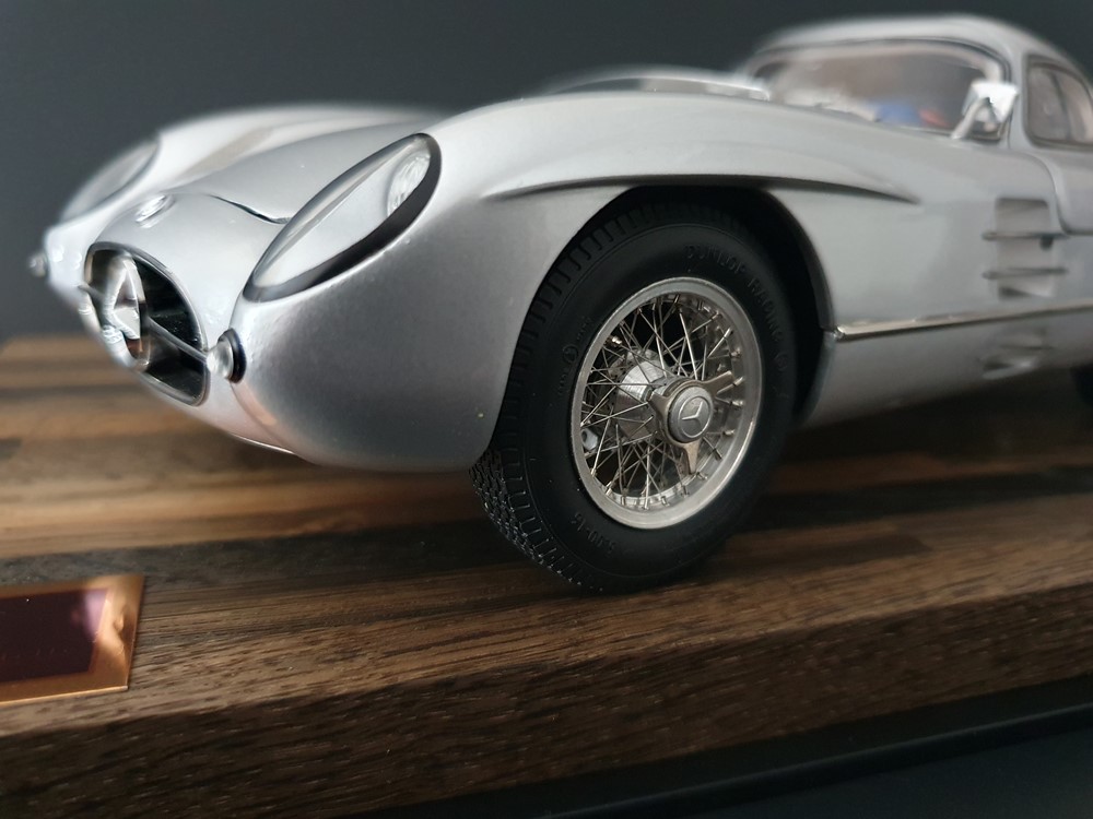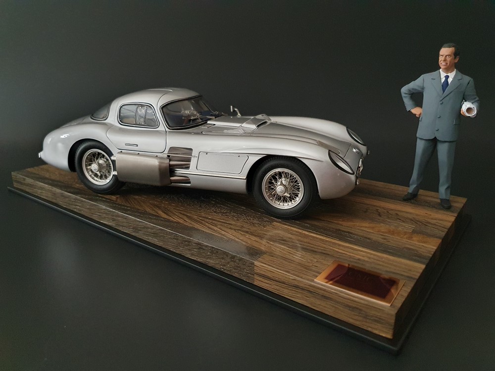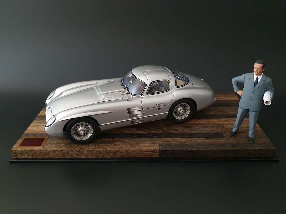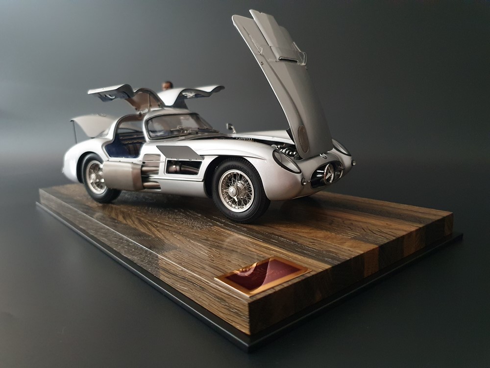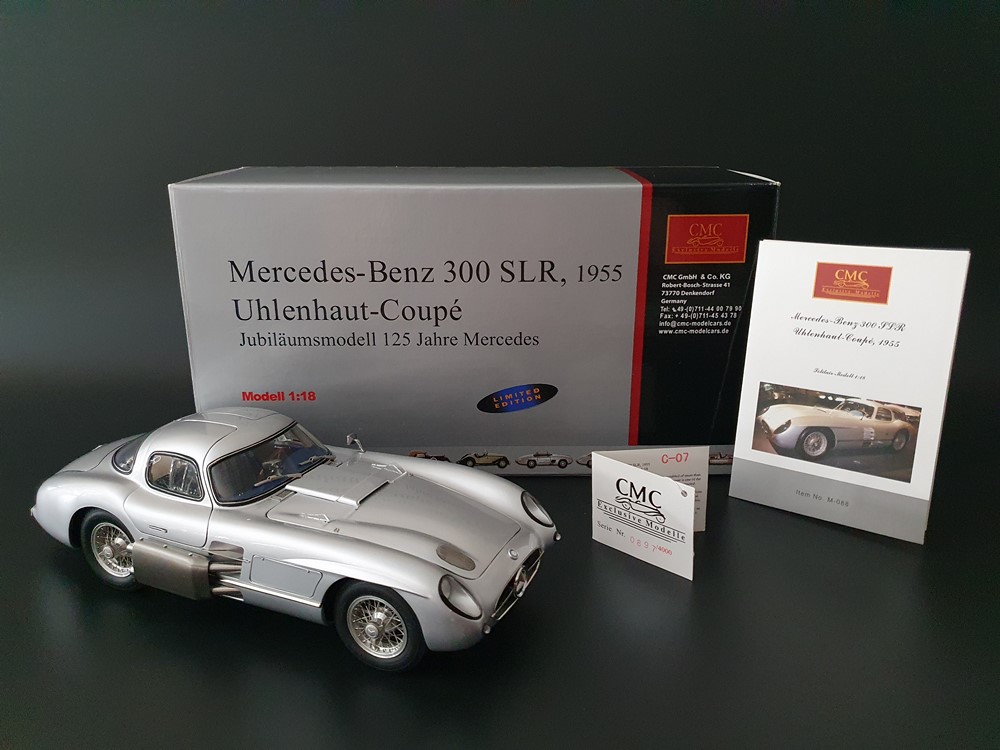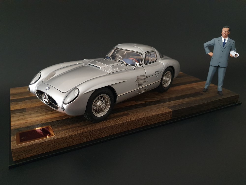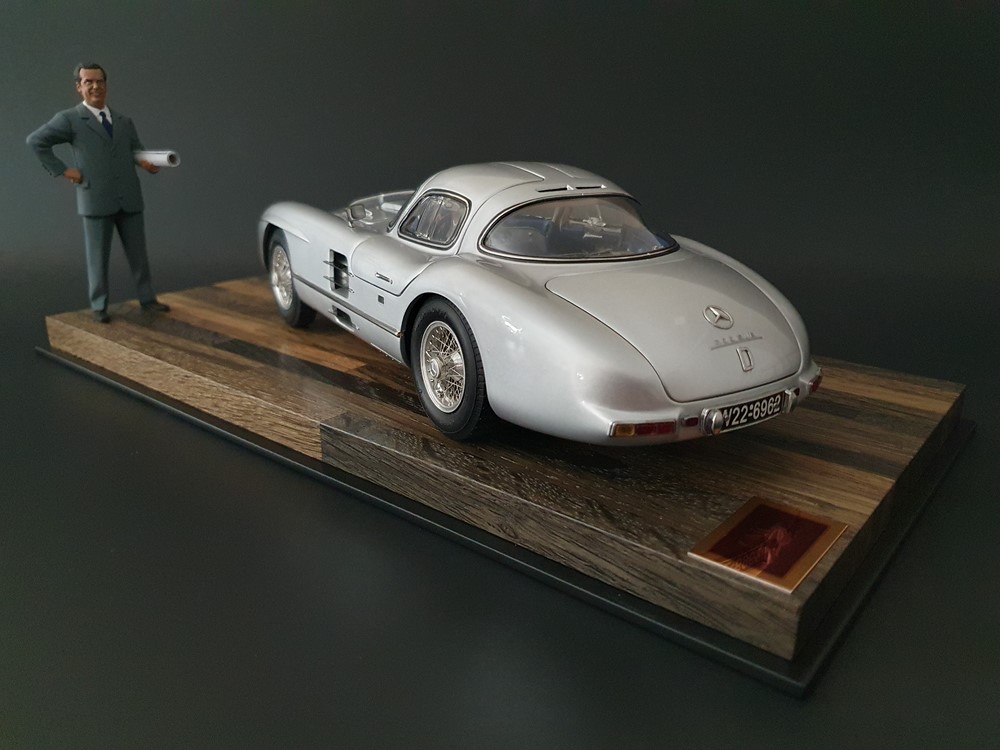 История: Когда Рудольф Уленхаут, архитектор гоночного автомобиля 300 SLR, был на Mille Miglia 1955 года, чтобы наблюдать за успехами Mercedes, он также размышлял над идеей оснастить гоночный автомобиль 300 SLR закрытым верхом для будущих гонок на выносливость. Его размышления воплотились в форме гоночного купе с характеристиками, с которыми не мог сравниться ни один другой дорожный спортивный автомобиль. Двухместный автомобиль разогнался до скорости 290 км/ч во время испытаний на закрытом участке автомагистрали за пределами Мюнхена. Впечатленный его необычайными характеристиками на пересеченной местности протяженностью 3500 км (более 2000 миль), репортер-испытатель швейцарского журнала Automobil Revue сказал следующее: «Мы едем на машине, которой требуется всего лишь секунда, чтобы обогнать остальной поток машин, и для которой 200 км/ч на тихой автомагистрали — это не более чем разговорный темп. С его невозмутимым управлением на поворотах он относится к законам центробежной силы с явным пренебрежением…» Гоночный автомобиль 300 SLR был создан на основе знаменитого чемпиона Формулы-1 W196 сезона 1954-55 годов. Аббревиатура SLR означает Sport Light-Racing (Sport Leicht-Rennen). Считающийся одним из самых красивых гоночных автомобилей всех времен, новый SLR был оснащен немного другим рядным восьмицилиндровым двигателем, объем которого был увеличен до 3 литров. Два из девяти шасси 300 SLR на колесах, а именно 0007/55 и 0008/55, были переделаны в купе 300 SLR с закрытым верхом и дверями типа «крыло чайки». Они предназначались для будущей Carrera Panamericana. Кузов купе SLR был обшит листовым Elektron, магниевым сплавом, который даже легче алюминия. Полукруглое ветровое стекло создавало очень малое сопротивление воздуха. Как и в гоночном SLR, водитель купе должен был управлять педалями, расставив ноги за рулевым колесом. Под капотом находился продольно установленный восьмицилиндровый двигатель, который располагался сразу за передней осью, развивая максимальный крутящий момент 234 фунт-фут при 5950 об/мин и максимальную мощность 310 лошадиных сил при 7400 об/мин. Из-за проблем безопасности после трагической аварии в Ле-Мане в июне Mercedes-Benz решила уйти из автоспорта в конце 1955 года. В результате проект купе SLR был отложен и так и не был запущен в производство. Впоследствии Рудольф Уленхаут присвоил одно из купе, шасси для своего личного пользования. Весом всего 1117 км и способностью развивать скорость 290 км/ч, купе Uhlenhaut было самым быстрым дорожным автомобилем своего времени в мире. Хотя купе 300 SLR не стали участвовать в серьезных гонках, шасси 0007/55 было не чуждым гонкам. После Гран-при Швеции 1955 года оно снова появилось на RAC Tourist Trophy, который состоялся в Дандроде, Северная Ирландия, 17 сентября 1955 года.