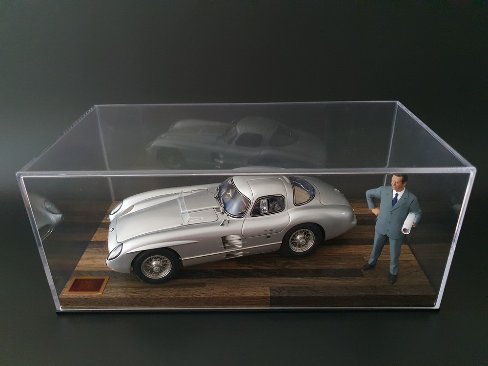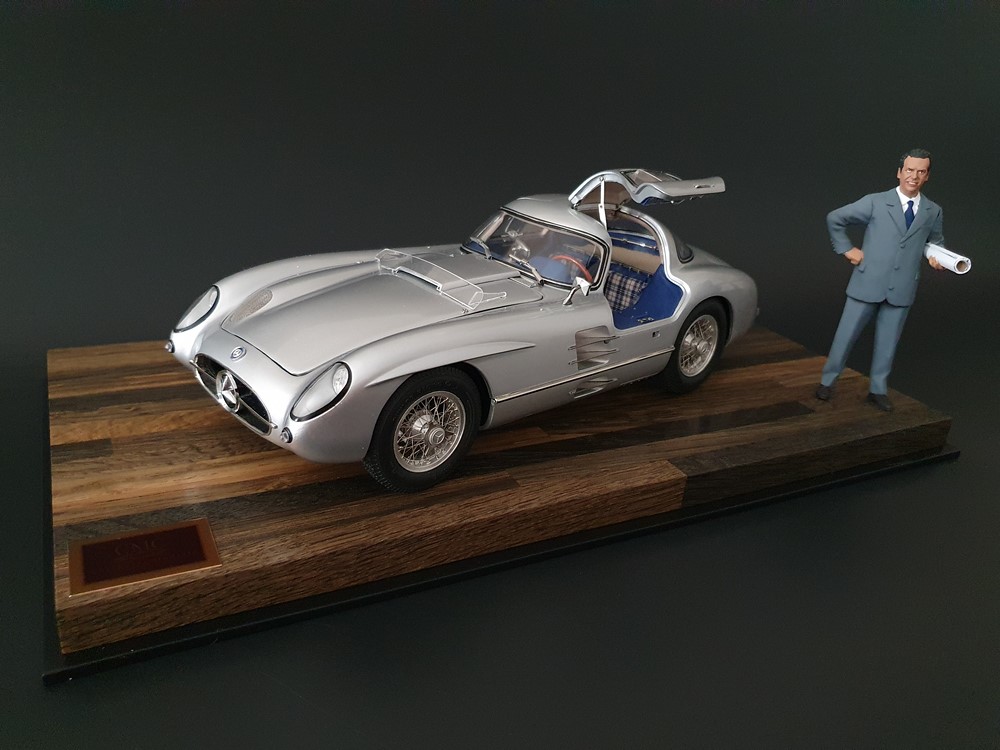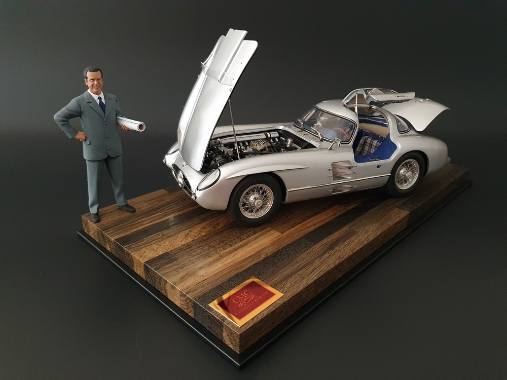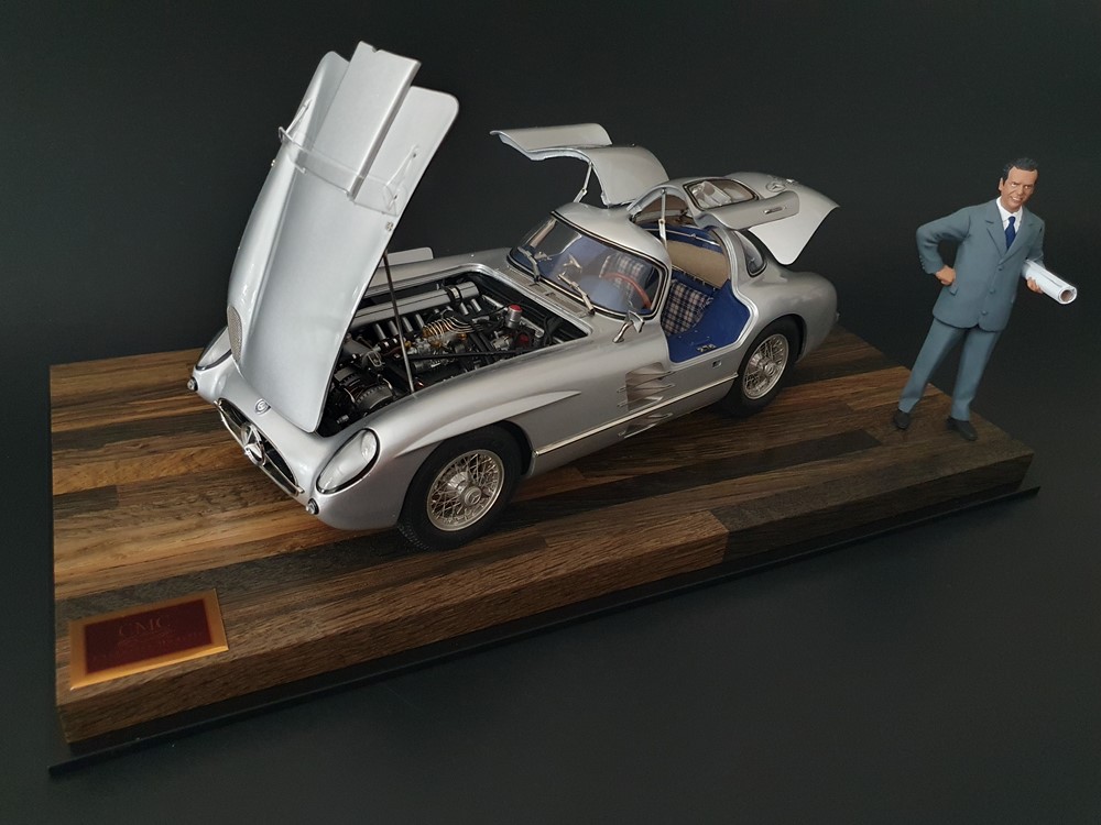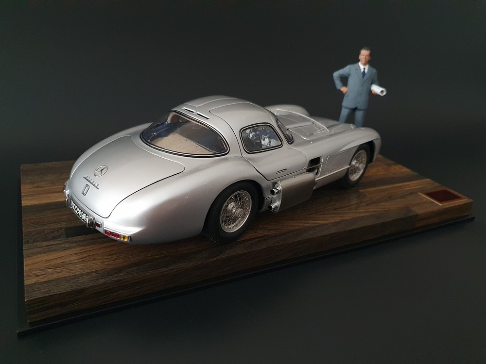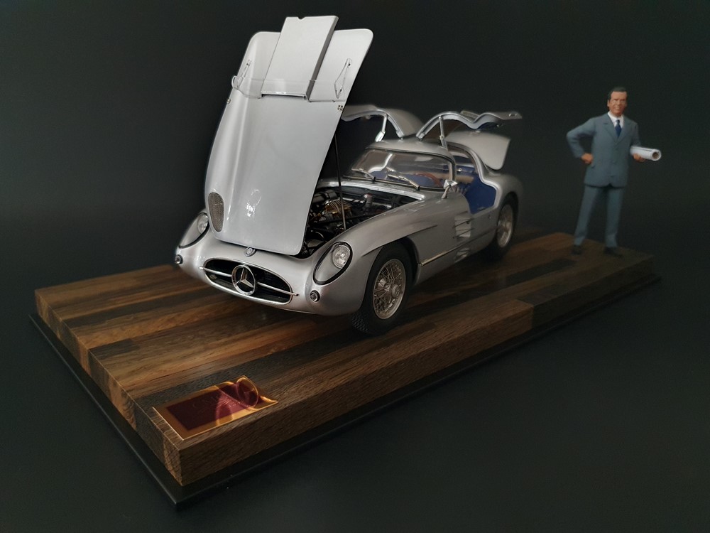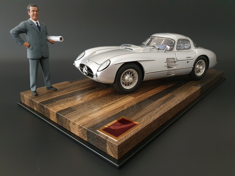 История: Когда Рудольф Уленхаут, архитектор гоночного автомобиля 300 SLR, был на Mille Miglia 1955 года, чтобы наблюдать за успехами Mercedes, он также размышлял над идеей оснастить гоночный автомобиль 300 SLR закрытым верхом для будущих гонок на выносливость. Его размышления воплотились в форме гоночного купе с характеристиками, с которыми не мог сравниться ни один другой дорожный спортивный автомобиль. Двухместный автомобиль разогнался до скорости 290 км/ч во время испытаний на закрытом участке автомагистрали за пределами Мюнхена. Впечатленный его необычайными характеристиками на пересеченной местности протяженностью 3500 км (более 2000 миль), репортер-испытатель швейцарского журнала Automobil Revue сказал следующее: «Мы едем на машине, которой требуется всего лишь секунда, чтобы обогнать остальной поток машин, и для которой 200 км/ч на тихой автомагистрали — это не более чем разговорный темп. С его невозмутимым управлением на поворотах он относится к законам центробежной силы с явным пренебрежением…» Гоночный автомобиль 300 SLR был создан на основе знаменитого чемпиона Формулы-1 W196 сезона 1954-55 годов. Аббревиатура SLR означает Sport Light-Racing (Sport Leicht-Rennen). Считающийся одним из самых красивых гоночных автомобилей всех времен, новый SLR был оснащен немного другим рядным восьмицилиндровым двигателем, объем которого был увеличен до 3 литров. Два из девяти шасси 300 SLR на колесах, а именно 0007/55 и 0008/55, были переделаны в купе 300 SLR с закрытым верхом и дверями типа «крыло чайки». Они предназначались для будущей Carrera Panamericana. Кузов купе SLR был обшит листовым Elektron, магниевым сплавом, который даже легче алюминия. Полукруглое ветровое стекло создавало очень малое сопротивление воздуха. Как и в гоночном SLR, водитель купе должен был управлять педалями, расставив ноги за рулевым колесом. Под капотом находился продольно установленный восьмицилиндровый двигатель, который располагался сразу за передней осью, развивая максимальный крутящий момент 234 фунт-фут при 5950 об/мин и максимальную мощность 310 лошадиных сил при 7400 об/мин. Из-за проблем безопасности после трагической аварии в Ле-Мане в июне Mercedes-Benz решила уйти из автоспорта в конце 1955 года. В результате проект купе SLR был отложен и так и не был запущен в производство. Впоследствии Рудольф Уленхаут присвоил одно из купе, шасси для своего личного пользования. Весом всего 1117 км и способностью развивать скорость 290 км/ч, купе Uhlenhaut было самым быстрым дорожным автомобилем своего времени в мире. Хотя купе 300 SLR не стали участвовать в серьезных гонках, шасси 0007/55 было не чуждым гонкам. После Гран-при Швеции 1955 года оно снова появилось на RAC Tourist Trophy, который состоялся в Дандроде, Северная Ирландия, 17 сентября 1955 года.