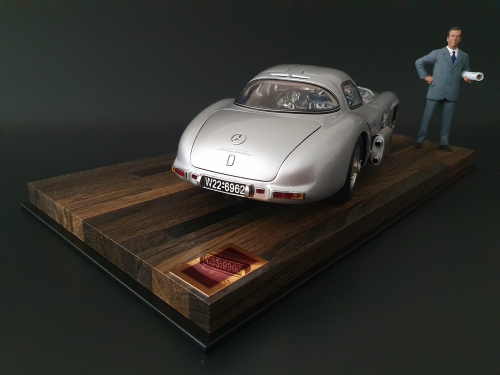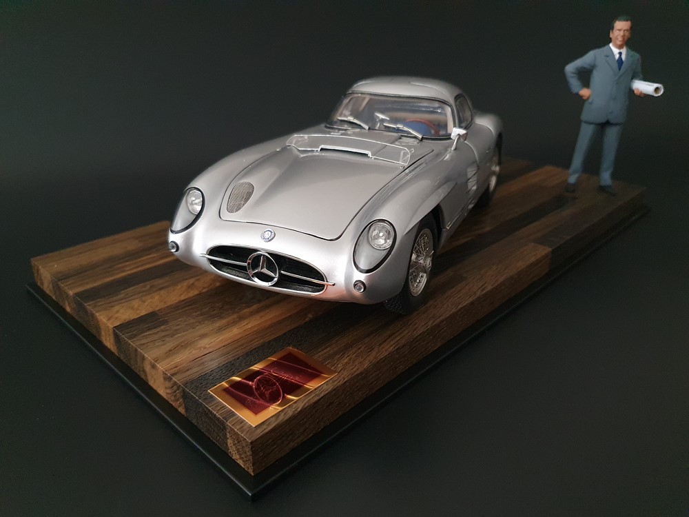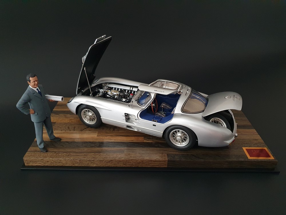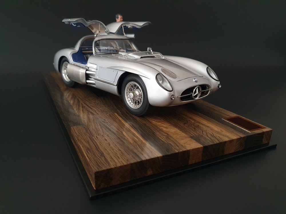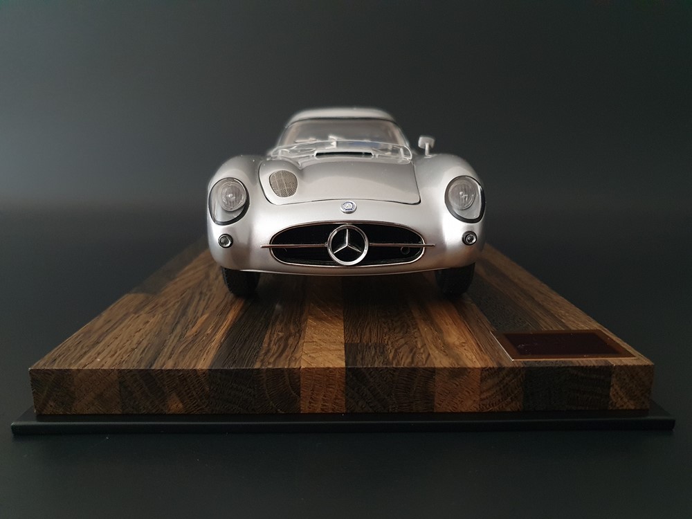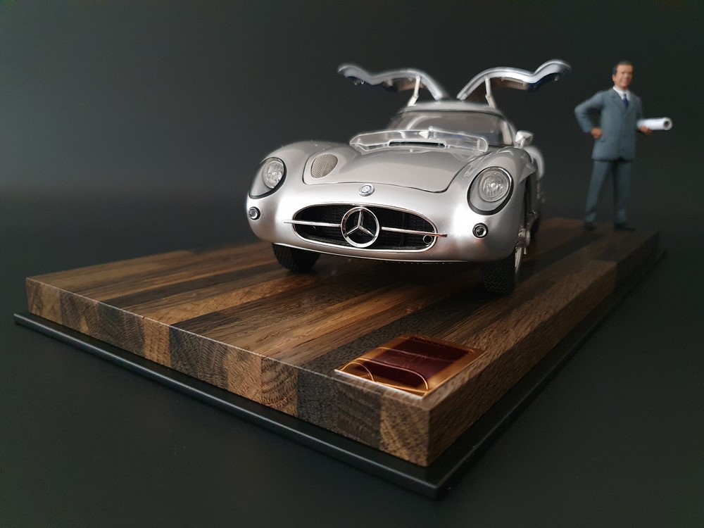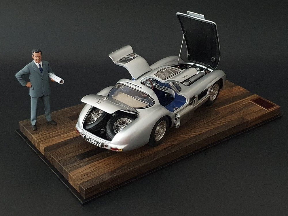 История: Когда Рудольф Уленхаут, архитектор гоночного автомобиля 300 SLR, был на Mille Miglia 1955 года, чтобы наблюдать за успехами Mercedes, он также размышлял над идеей оснастить гоночный автомобиль 300 SLR закрытым верхом для будущих гонок на выносливость. Его размышления воплотились в форме гоночного купе с характеристиками, с которыми не мог сравниться ни один другой дорожный спортивный автомобиль. Двухместный автомобиль разогнался до скорости 290 км/ч во время испытаний на закрытом участке автомагистрали за пределами Мюнхена. Впечатленный его необычайными характеристиками на пересеченной местности протяженностью 3500 км (более 2000 миль), репортер-испытатель швейцарского журнала Automobil Revue сказал следующее: «Мы едем на машине, которой требуется всего лишь секунда, чтобы обогнать остальной поток машин, и для которой 200 км/ч на тихой автомагистрали — это не более чем разговорный темп. С его невозмутимым управлением на поворотах он относится к законам центробежной силы с явным пренебрежением…» Гоночный автомобиль 300 SLR был создан на основе знаменитого чемпиона Формулы-1 W196 сезона 1954-55 годов. Аббревиатура SLR означает Sport Light-Racing (Sport Leicht-Rennen). Считающийся одним из самых красивых гоночных автомобилей всех времен, новый SLR был оснащен немного другим рядным восьмицилиндровым двигателем, объем которого был увеличен до 3 литров. Два из девяти шасси 300 SLR на колесах, а именно 0007/55 и 0008/55, были переделаны в купе 300 SLR с закрытым верхом и дверями типа «крыло чайки». Они предназначались для будущей Carrera Panamericana. Кузов купе SLR был обшит листовым Elektron, магниевым сплавом, который даже легче алюминия. Полукруглое ветровое стекло создавало очень малое сопротивление воздуха. Как и в гоночном SLR, водитель купе должен был управлять педалями, расставив ноги за рулевым колесом. Под капотом находился продольно установленный восьмицилиндровый двигатель, который располагался сразу за передней осью, развивая максимальный крутящий момент 234 фунт-фут при 5950 об/мин и максимальную мощность 310 лошадиных сил при 7400 об/мин. Из-за проблем безопасности после трагической аварии в Ле-Мане в июне Mercedes-Benz решила уйти из автоспорта в конце 1955 года. В результате проект купе SLR был отложен и так и не был запущен в производство. Впоследствии Рудольф Уленхаут присвоил одно из купе, шасси для своего личного пользования. Весом всего 1117 км и способностью развивать скорость 290 км/ч, купе Uhlenhaut было самым быстрым дорожным автомобилем своего времени в мире. Хотя купе 300 SLR не стали участвовать в серьезных гонках, шасси 0007/55 было не чуждым гонкам. После Гран-при Швеции 1955 года оно снова появилось на RAC Tourist Trophy, который состоялся в Дандроде, Северная Ирландия, 17 сентября 1955 года.
