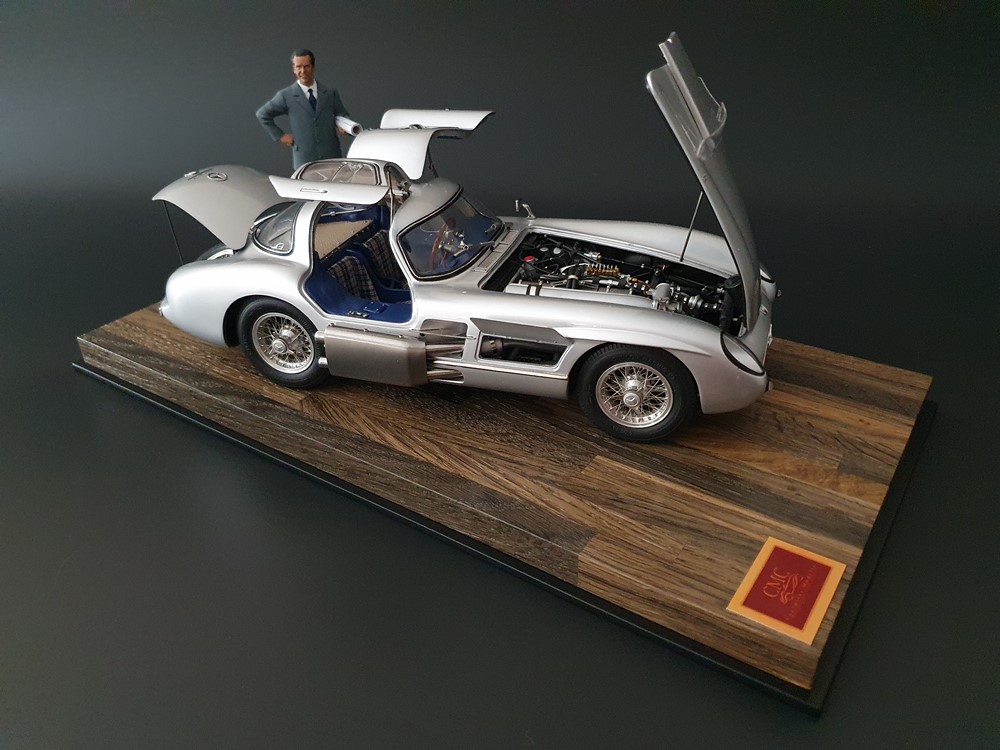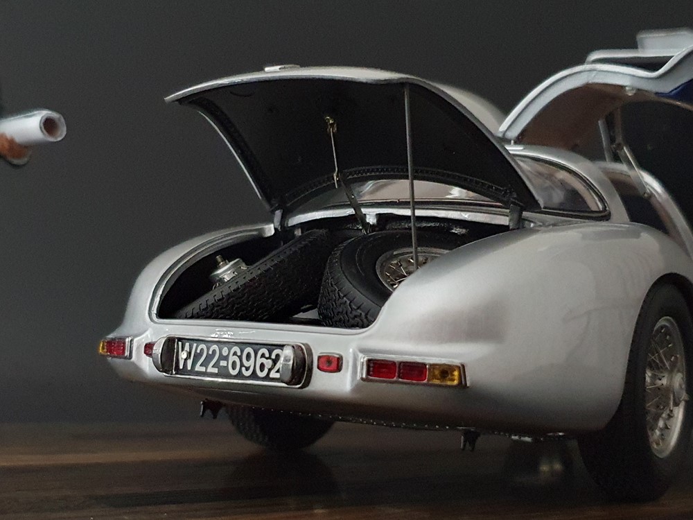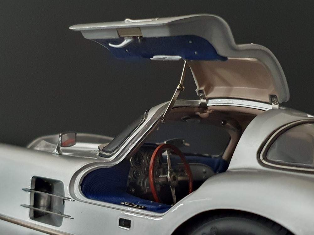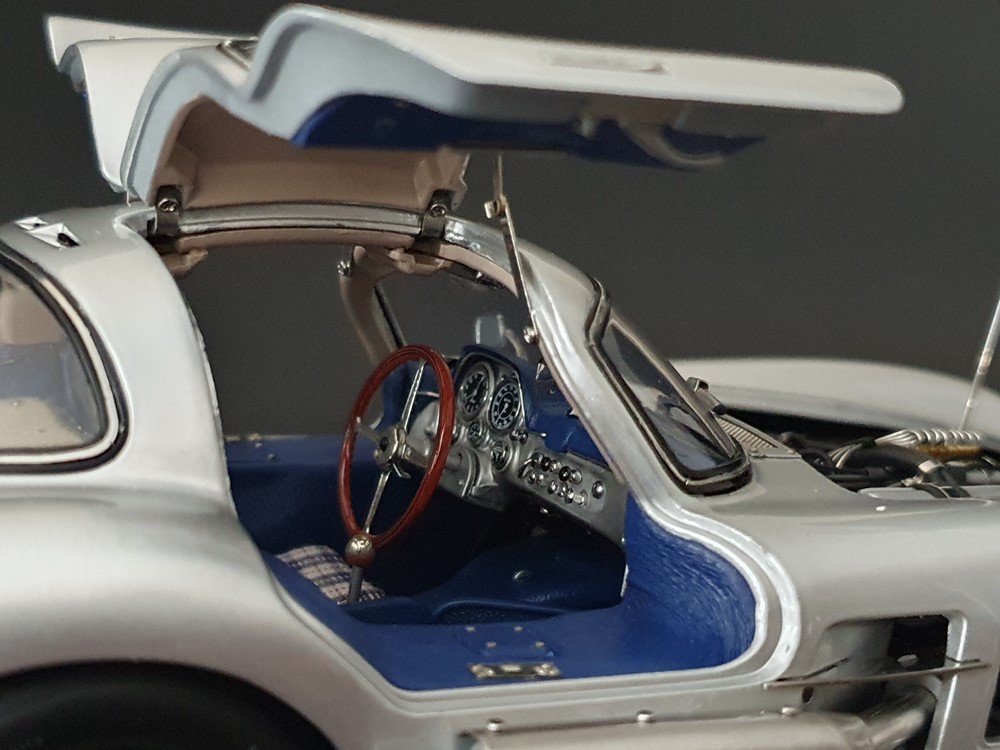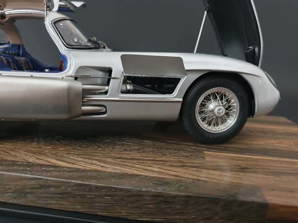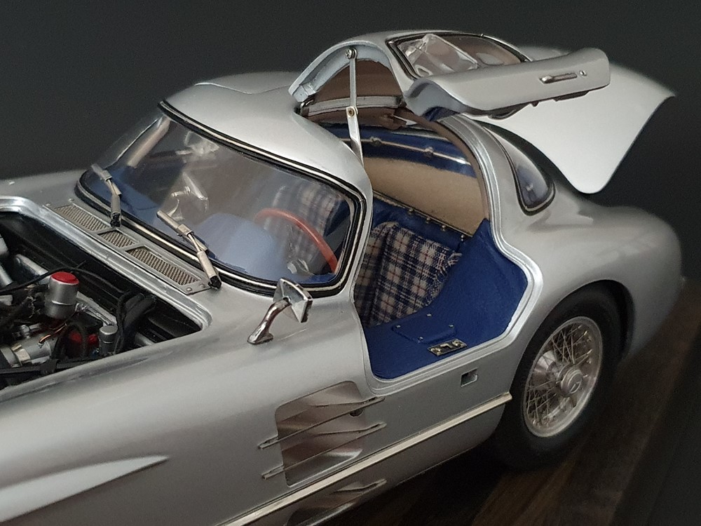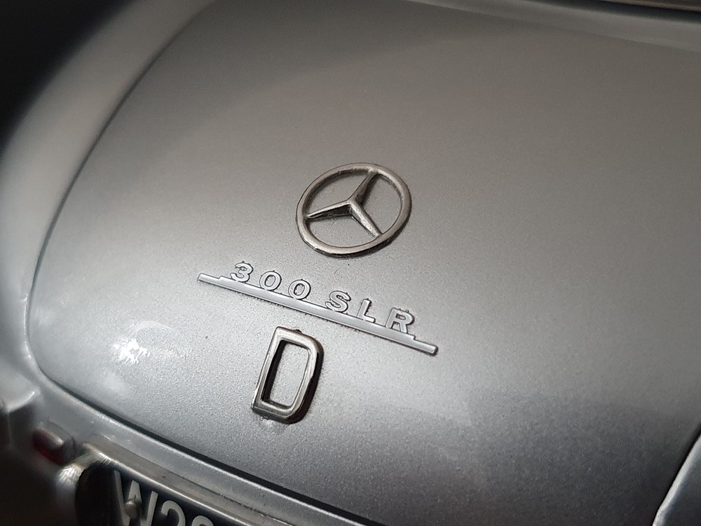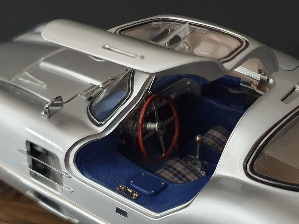 Дизайн этого купе напоминает кабину самолета. Сиденья обтянуты клетчатой тканью, как и в оригинале, салон обтянут синей кожей. Кабина укомплектована всеми приборами, элементами управления, переключателями и рычагами. Все точно воспроизведено как в реальном автомобиле. Внутри багажника находятся два съемных запасных колеса, имеющих разный диаметр, соответствующий диаметру передних и задних колес соответственно. Блестящие боковые трубы с навесным внешним глушителем на правом борту, изготовлены из нержавеющей стали. Крышка отверстия для обслуживания может быть снята, она удерживается на месте простым, но элегантным магнитным механизмом. Высоко детализированный и угловато установленный 8-цилиндровый рядный двигатель. Все агрегаты, трубы и кабели включены. Опорная штанга для капота двигателя рабочая. Вращающееся форточка, встроенное в боковое окно. Спицы, скрученные вручную, ниппели из нержавеющей стали и алюминиевый обод. Тонкая проволочная сетка защищает воздухозаборник двигателя. Съемные трех крылые центральные гайки и съемные колеса. Центральные гайки сконструированы таким образом, что они являются специфичными для каждой стороны (левая и правая резьба индивидуально). Точная проработка деталей задней части кузова, на которой закреплена отдельным элементом звезда Mercedes, а также обозначение типа 300 SLR и логотип D.