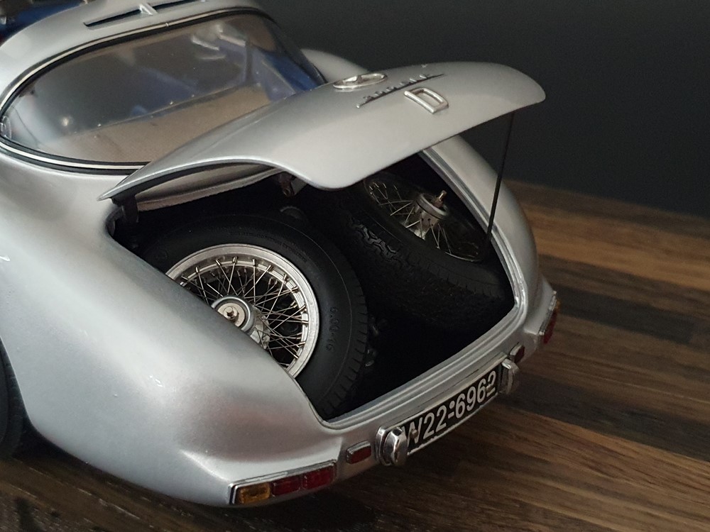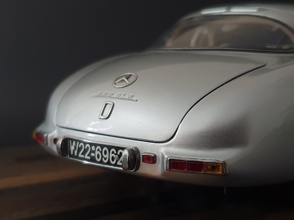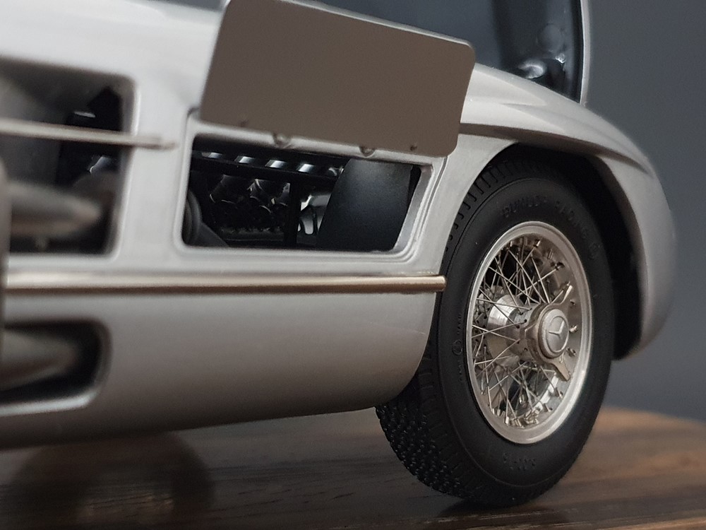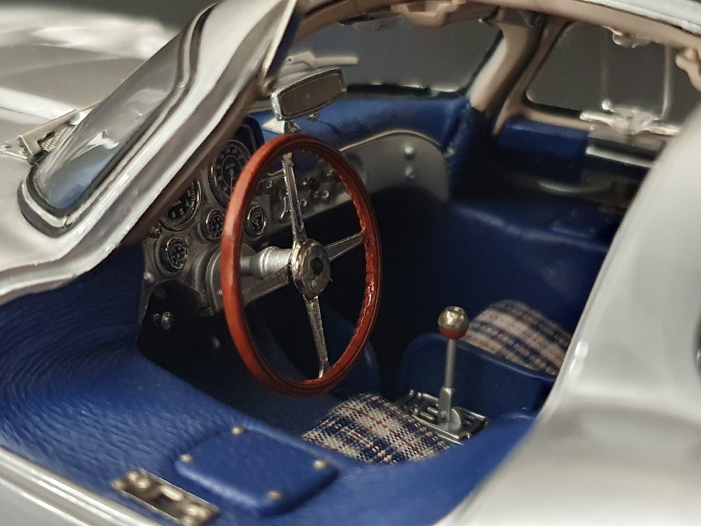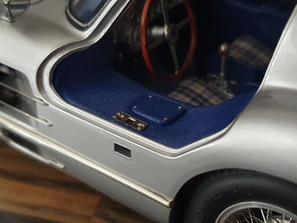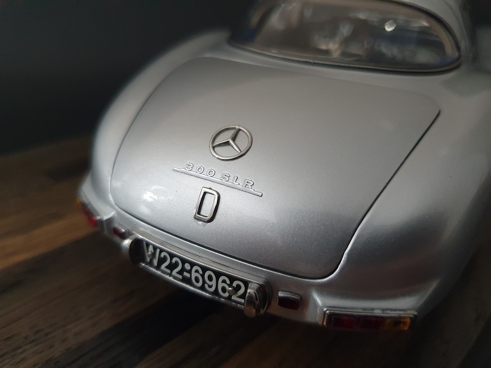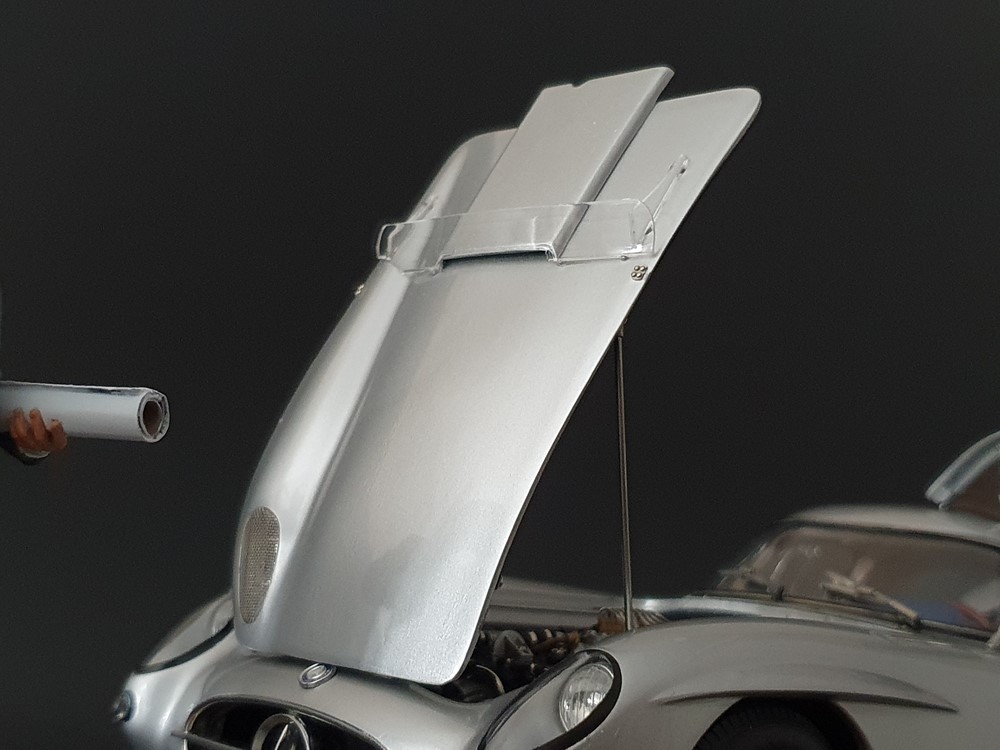 Дизайн этого купе напоминает кабину самолета. Сиденья обтянуты клетчатой тканью, как и в оригинале, салон обтянут синей кожей. Кабина укомплектована всеми приборами, элементами управления, переключателями и рычагами. Все точно воспроизведено как в реальном автомобиле. Внутри багажника находятся два съемных запасных колеса, имеющих разный диаметр, соответствующий диаметру передних и задних колес соответственно. Блестящие боковые трубы с навесным внешним глушителем на правом борту, изготовлены из нержавеющей стали. Крышка отверстия для обслуживания может быть снята, она удерживается на месте простым, но элегантным магнитным механизмом. Высоко детализированный и угловато установленный 8-цилиндровый рядный двигатель. Все агрегаты, трубы и кабели включены. Опорная штанга для капота двигателя рабочая. Вращающееся форточка, встроенное в боковое окно. Спицы, скрученные вручную, ниппели из нержавеющей стали и алюминиевый обод. Тонкая проволочная сетка защищает воздухозаборник двигателя. Съемные трех крылые центральные гайки и съемные колеса. Центральные гайки сконструированы таким образом, что они являются специфичными для каждой стороны (левая и правая резьба индивидуально). Точная проработка деталей задней части кузова, на которой закреплена отдельным элементом звезда Mercedes, а также обозначение типа 300 SLR и логотип D.