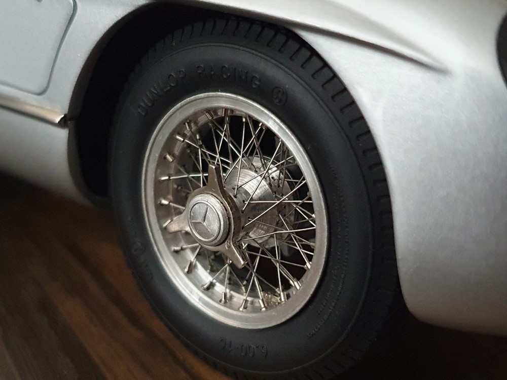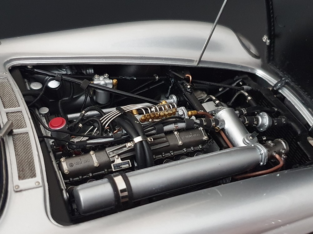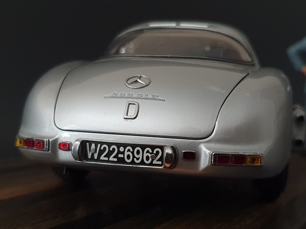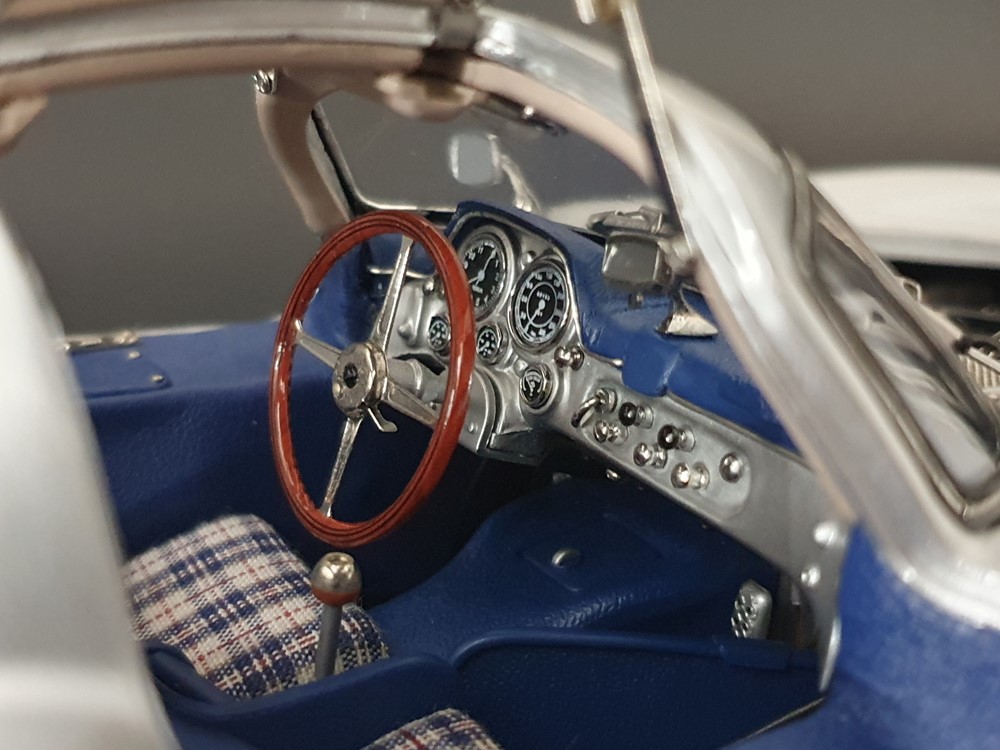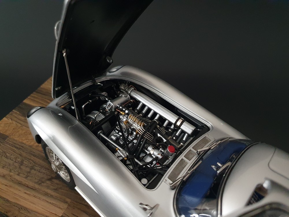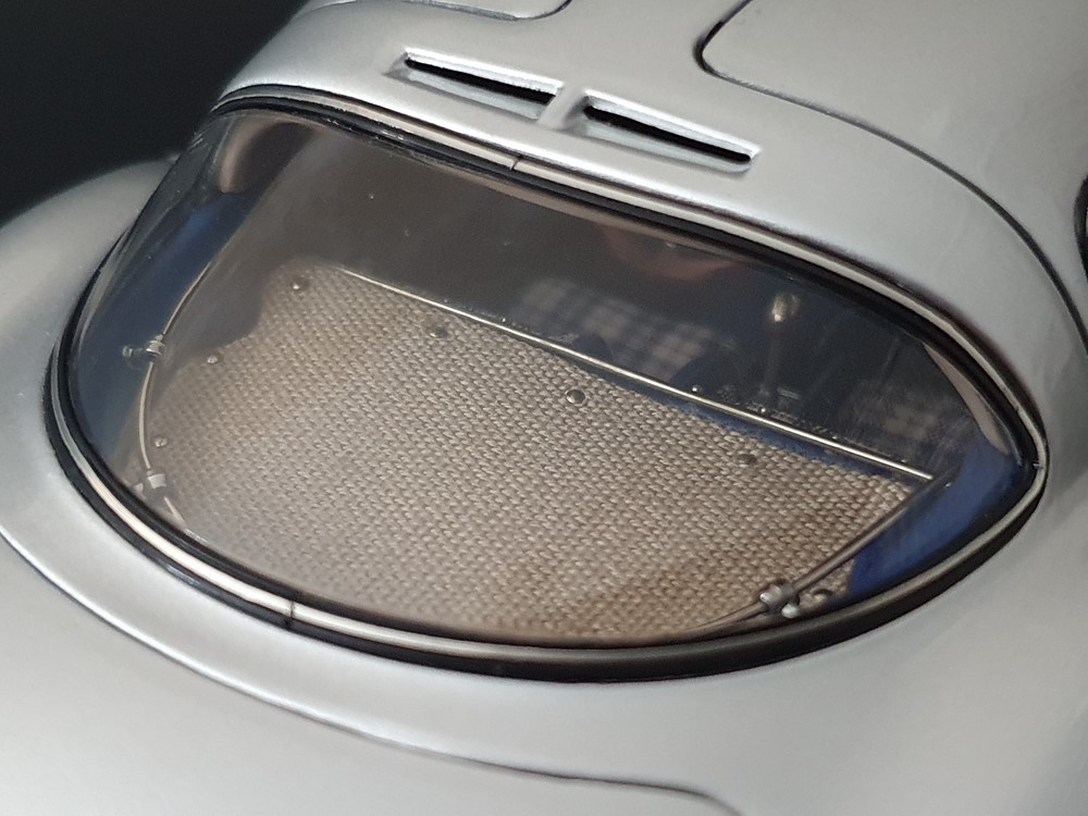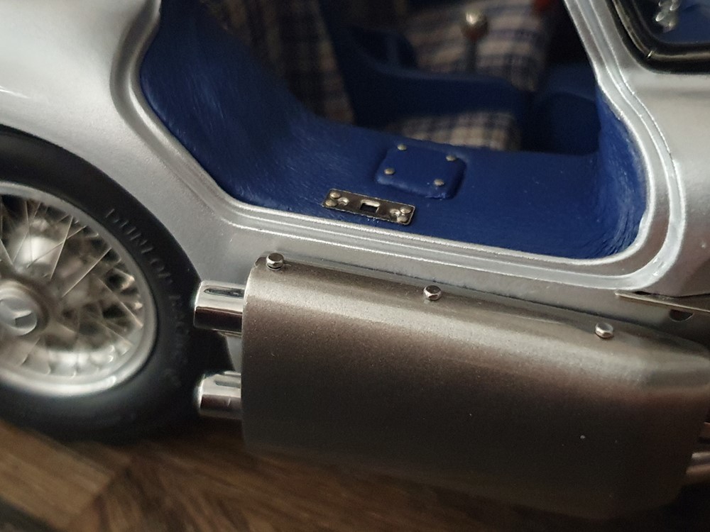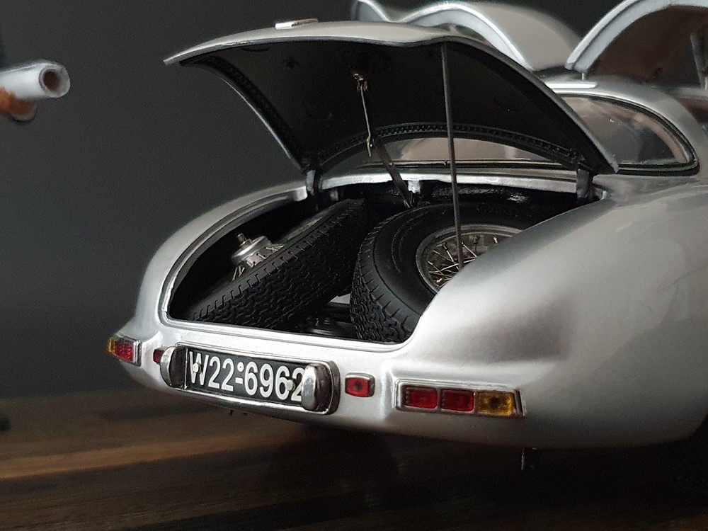 Дизайн этого купе напоминает кабину самолета. Сиденья обтянуты клетчатой тканью, как и в оригинале, салон обтянут синей кожей. Кабина укомплектована всеми приборами, элементами управления, переключателями и рычагами. Все точно воспроизведено как в реальном автомобиле. Внутри багажника находятся два съемных запасных колеса, имеющих разный диаметр, соответствующий диаметру передних и задних колес соответственно. Блестящие боковые трубы с навесным внешним глушителем на правом борту, изготовлены из нержавеющей стали. Крышка отверстия для обслуживания может быть снята, она удерживается на месте простым, но элегантным магнитным механизмом. Высоко детализированный и угловато установленный 8-цилиндровый рядный двигатель. Все агрегаты, трубы и кабели включены. Опорная штанга для капота двигателя рабочая. Вращающееся форточка, встроенное в боковое окно. Спицы, скрученные вручную, ниппели из нержавеющей стали и алюминиевый обод. Тонкая проволочная сетка защищает воздухозаборник двигателя. Съемные трех крылые центральные гайки и съемные колеса. Центральные гайки сконструированы таким образом, что они являются специфичными для каждой стороны (левая и правая резьба индивидуально). Точная проработка деталей задней части кузова, на которой закреплена отдельным элементом звезда Mercedes, а также обозначение типа 300 SLR и логотип D.