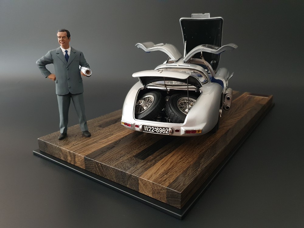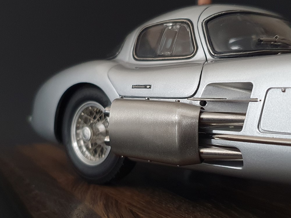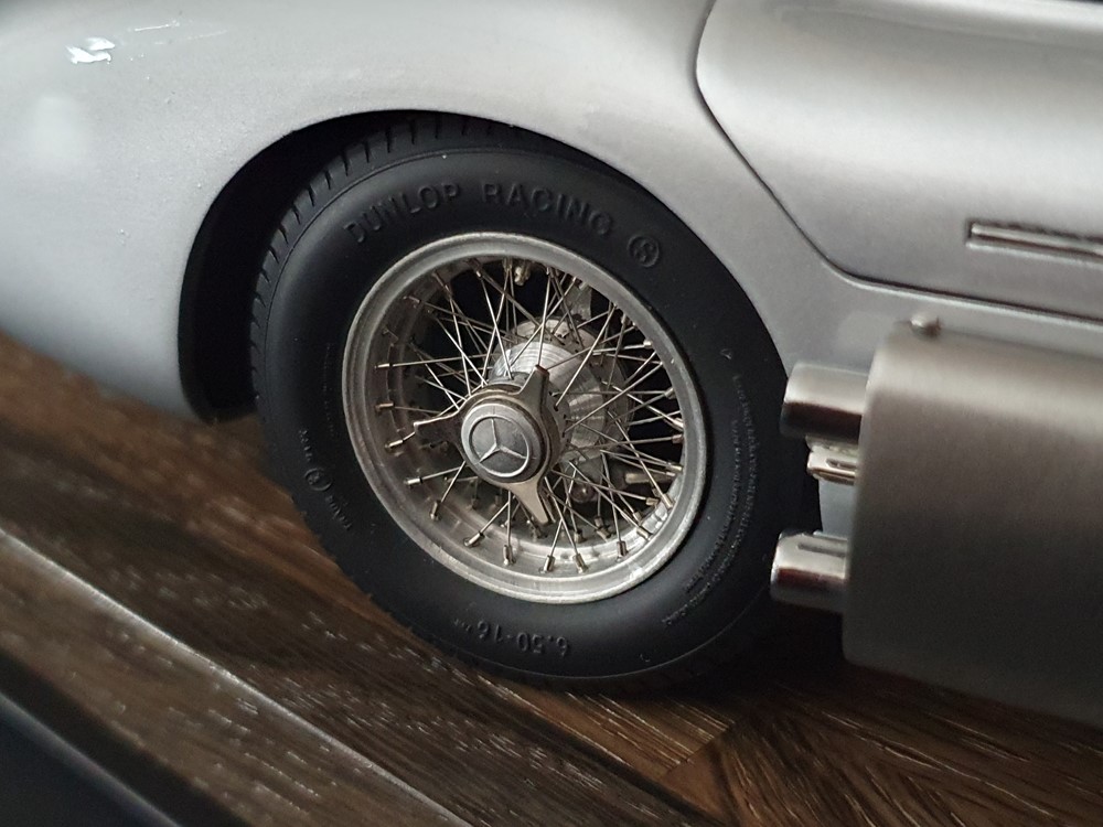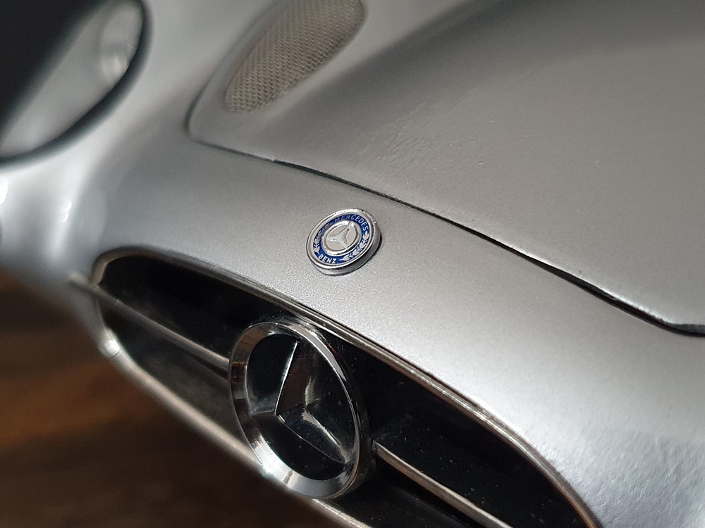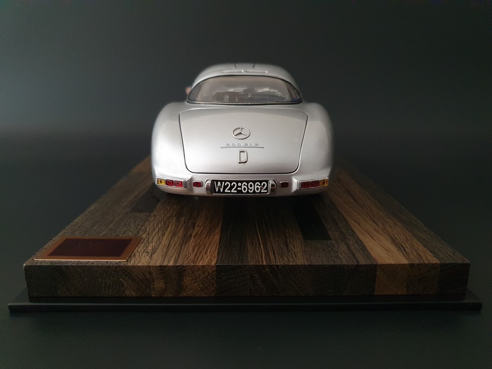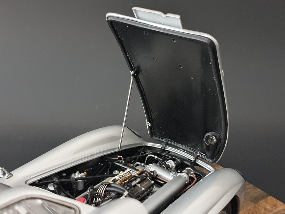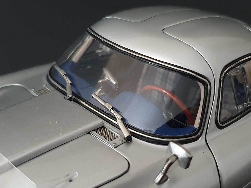 Дизайн этого купе напоминает кабину самолета. Сиденья обтянуты клетчатой тканью, как и в оригинале, салон обтянут синей кожей. Кабина укомплектована всеми приборами, элементами управления, переключателями и рычагами. Все точно воспроизведено как в реальном автомобиле. Внутри багажника находятся два съемных запасных колеса, имеющих разный диаметр, соответствующий диаметру передних и задних колес соответственно. Блестящие боковые трубы с навесным внешним глушителем на правом борту, изготовлены из нержавеющей стали. Крышка отверстия для обслуживания может быть снята, она удерживается на месте простым, но элегантным магнитным механизмом. Высоко детализированный и угловато установленный 8-цилиндровый рядный двигатель. Все агрегаты, трубы и кабели включены. Опорная штанга для капота двигателя рабочая. Вращающееся форточка, встроенное в боковое окно. Спицы, скрученные вручную, ниппели из нержавеющей стали и алюминиевый обод. Тонкая проволочная сетка защищает воздухозаборник двигателя. Съемные трех крылые центральные гайки и съемные колеса. Центральные гайки сконструированы таким образом, что они являются специфичными для каждой стороны (левая и правая резьба индивидуально). Точная проработка деталей задней части кузова, на которой закреплена отдельным элементом звезда Mercedes, а также обозначение типа 300 SLR и логотип D.