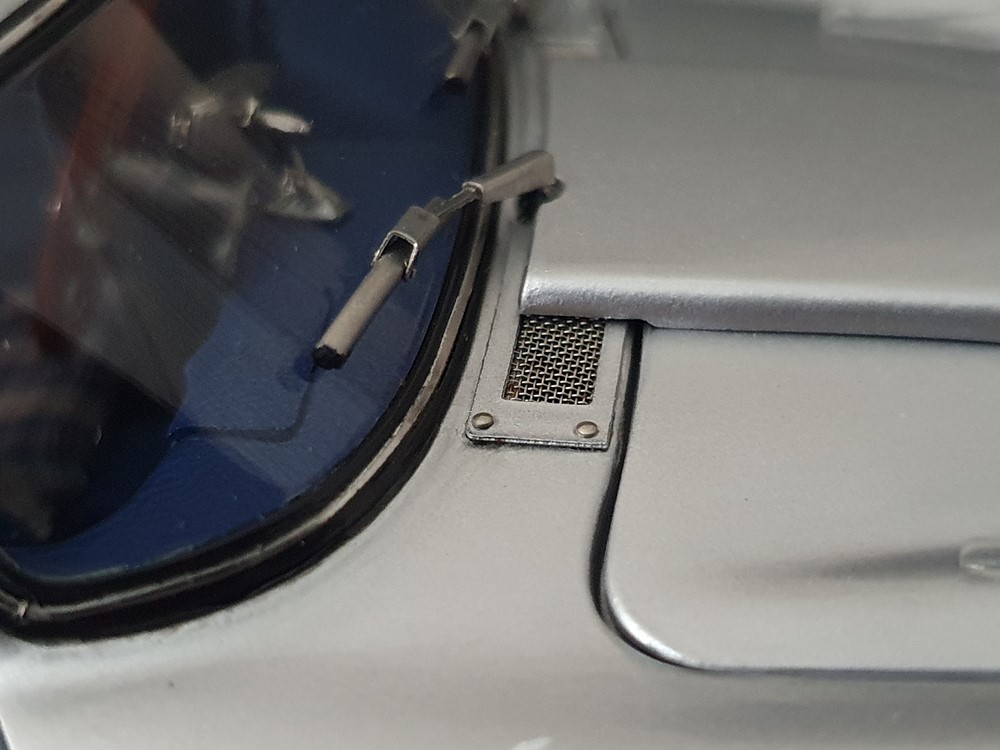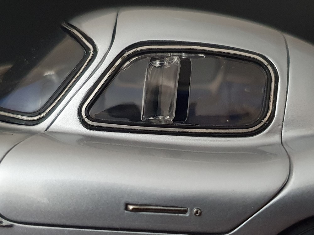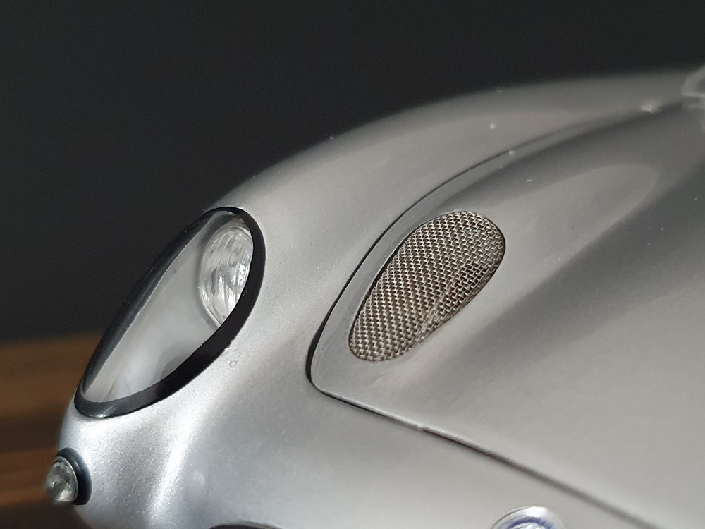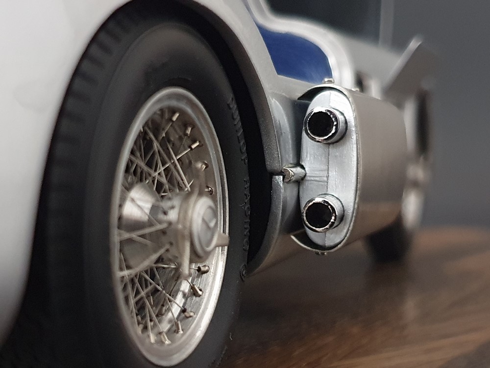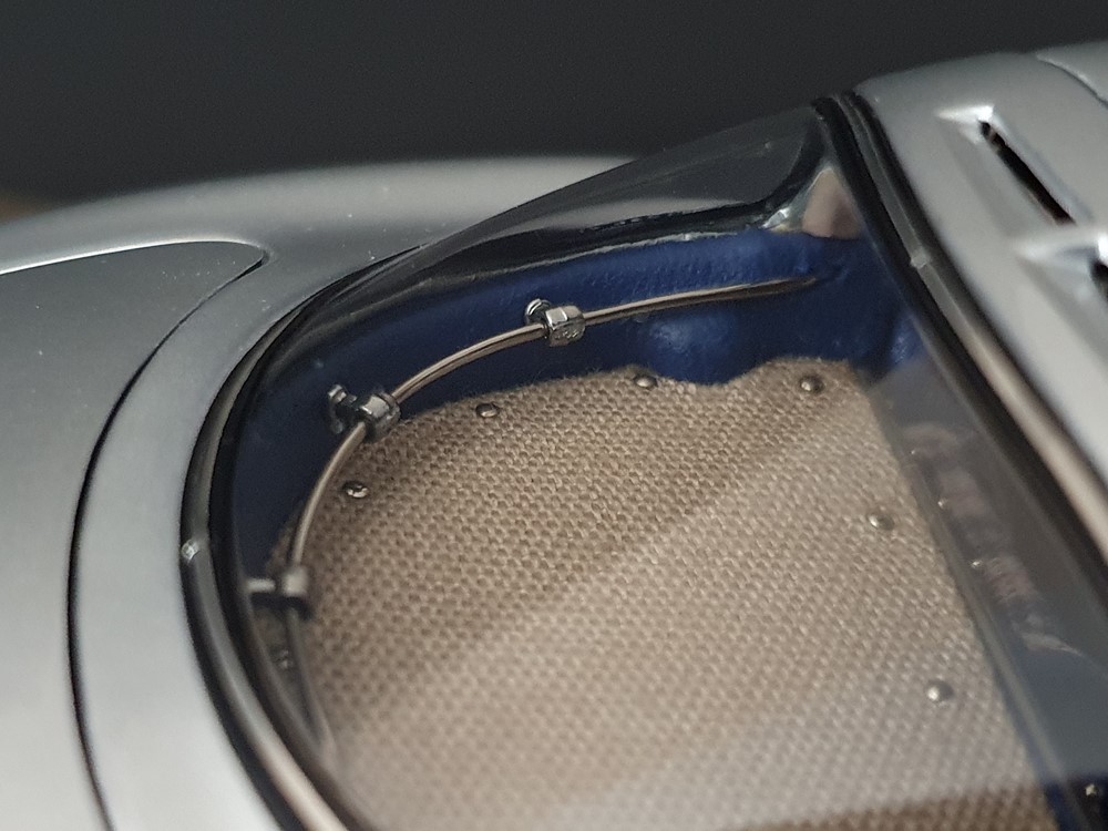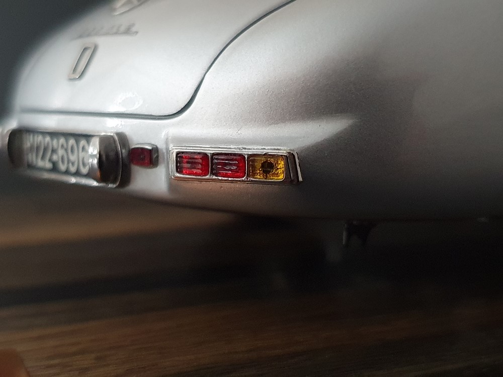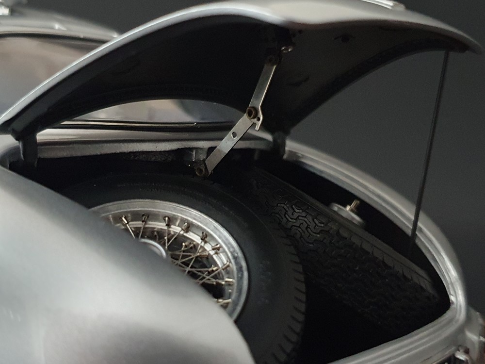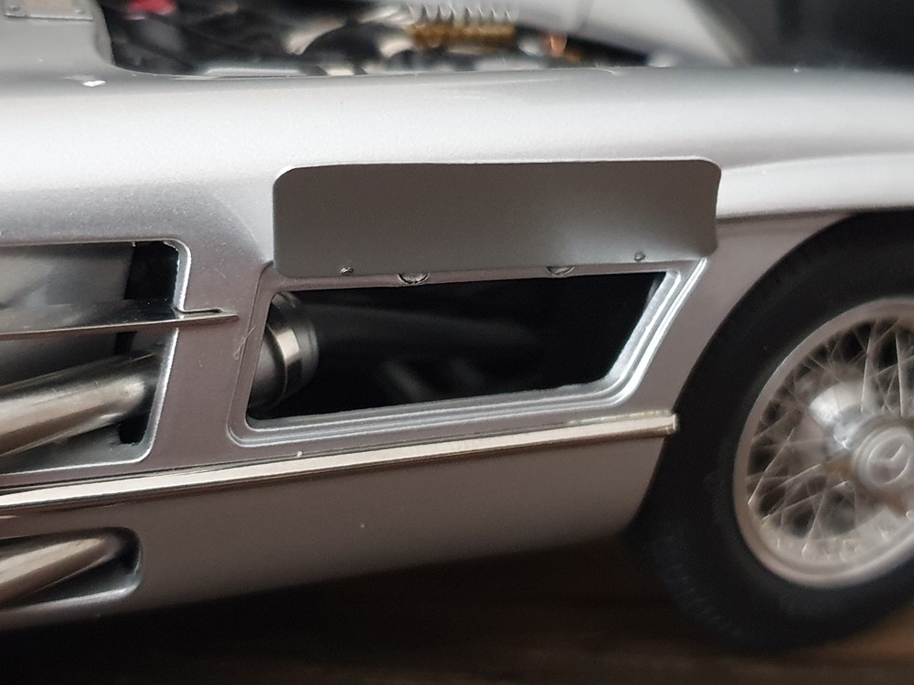 Дизайн этого купе напоминает кабину самолета. Сиденья обтянуты клетчатой тканью, как и в оригинале, салон обтянут синей кожей. Кабина укомплектована всеми приборами, элементами управления, переключателями и рычагами. Все точно воспроизведено как в реальном автомобиле. Внутри багажника находятся два съемных запасных колеса, имеющих разный диаметр, соответствующий диаметру передних и задних колес соответственно. Блестящие боковые трубы с навесным внешним глушителем на правом борту, изготовлены из нержавеющей стали. Крышка отверстия для обслуживания может быть снята, она удерживается на месте простым, но элегантным магнитным механизмом. Высоко детализированный и угловато установленный 8-цилиндровый рядный двигатель. Все агрегаты, трубы и кабели включены. Опорная штанга для капота двигателя рабочая. Вращающееся форточка, встроенное в боковое окно. Спицы, скрученные вручную, ниппели из нержавеющей стали и алюминиевый обод. Тонкая проволочная сетка защищает воздухозаборник двигателя. Съемные трех крылые центральные гайки и съемные колеса. Центральные гайки сконструированы таким образом, что они являются специфичными для каждой стороны (левая и правая резьба индивидуально). Точная проработка деталей задней части кузова, на которой закреплена отдельным элементом звезда Mercedes, а также обозначение типа 300 SLR и логотип D.