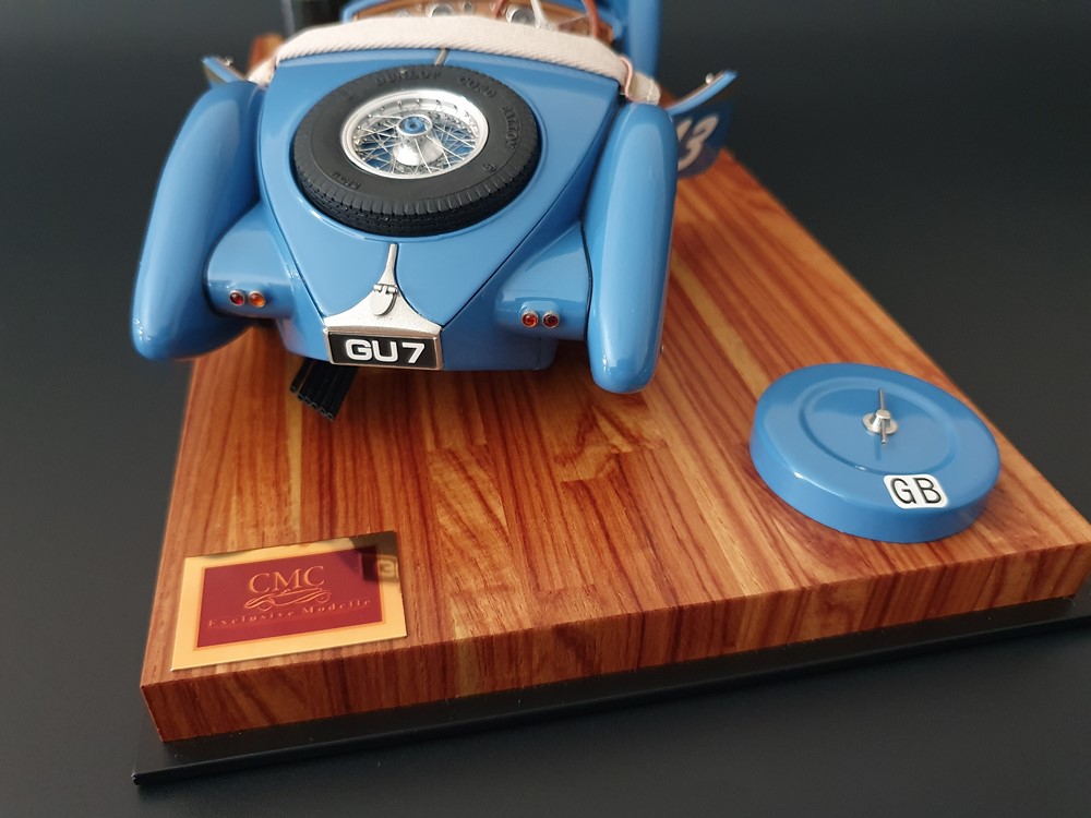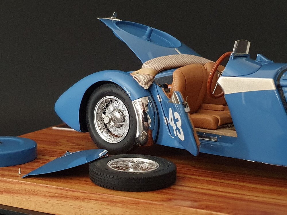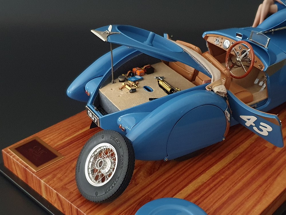 Так что Bugatti 57 SC Corsica быстро переоборудовали в гоночную версию для подобных гонок. Предстоящая работа не была слишком сложной. Ярко-голубой цвет кузова и обращенное к водителю ветровое стекло с одной стороны вместе с запасным колесом, встроенным в крышку багажника, и стартовый номер 43 на дверях особенно подчеркивали спортивный характер.