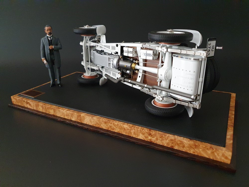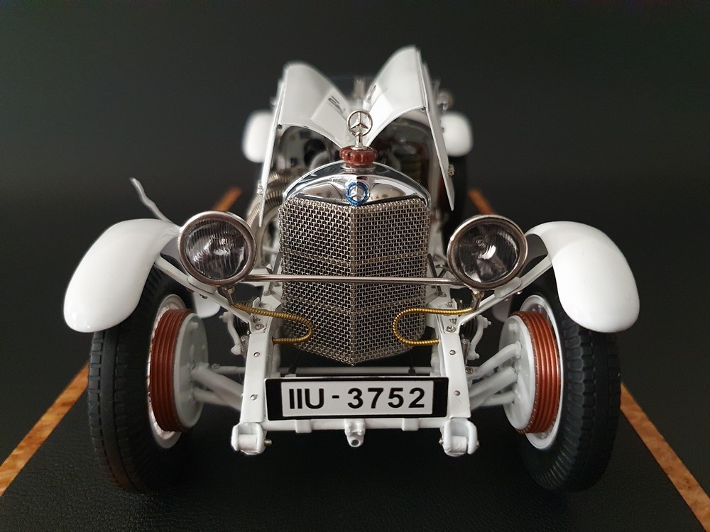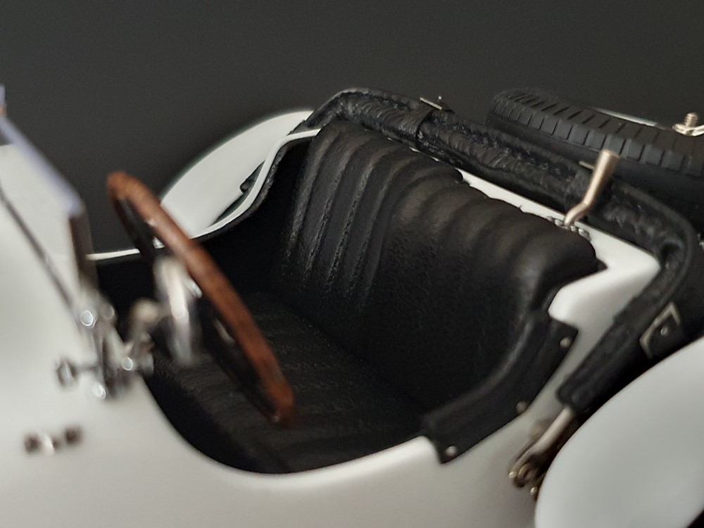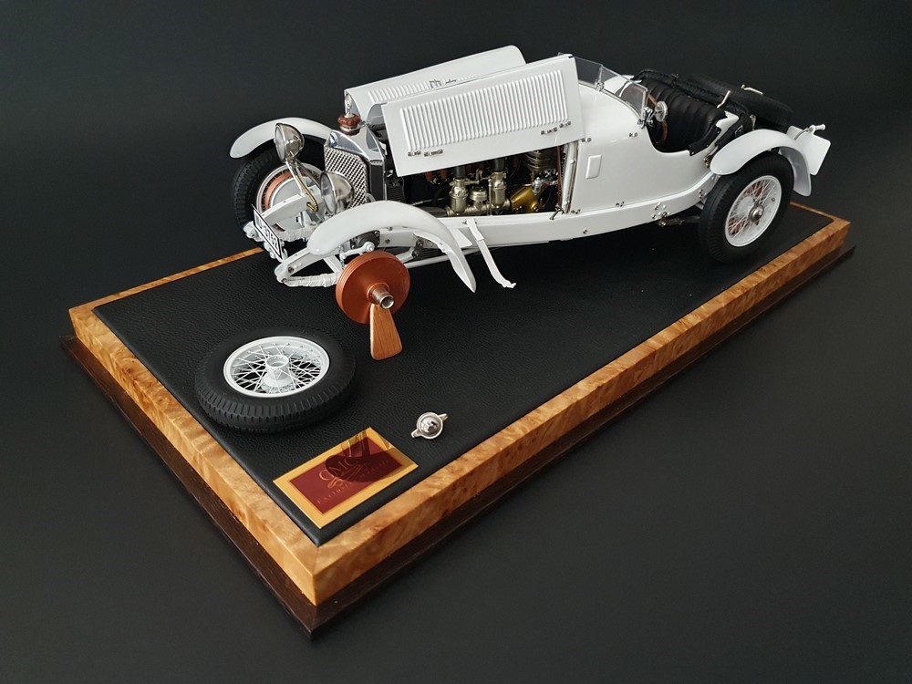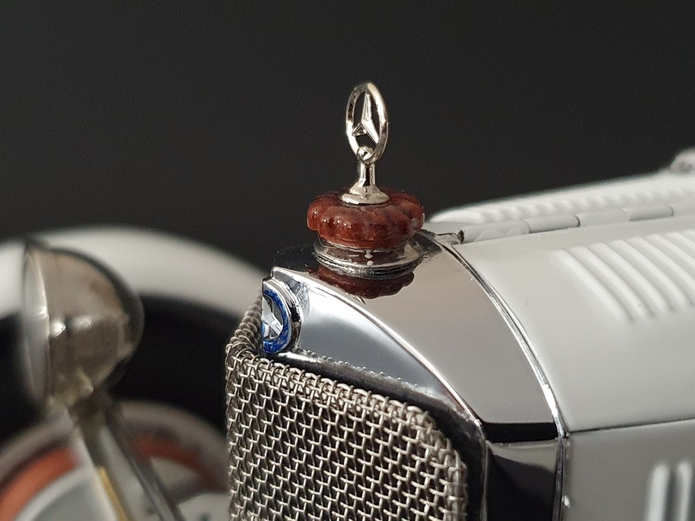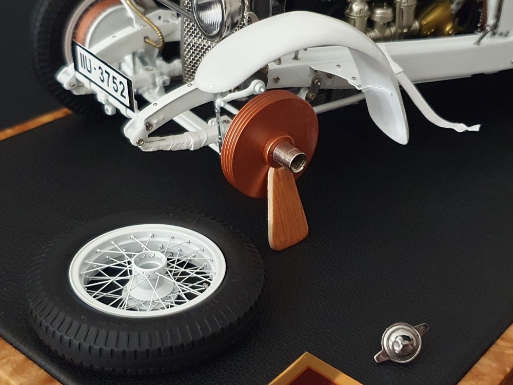 Аутентично воспроизведенный и точно масштабированный кузов автомобиля. Точная копия легкой стальной рамы с оригинальной схемой отверстий. Металлическая решетка охладителя с защитой от камней. Двухстворчатый капот двигателя, открывающийся с правой и левой стороны и фиксируемый кожаным ремнем. Функциональные петли капота двигателя, скрученные пружинами. Яркая миниатюризация 6-цилиндрового рядного двигателя со всеми агрегатами, трубопроводами и кабелями. Правосторонние выхлопные трубы из гибких металлорукавов. Мастерски изготовленные спицевые колеса с алюминиевыми ободами и спицами из нержавеющей стали, скрепленными вручную