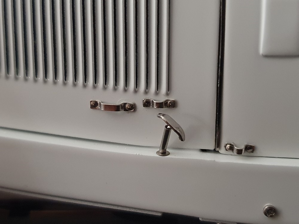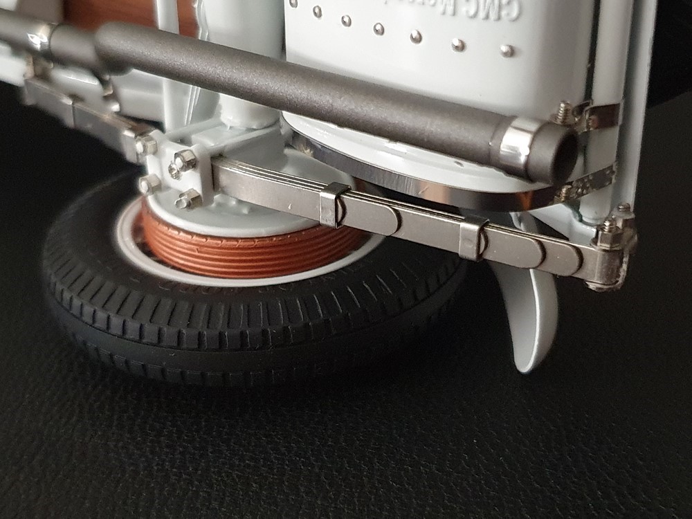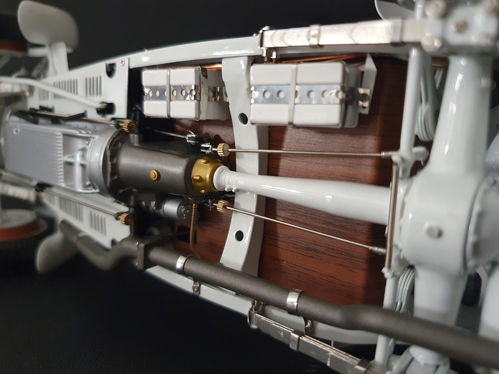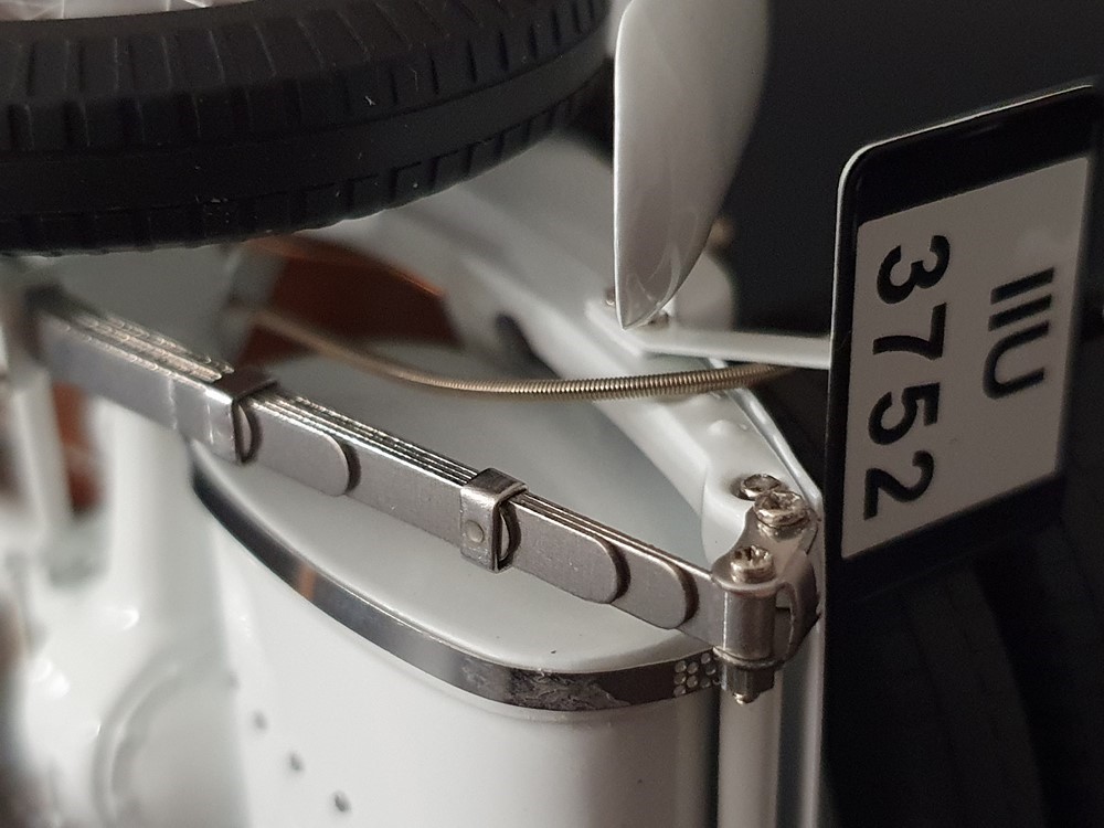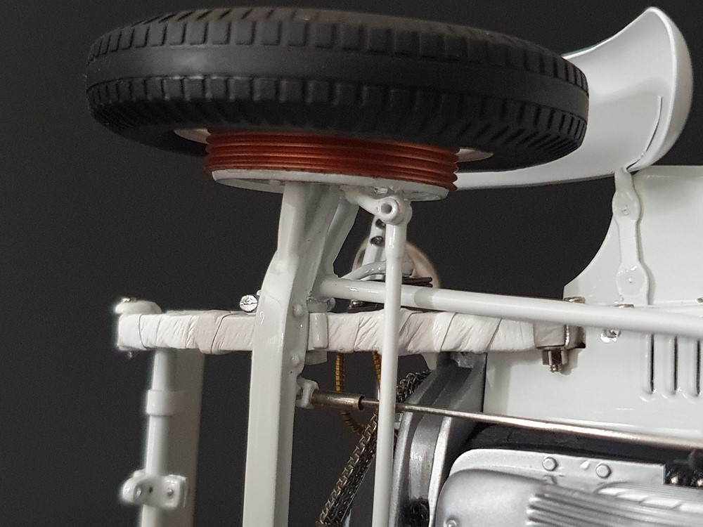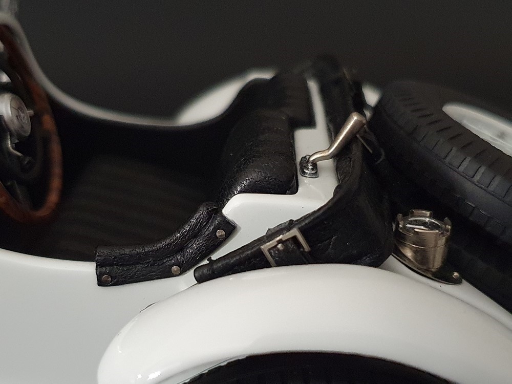 Аутентично воспроизведенный и точно масштабированный кузов автомобиля. Точная копия легкой стальной рамы с оригинальной схемой отверстий. Металлическая решетка охладителя с защитой от камней. Двухстворчатый капот двигателя, открывающийся с правой и левой стороны и фиксируемый кожаным ремнем. Функциональные петли капота двигателя, скрученные пружинами. Яркая миниатюризация 6-цилиндрового рядного двигателя со всеми агрегатами, трубопроводами и кабелями. Правосторонние выхлопные трубы из гибких металлорукавов. Мастерски изготовленные спицевые колеса с алюминиевыми ободами и спицами из нержавеющей стали, скрепленными вручную