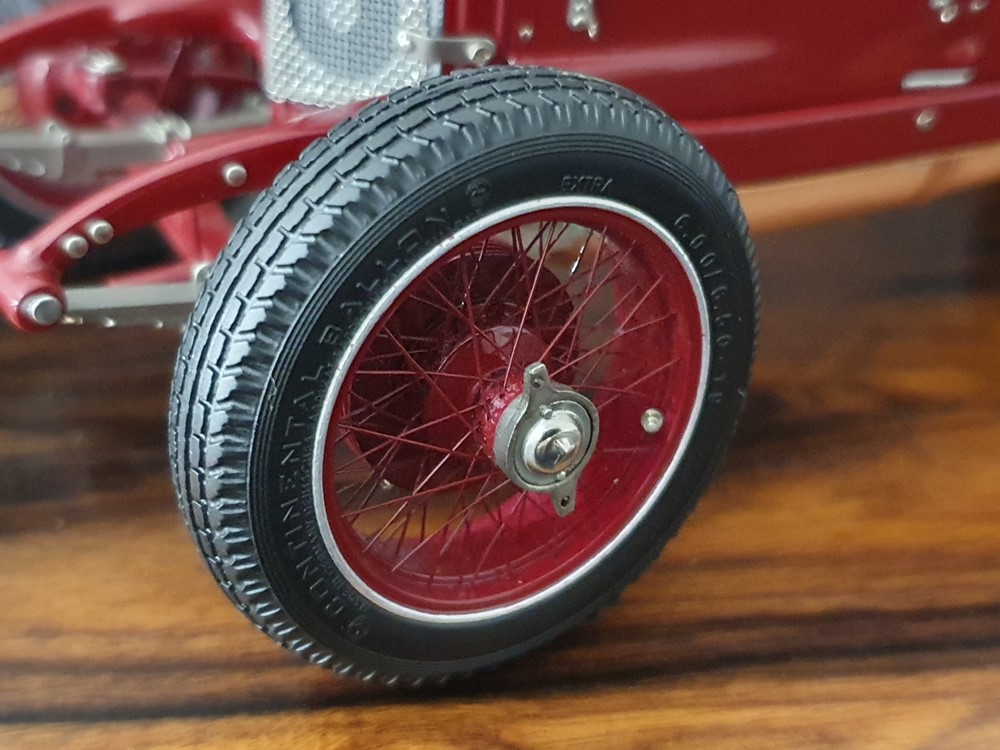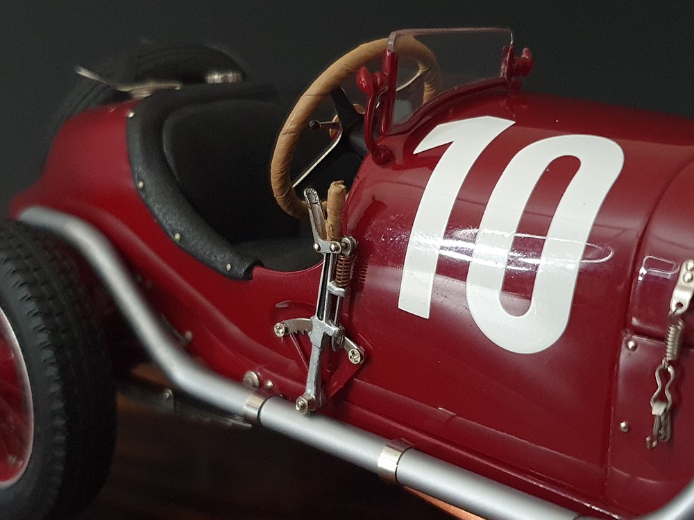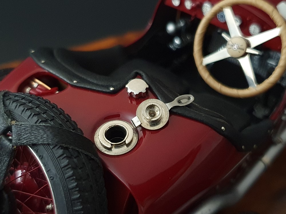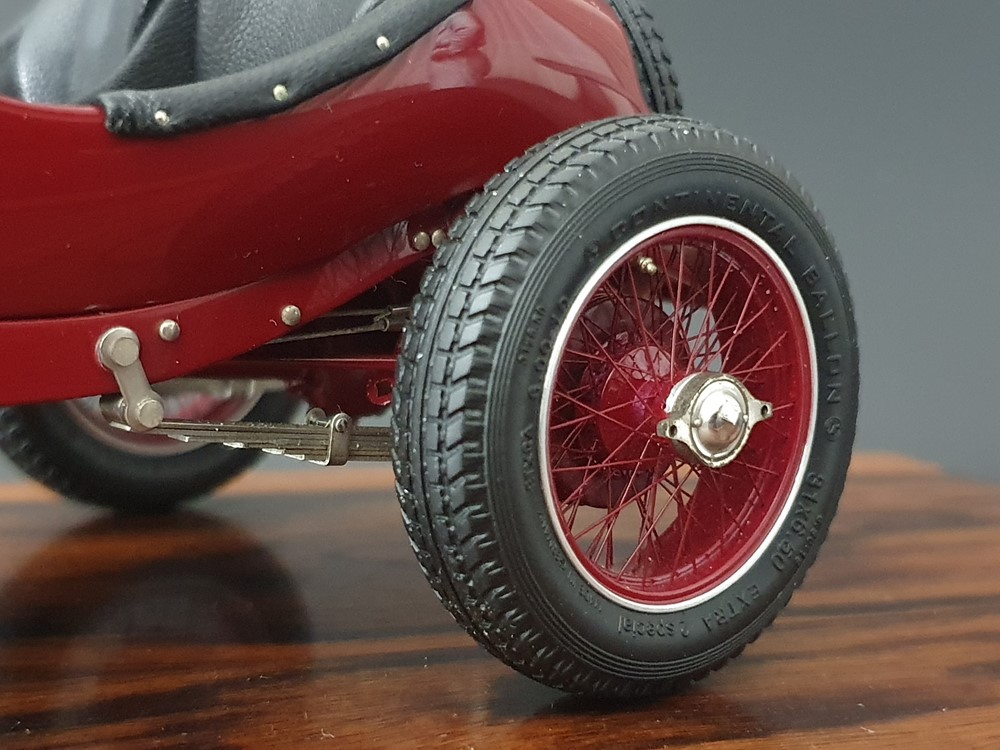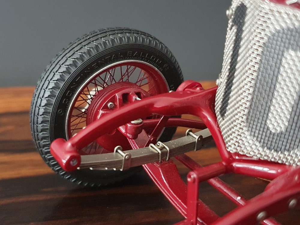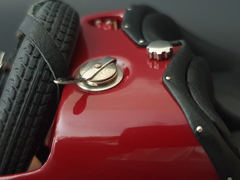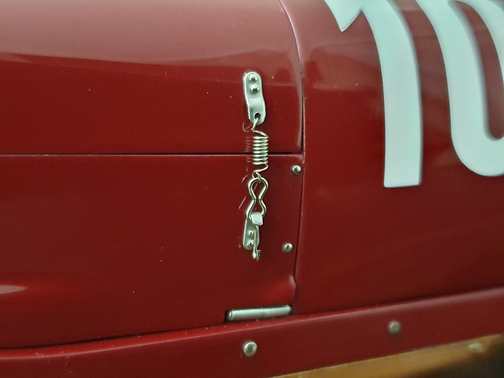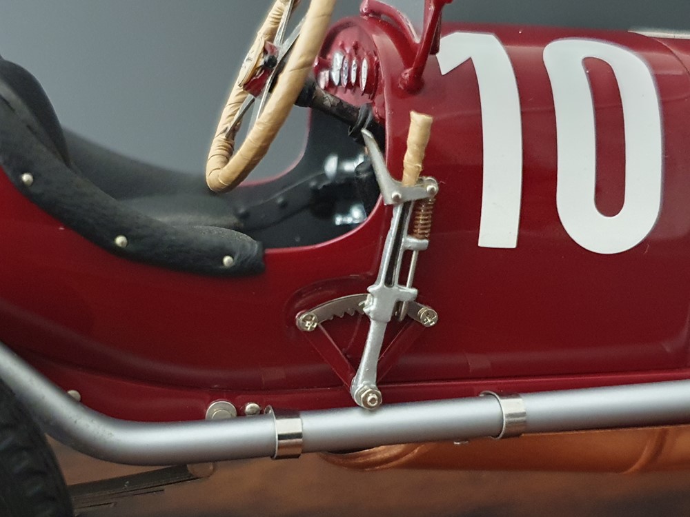 Подвижный рычаг ручного тормоза с функционирующей защелкой и обтянутой кожей ручкой. Стартовый номер 10 нанесен на окрашенный в винно-красный цвет кузов с помощью сложного процесса тампопечати. Шестислойные металлические листовые рессоры с функцией подвески на передней и задней осях. Заливная горловина бака и съемная крышка бака с байонетным замком изготовлены из нержавеющей стали. Функциональные замки капота с настоящими винтовыми пружинами.