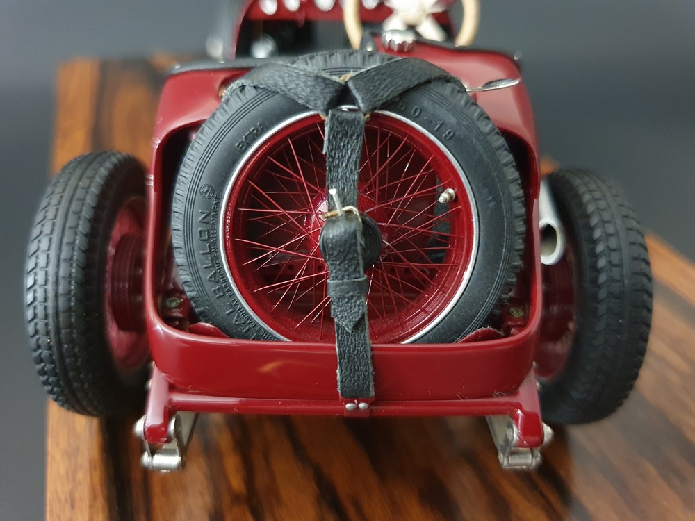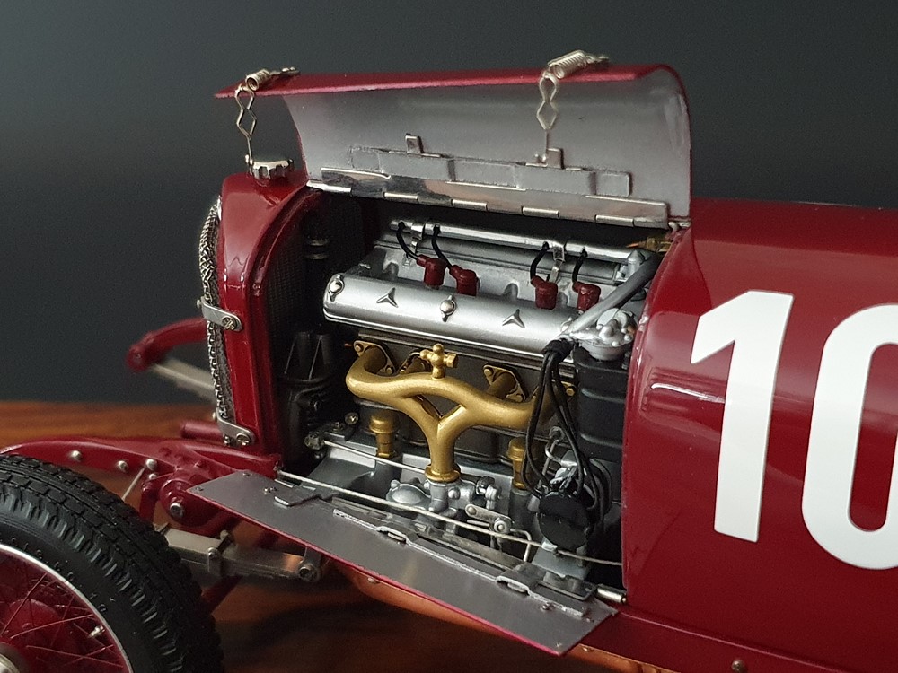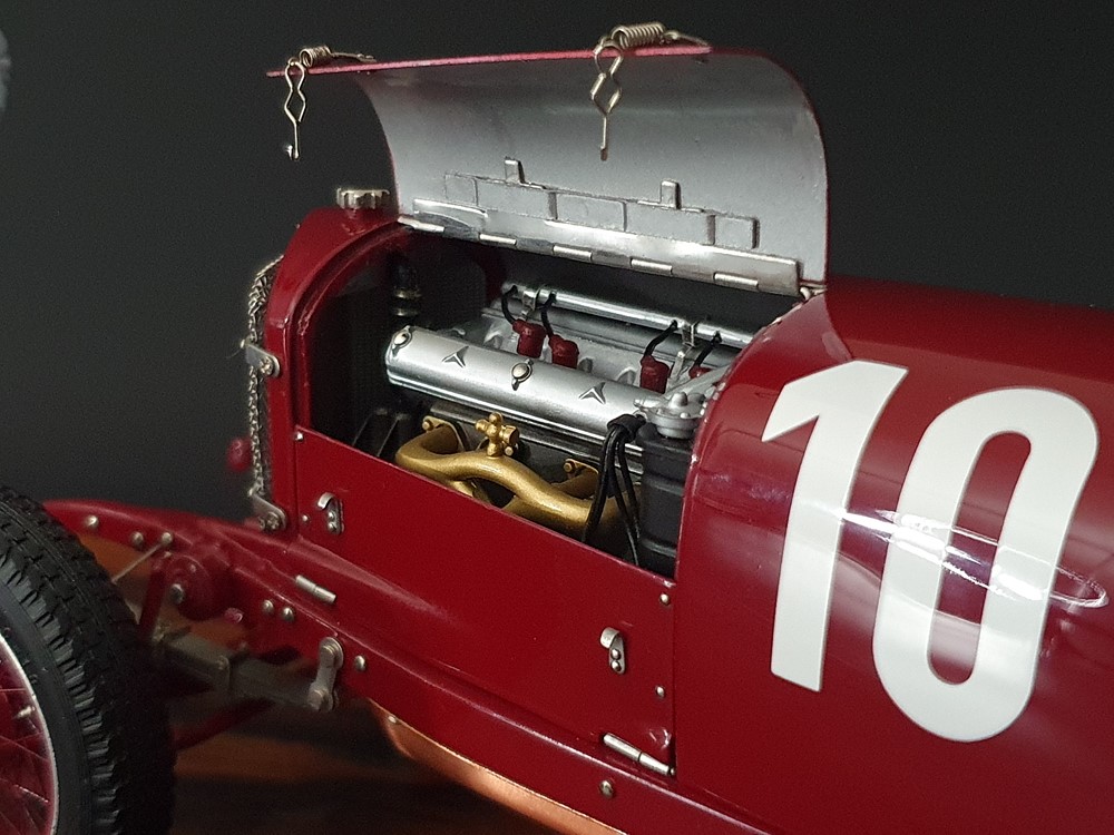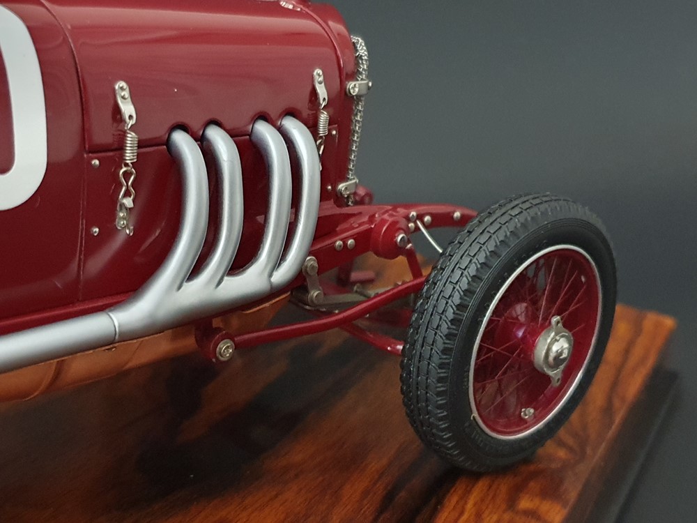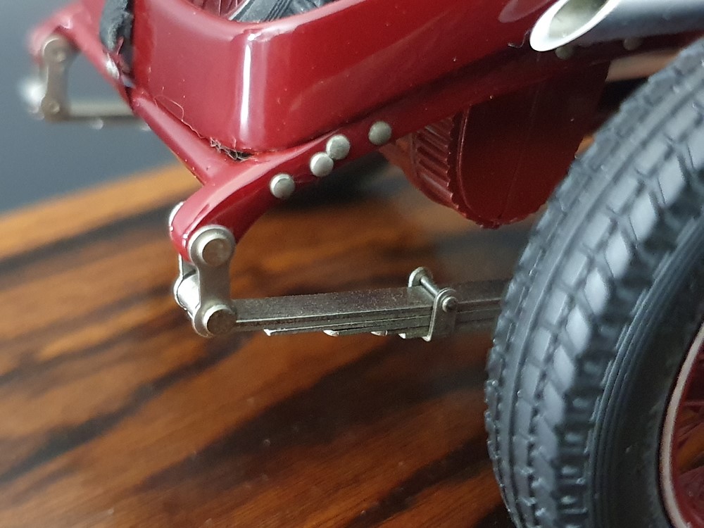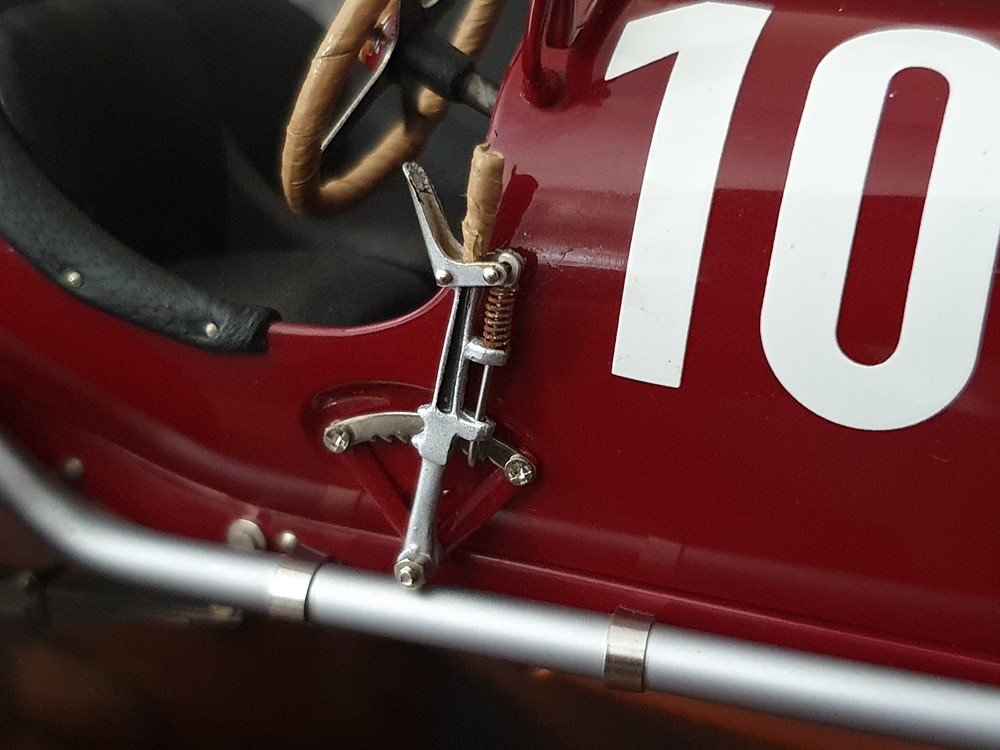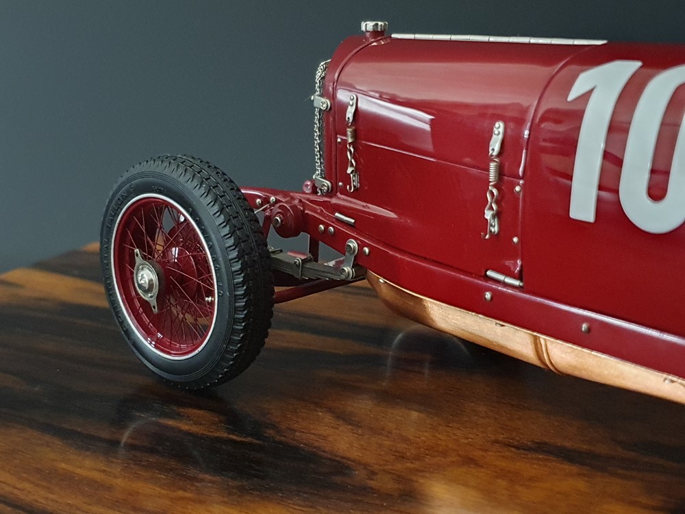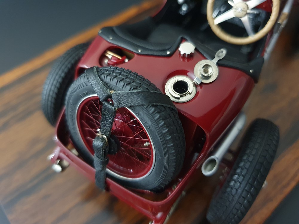 Подвижный рычаг ручного тормоза с функционирующей защелкой и обтянутой кожей ручкой. Стартовый номер 10 нанесен на окрашенный в винно-красный цвет кузов с помощью сложного процесса тампопечати. Шестислойные металлические листовые рессоры с функцией подвески на передней и задней осях. Заливная горловина бака и съемная крышка бака с байонетным замком изготовлены из нержавеющей стали. Функциональные замки капота с настоящими винтовыми пружинами.