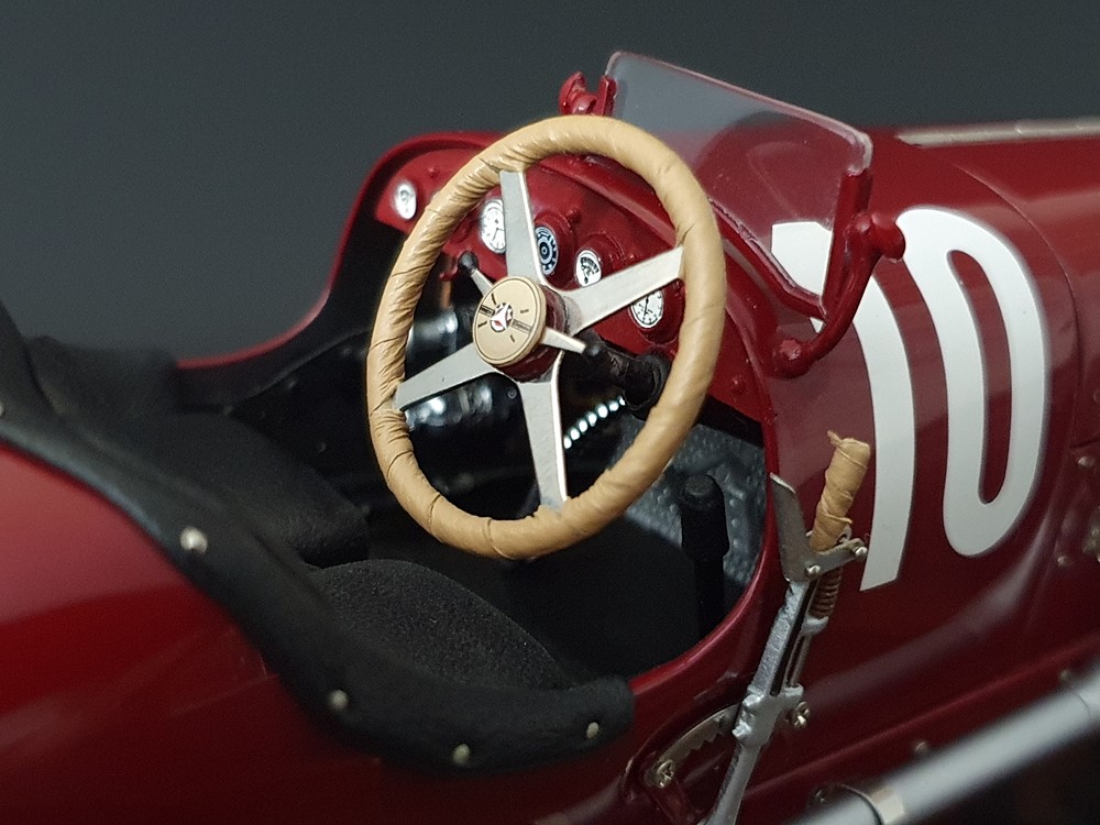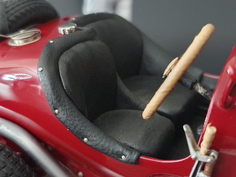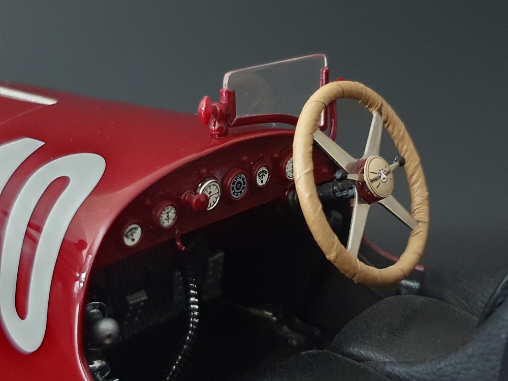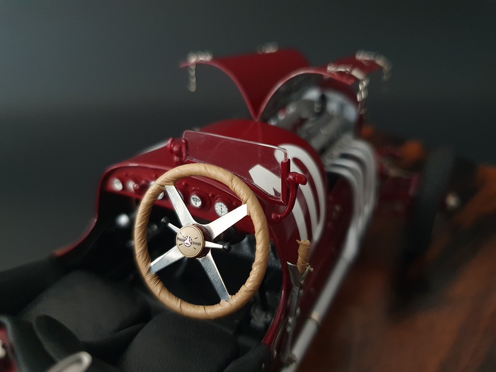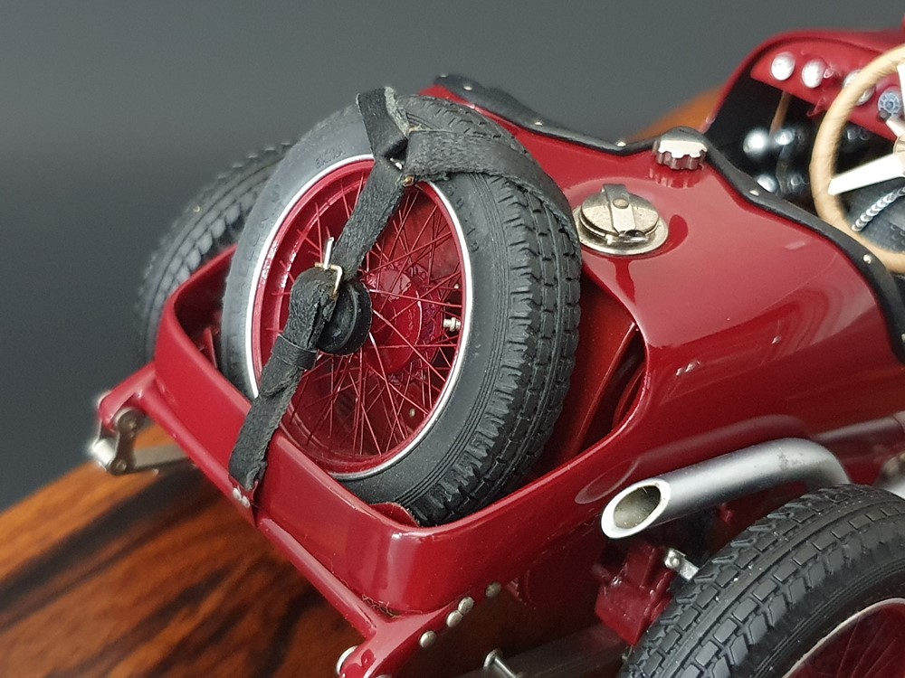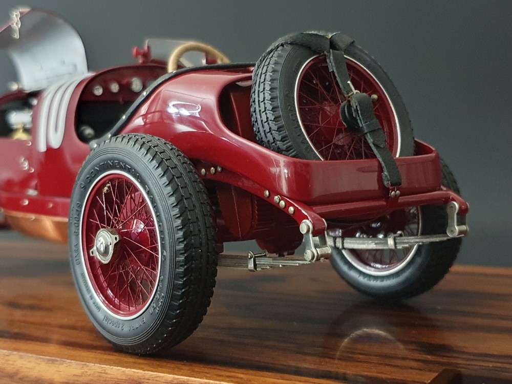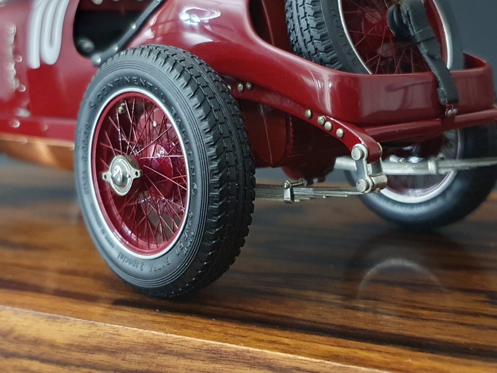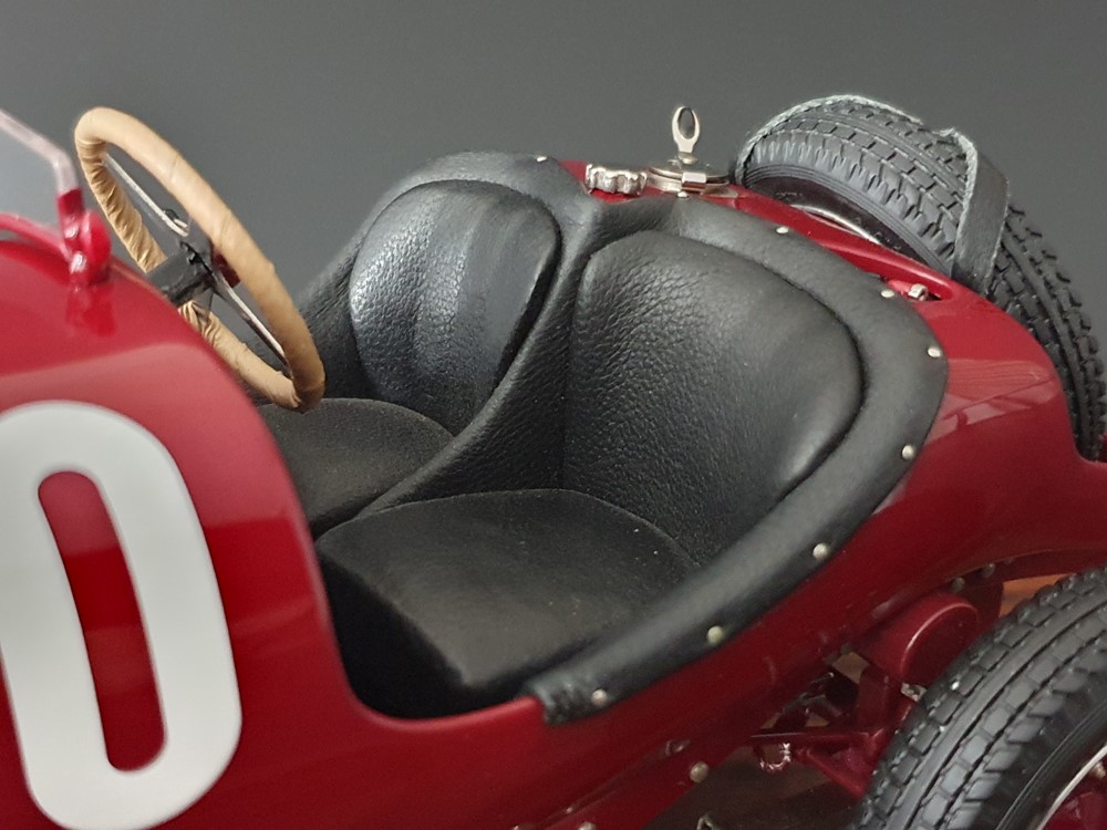Подвижный рычаг ручного тормоза с функционирующей защелкой и обтянутой кожей ручкой. Стартовый номер 10 нанесен на окрашенный в винно-красный цвет кузов с помощью сложного процесса тампопечати. Шестислойные металлические листовые рессоры с функцией подвески на передней и задней осях. Заливная горловина бака и съемная крышка бака с байонетным замком изготовлены из нержавеющей стали. Функциональные замки капота с настоящими винтовыми пружинами.