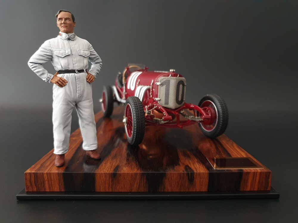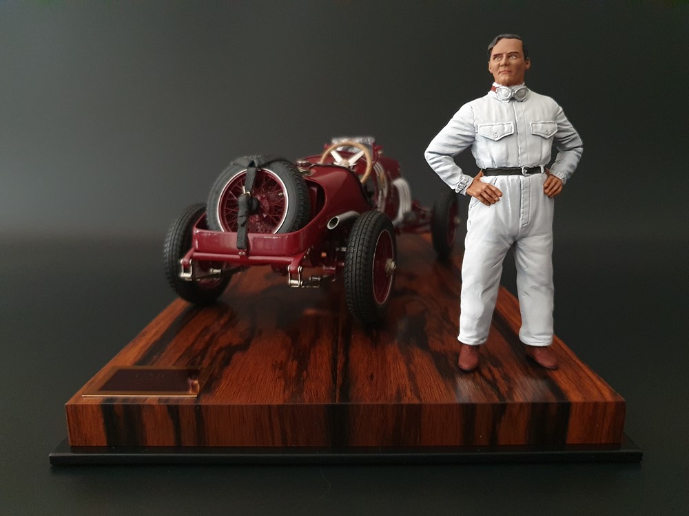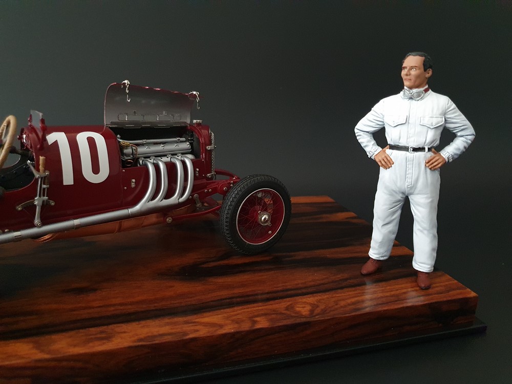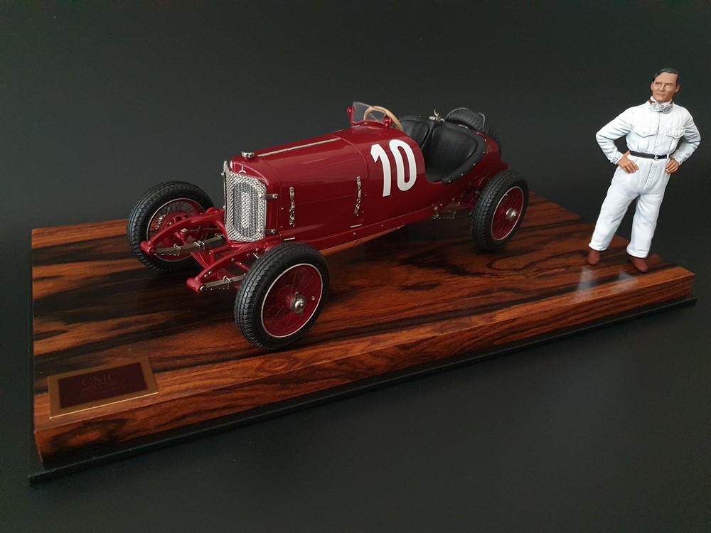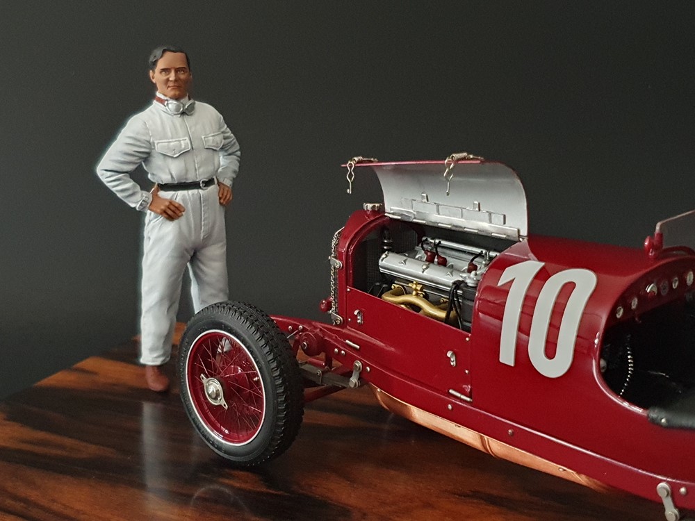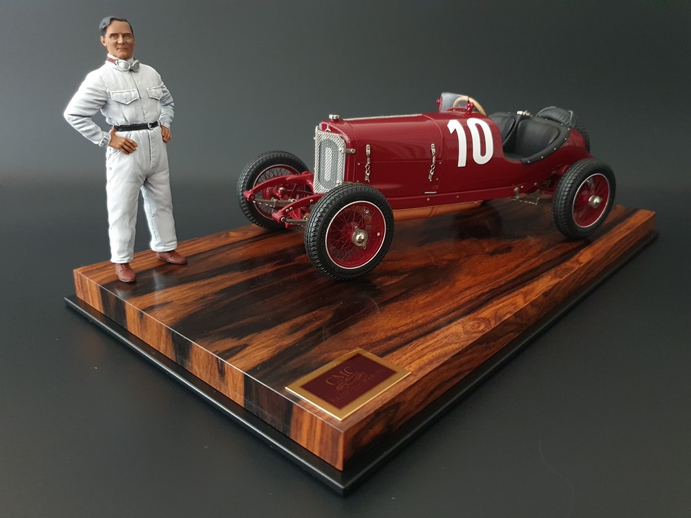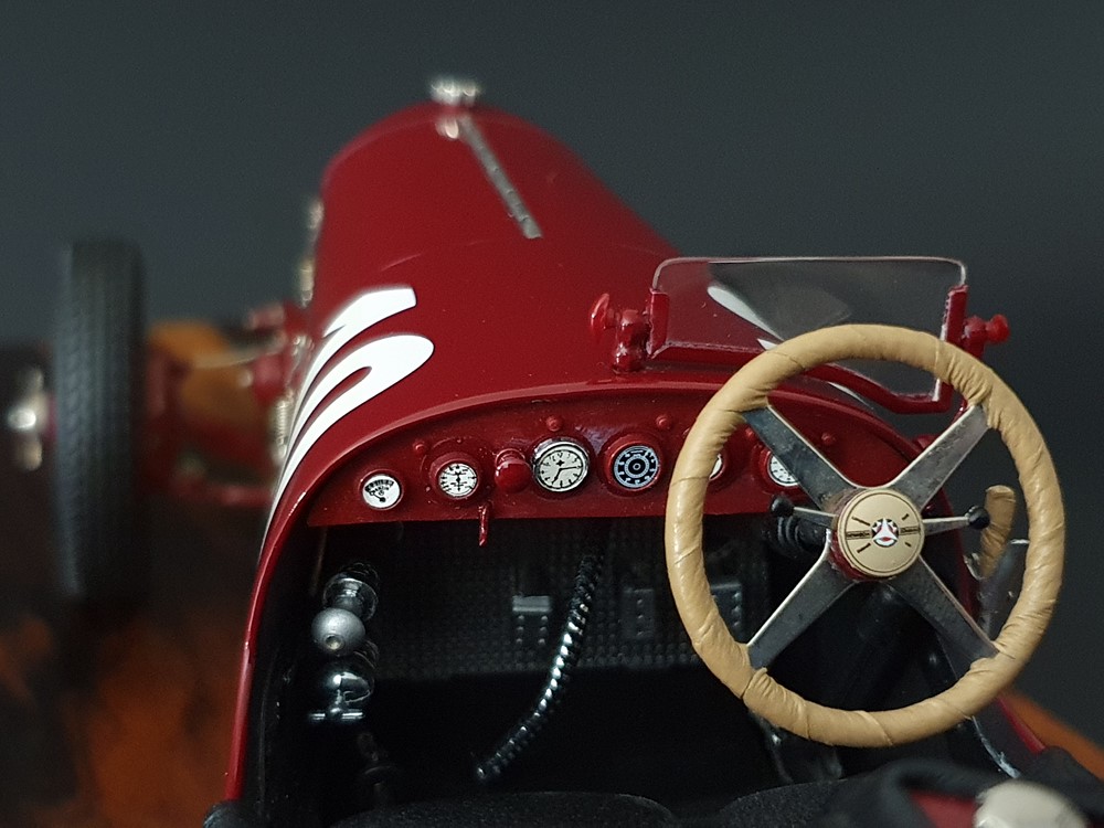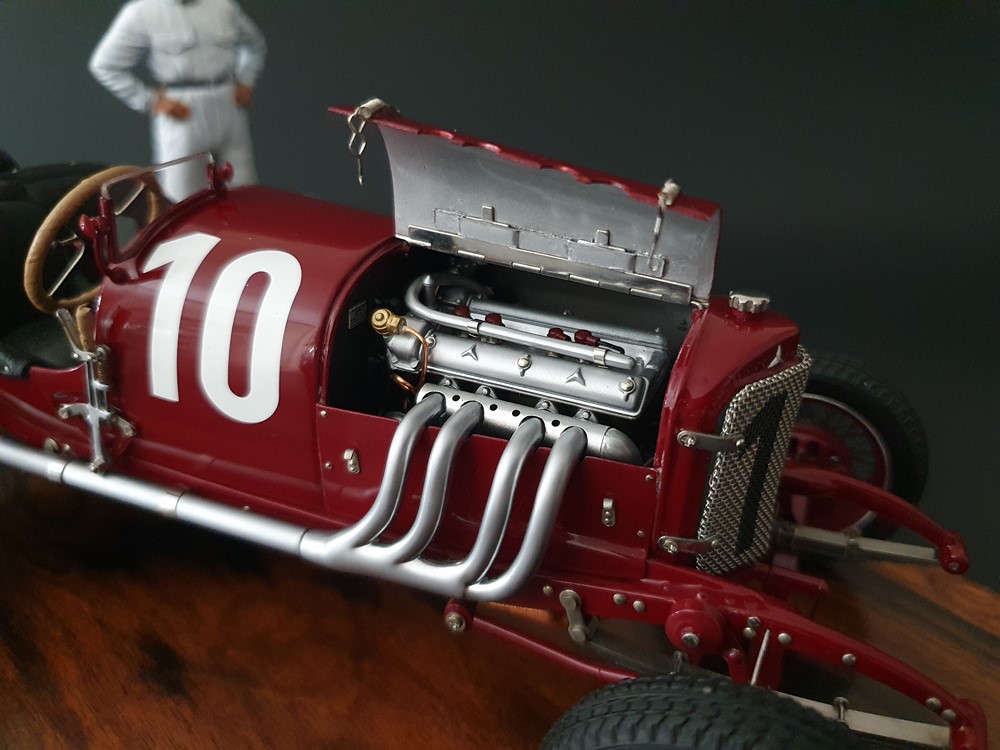 Подвижный рычаг ручного тормоза с функционирующей защелкой и обтянутой кожей ручкой. Стартовый номер 10 нанесен на окрашенный в винно-красный цвет кузов с помощью сложного процесса тампопечати. Шестислойные металлические листовые рессоры с функцией подвески на передней и задней осях. Заливная горловина бака и съемная крышка бака с байонетным замком изготовлены из нержавеющей стали. Функциональные замки капота с настоящими винтовыми пружинами.