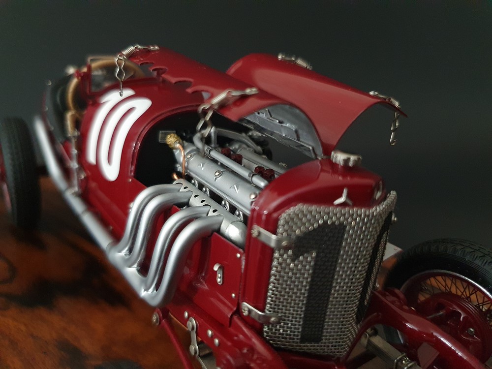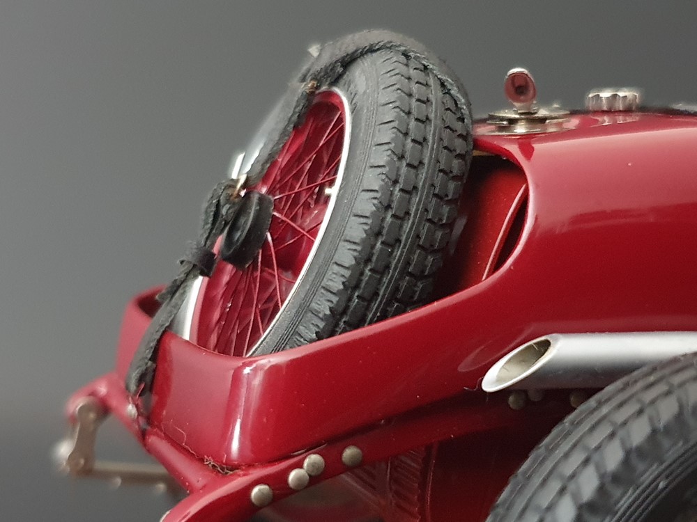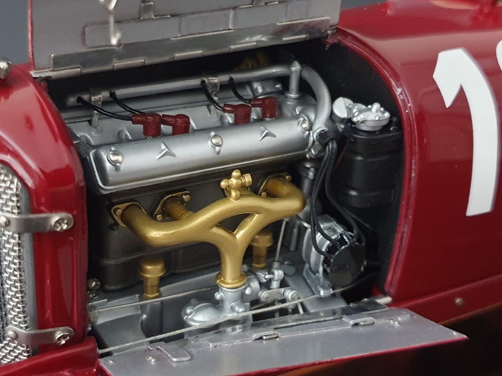 Очень подробный двигатель с проводкой, кабелями и тягами управления. Основание двигателя из медного листа. Стальные тросы тормоза для передних и задних колес. Радиатор с защитной решеткой от камней из мелкоячеистой проволочной сетки. Передние фрикционные амортизаторы с функцией
