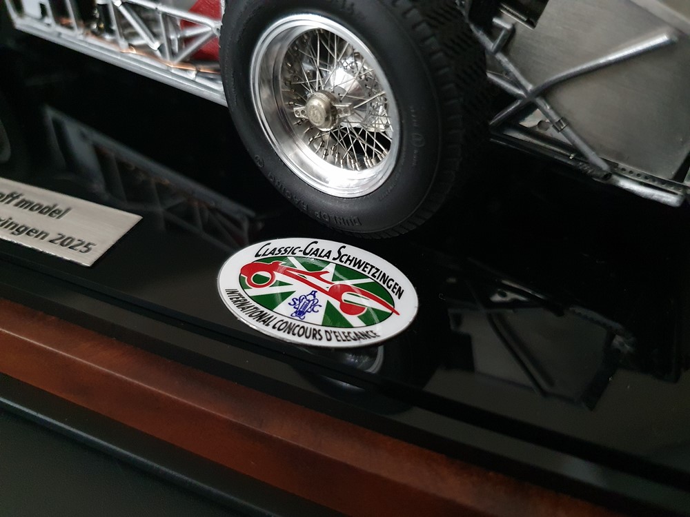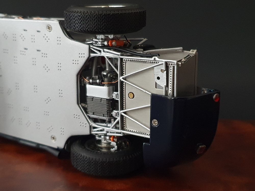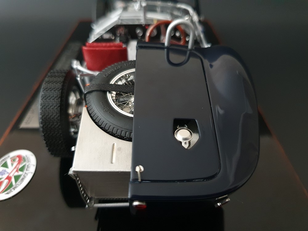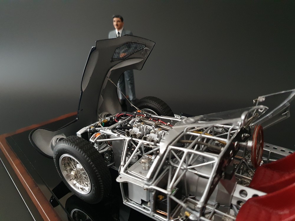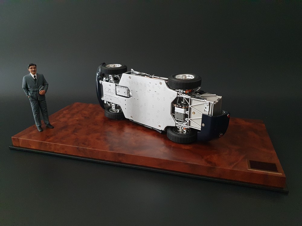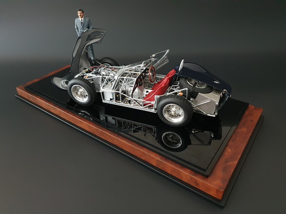 Подробное описание: Собранная вручную модель, состоящая из 1523 деталей. Верная оригиналу филигранная металлическая пространственная рама. Корпус в точном масштабе и с точными деталями. Изысканная двухцветная окраска как дань швейцарскому происхождению Gus Andrey’s. Передний откидной капот двигателя с функциональным запирающим механизмом. Высоко детализированный двигатель со всеми агрегатами, трубопроводами и кабелями. Масляный бак с подвижной крышкой. Воздухозаборник для охлаждения пола помещения, сделанный из металла. Панель приборов с подробными приборами. Гоночные сиденья с кожаной обивкой. Раздвижные двери на филигранных петлях. Съемная задняя крышка с функциональным запирающим механизмом. Металлический топливный бак с заливной горловиной и подвижной крышкой. Съемное запасное колесо, крепится кожаным ремнем. Съемные спицованные колеса на алюминиевых дисках. Спицы из нержавеющей стали, скрученные вручную. Опорную пластину можно открутить, чтобы еще лучше рассмотреть пространственную раму. Клепаные ребра жесткости, используемые для металлической плиты пола кабины. Подвеска переднего колеса — односкатная, с двумя треугольными поперечными рычагами, включая винтовые пружины и телескопические амортизаторы. Задняя ось De-Dion с поперечно установленной металлической пружиной и телескопическими амортизаторами.