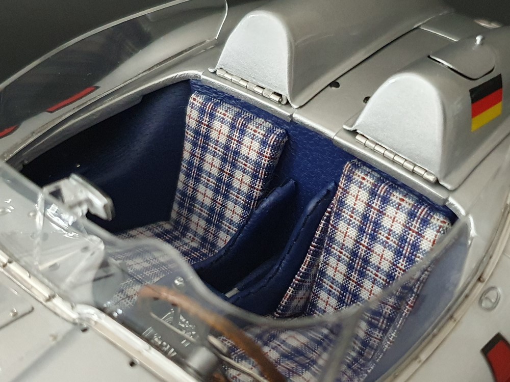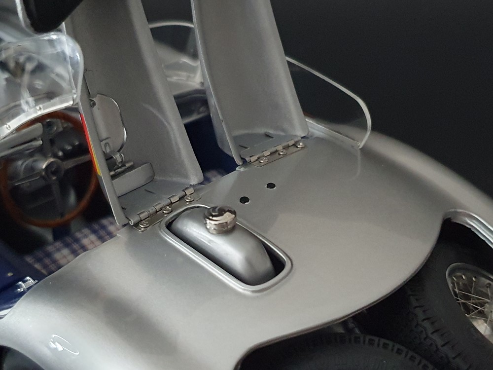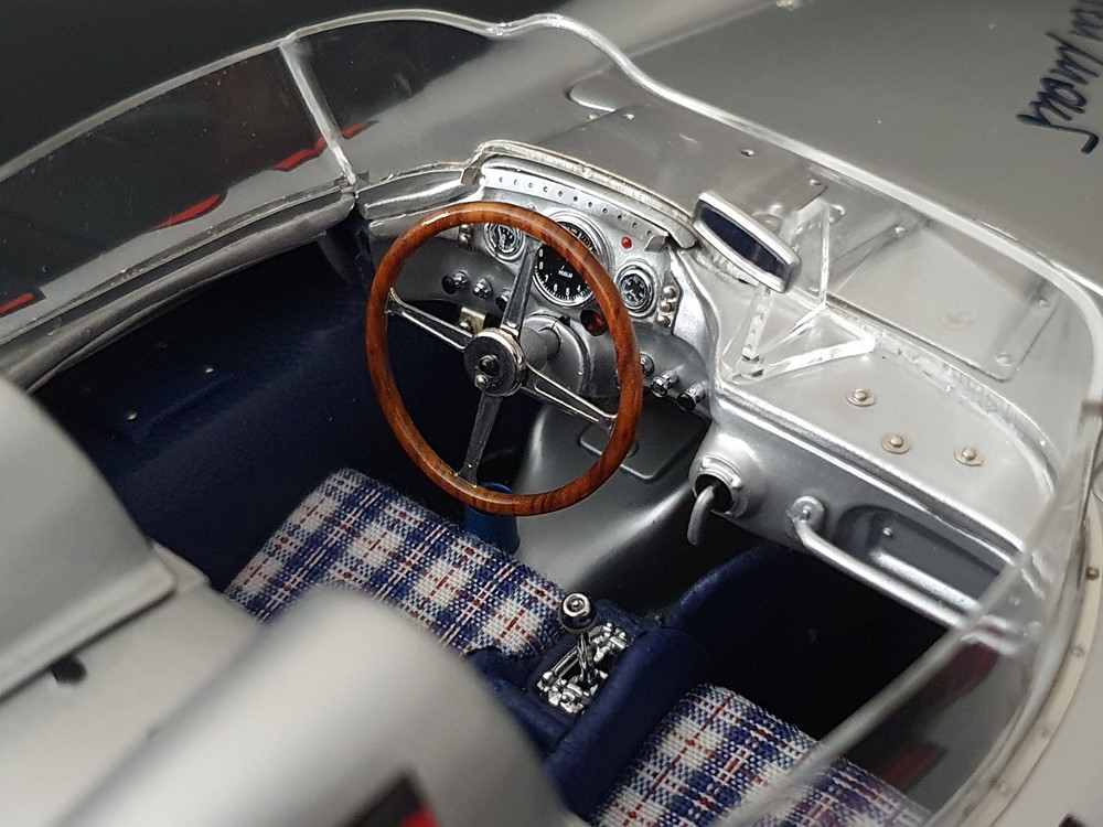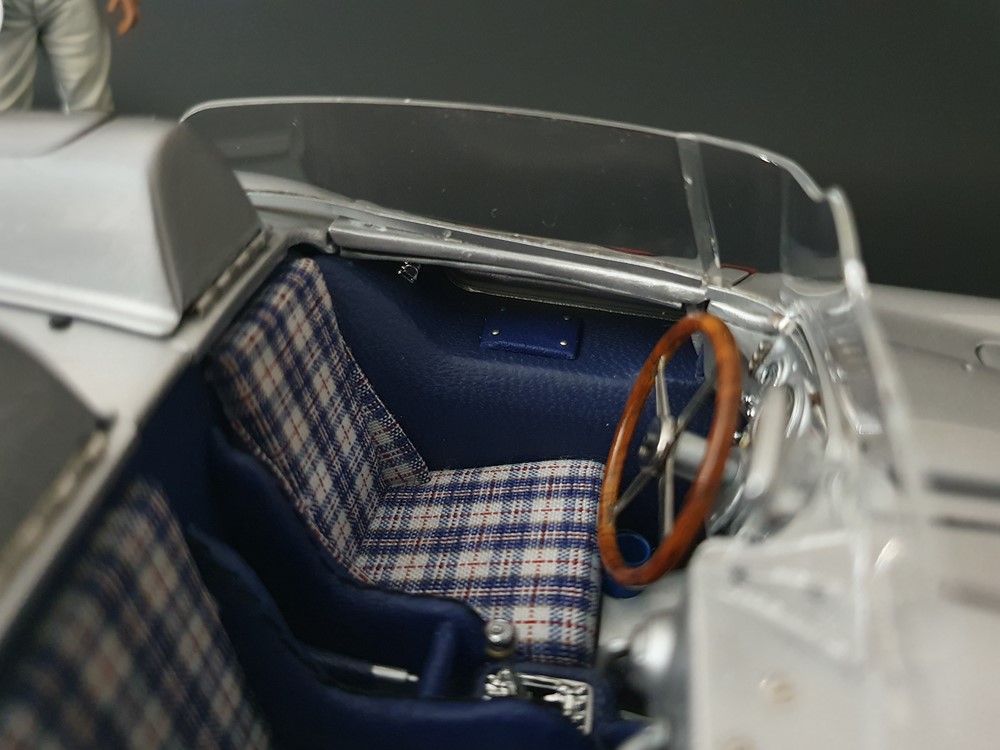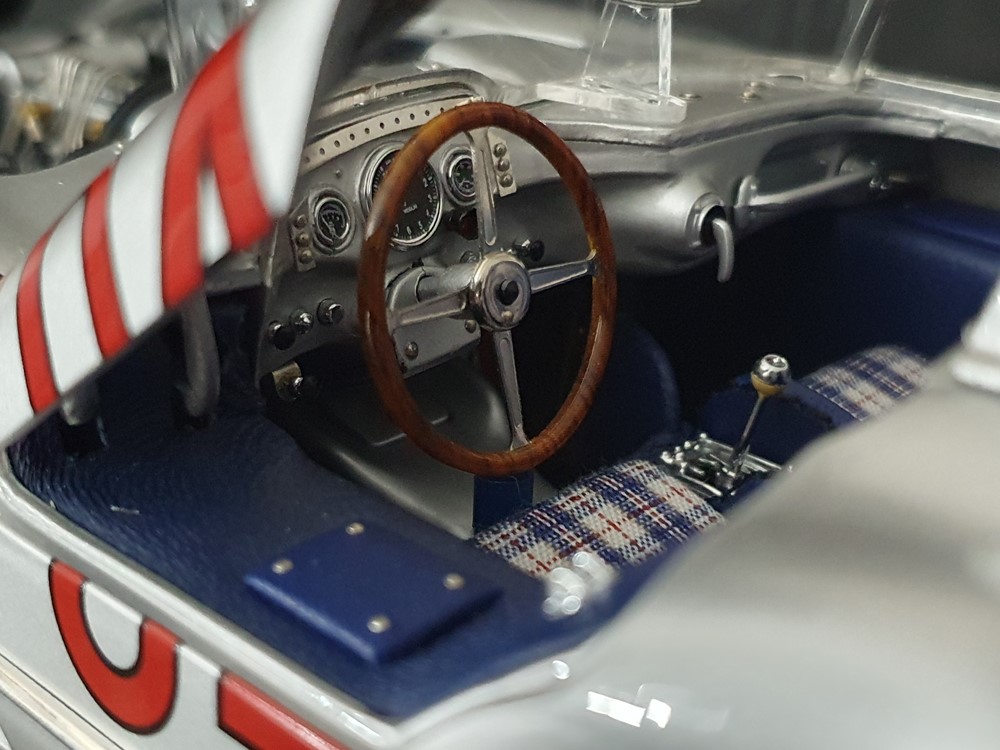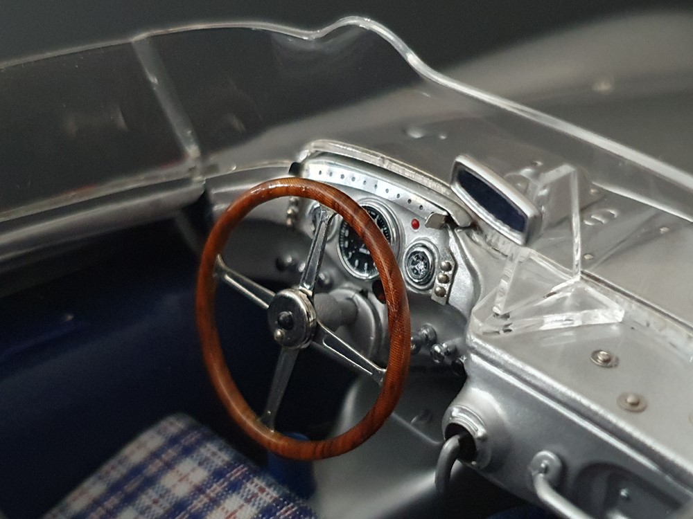 Трех спицевый руль. Салон отделан кожей, а сиденья обиты текстильной тканью. Поднимающаяся водительская дверь облегчает посадку, но для второго пилота такой «роскоши удобства» нет. Съемные передние и задние запасные колеса разных размеров. Колеса со спицами на алюминиевых ободах. Каждая спица из нержавеющей стали снабжена одним ниппелем. Колеса снимаются с помощью трехгранной стопорной гайки. Точное воспроизведение системы вентиляции кабины, ветрового стекла и зеркала заднего вида. Реалистичное отображение оригинальной приборной панели со всеми ее приборами и элементами управления. Купол подголовника соединяется с крышкой багажника. Его можно поднять целиком, чтобы получить доступ к запасному колесу. На капоте двигателя имеется опора. В куполе подголовника водителя встроен люк для доступа к топливному баку. Горловина заправочного бака снизу оснащена съемной крышкой из нержавеющей стали. Передний правый капот двигателя оснащен ажурной решеткой для радиатора и воздухозаборника двигателя. Высоко детализированная 8-цилиндровая рядная силовая установка, размещенная в угловом положении, в комплекте со всеми трубами и проводкой. Боковые выхлопные трубы изготовлены из нержавеющей стали. Передняя подвеска с внутренними барабанными тормозами. Пространственная рама с топливным баком, подвеской колес, консолью для запасного колеса и электрическими топливными насосами. Roller-Map: гениальное изобретение Дениса Дженкинсона