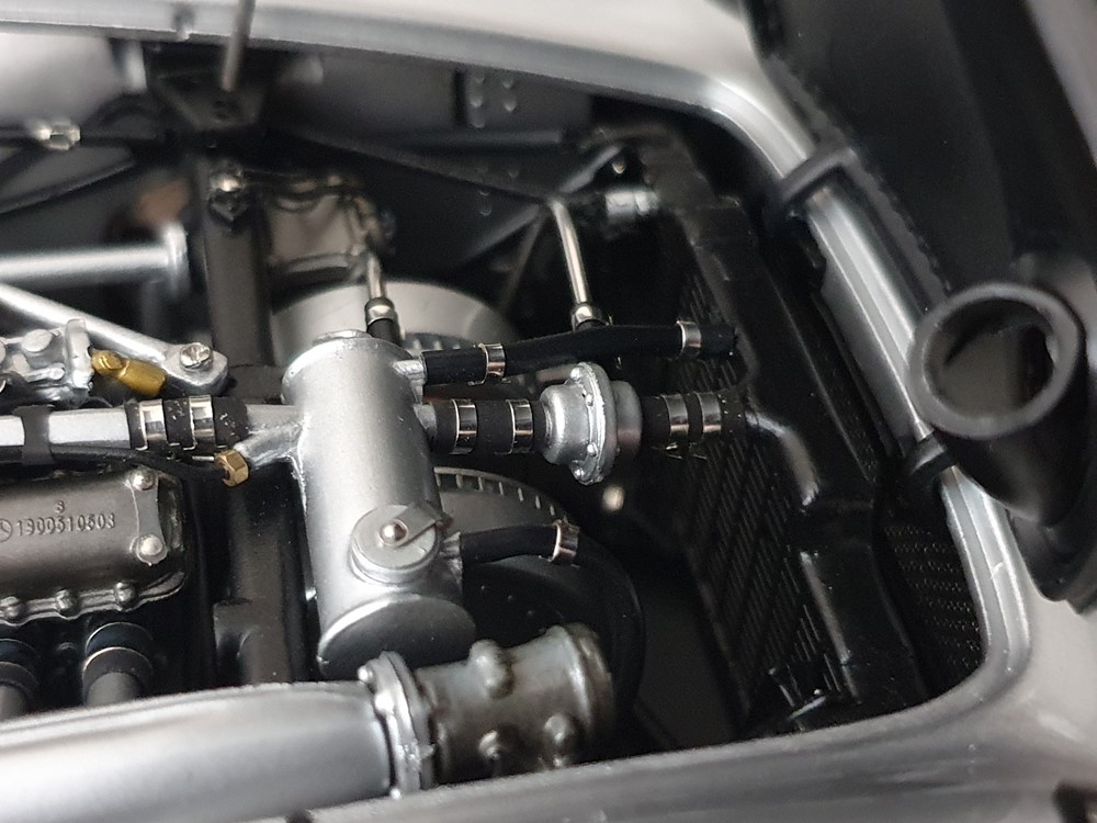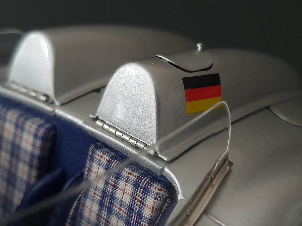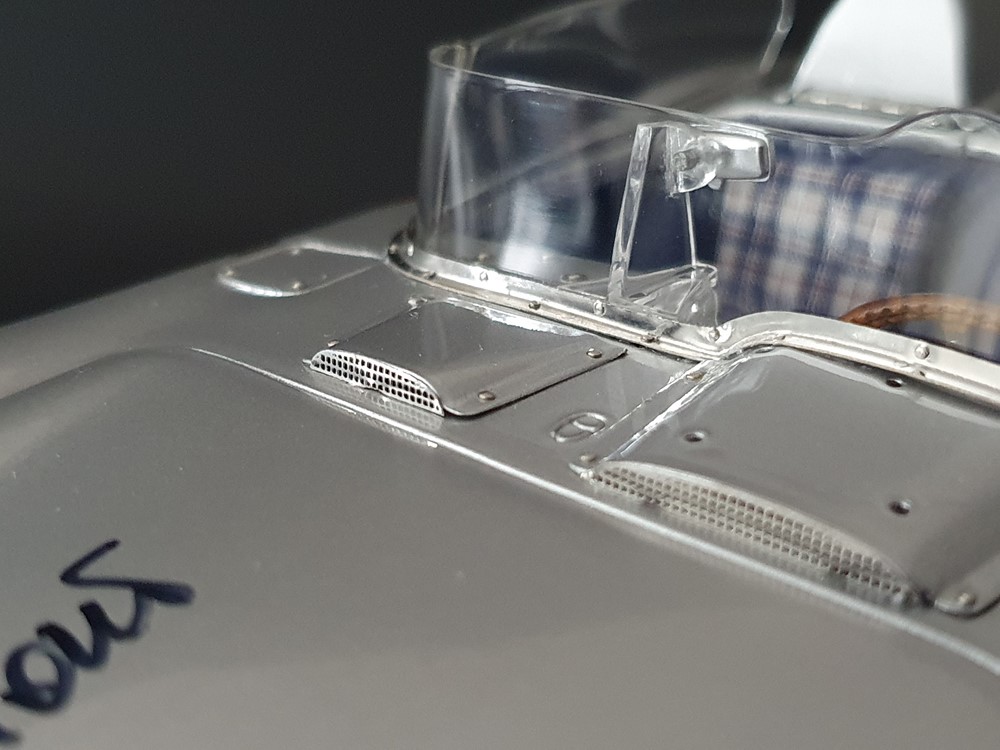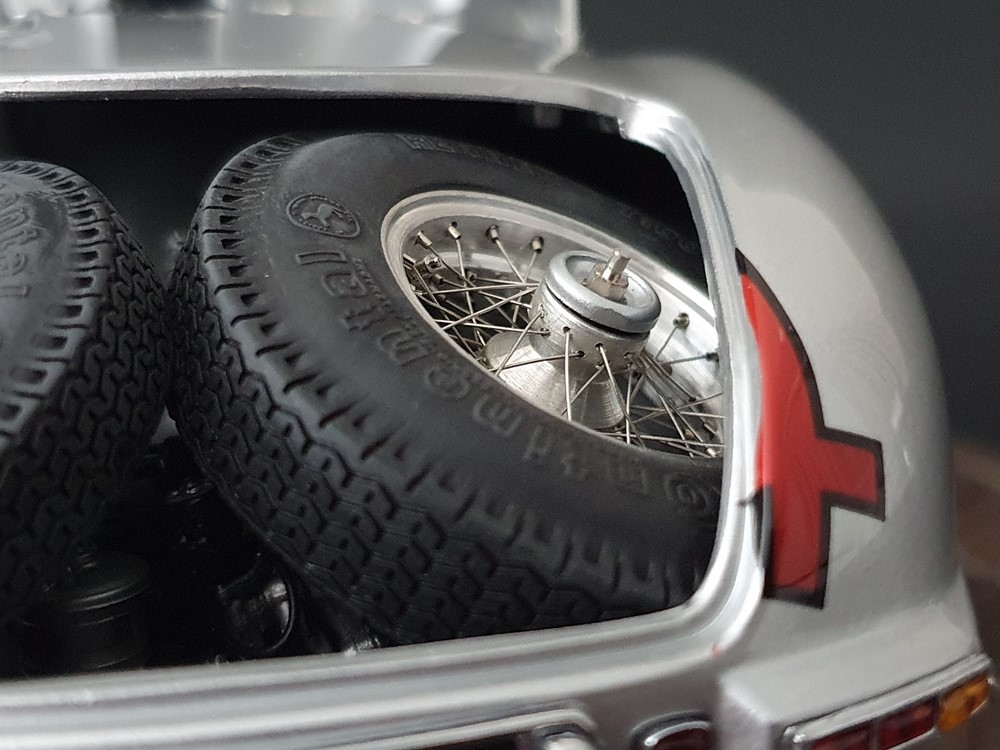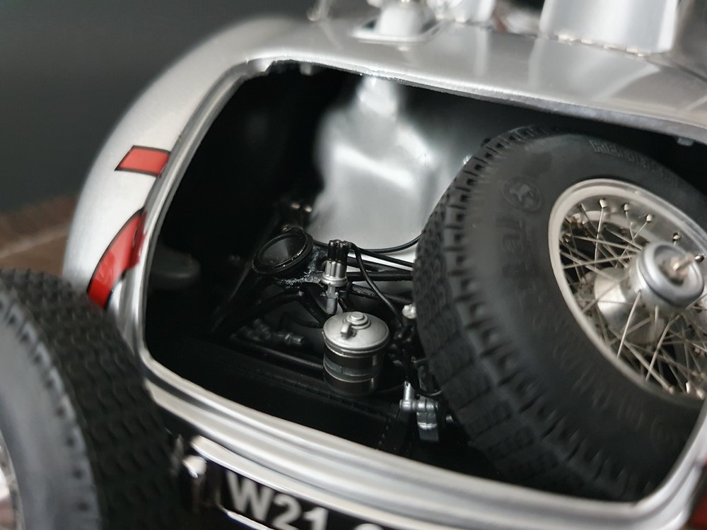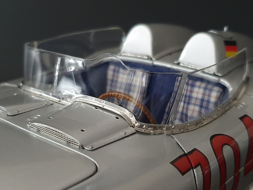 Трех спицевый руль. Салон отделан кожей, а сиденья обиты текстильной тканью. Поднимающаяся водительская дверь облегчает посадку, но для второго пилота такой «роскоши удобства» нет. Съемные передние и задние запасные колеса разных размеров. Колеса со спицами на алюминиевых ободах. Каждая спица из нержавеющей стали снабжена одним ниппелем. Колеса снимаются с помощью трехгранной стопорной гайки. Точное воспроизведение системы вентиляции кабины, ветрового стекла и зеркала заднего вида. Реалистичное отображение оригинальной приборной панели со всеми ее приборами и элементами управления. Купол подголовника соединяется с крышкой багажника. Его можно поднять целиком, чтобы получить доступ к запасному колесу. На капоте двигателя имеется опора. В куполе подголовника водителя встроен люк для доступа к топливному баку. Горловина заправочного бака снизу оснащена съемной крышкой из нержавеющей стали. Передний правый капот двигателя оснащен ажурной решеткой для радиатора и воздухозаборника двигателя. Высоко детализированная 8-цилиндровая рядная силовая установка, размещенная в угловом положении, в комплекте со всеми трубами и проводкой. Боковые выхлопные трубы изготовлены из нержавеющей стали. Передняя подвеска с внутренними барабанными тормозами. Пространственная рама с топливным баком, подвеской колес, консолью для запасного колеса и электрическими топливными насосами. Roller-Map: гениальное изобретение Дениса Дженкинсона