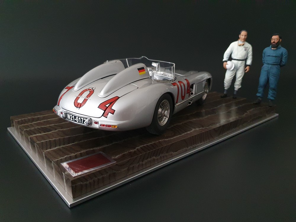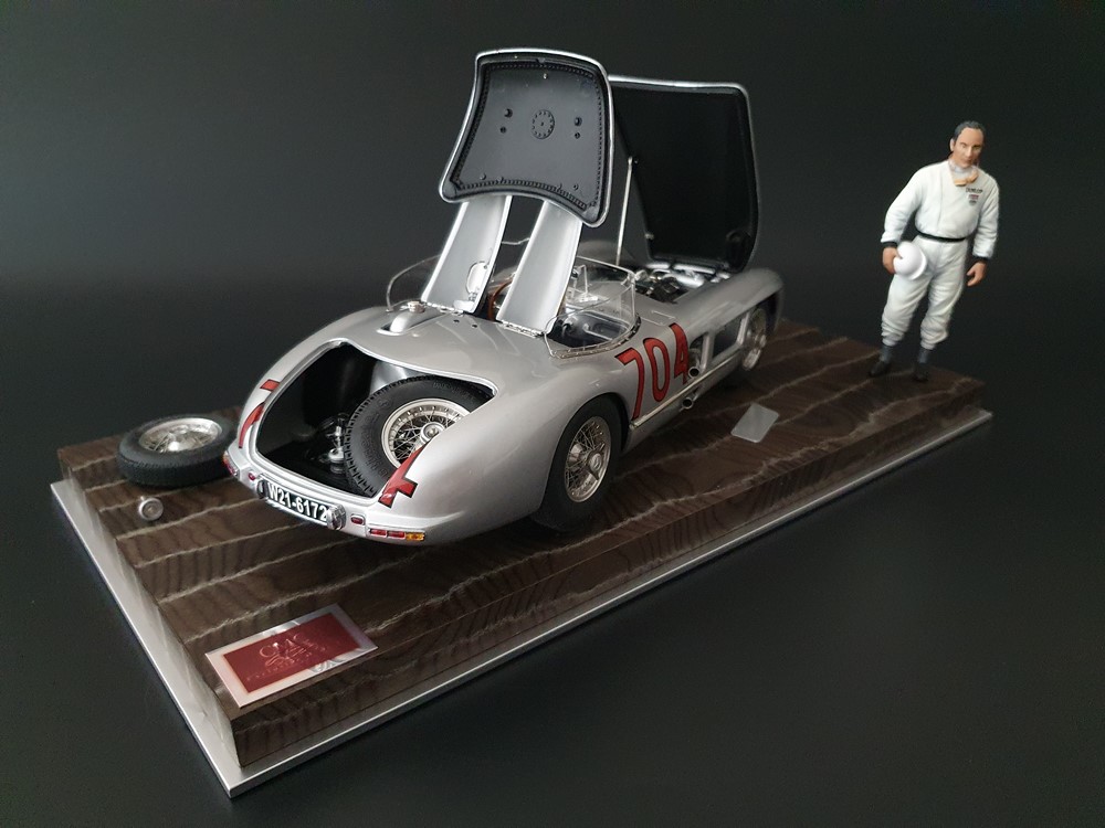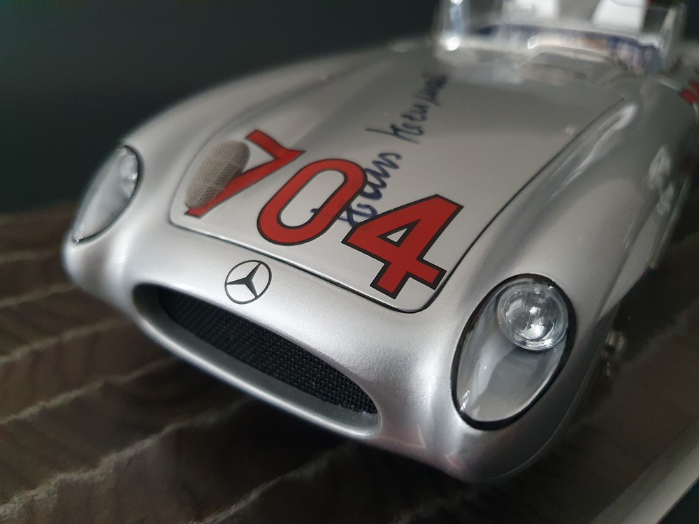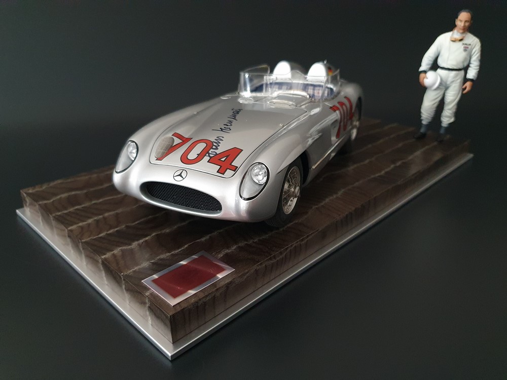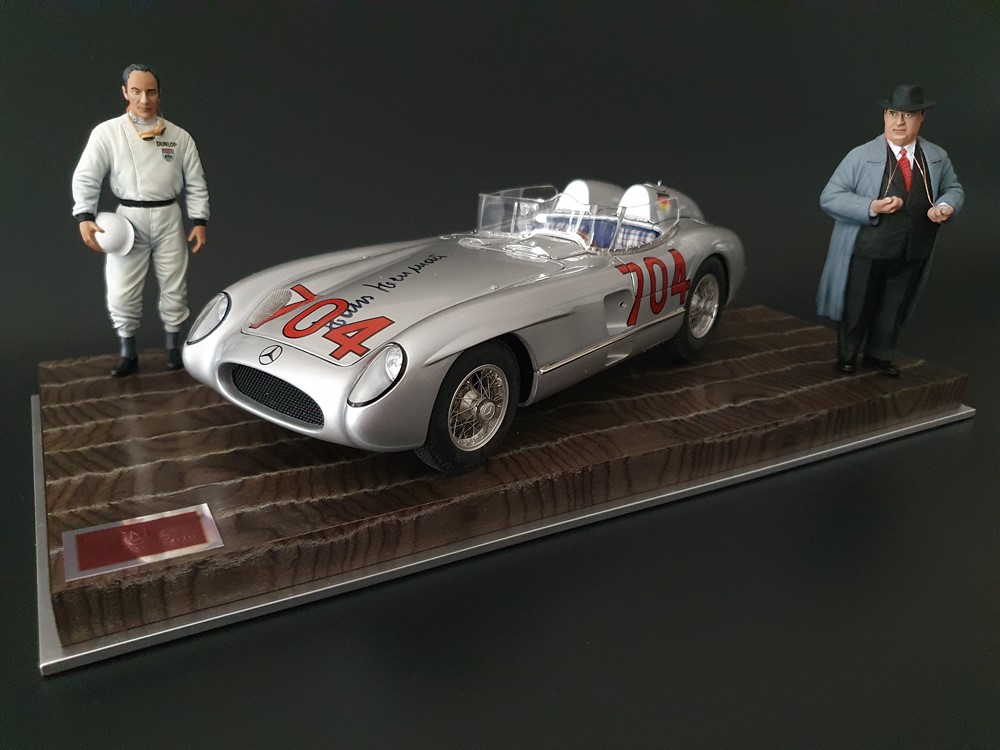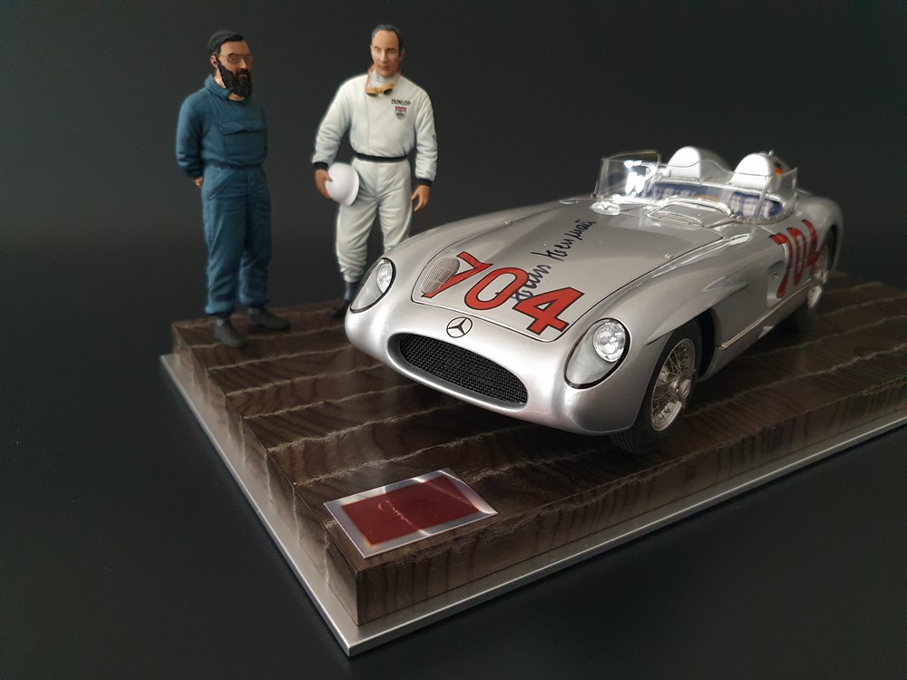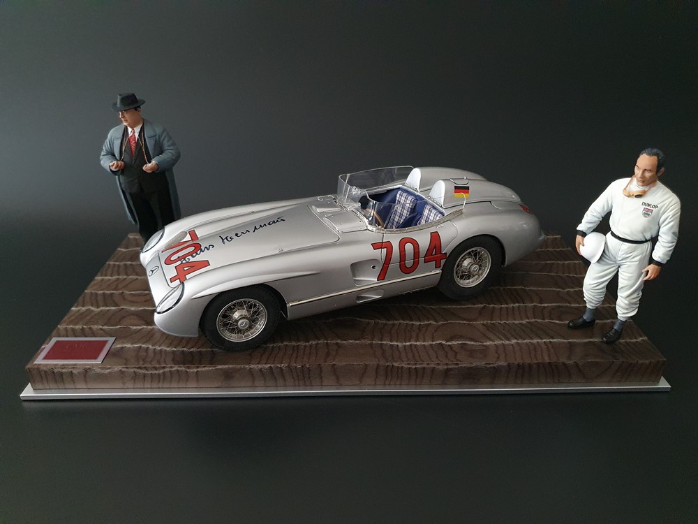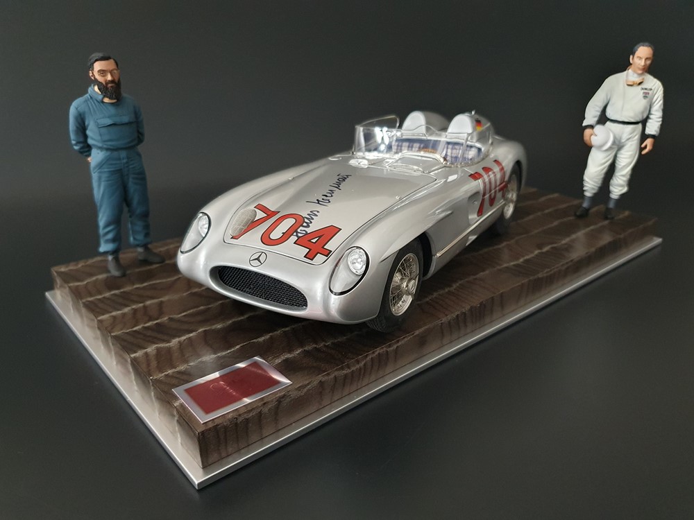 История:Спортивный автомобиль для гонок на выносливость, созданный на базе болида W196 Формулы-1, Mercedes 300 SLR, был разработан для участия в гоночном сезоне 1955 года. 8-цилиндровый двигатель был аналогичен двигателю W196, но увеличен до 3 литров, а также имел десмодромное управление клапанами и двойной распределительный вал. Вес автомобиля составлял 830 кг. 300SLR одержал победы в важных гонках, таких как Mille Miglia (Мосс/Дженкинсон), Targa Florio (Мосс/Коллинз) и Tourist Trophy (Мосс/Фитч), но попал в печально известную аварию в Ле-Мане, в результате которой погиб Пьер Леве и множество зрителей. В конце 1956 года Mercedes прекратил участие в гонках. 1927 год вошел в историю как год рождения Mille Miglia, знаменитой гоночной трассы протяженностью 1600 км, проходящей по Италии. К 1930 году имя Mercedes-Benz было тесно связано с этой гонкой на выносливость. Первая победа пришла к Mercedes-Benz в 1931 году. В 7:04 утра 1 мая 1955 года автомобиль 300 SLR со стартовым номером 704 (стартовый номер = время старта) покинул стартовую площадку в Брешии. За рулем находились Ханс Херрманн и его штурман Герман Эгер, которые отправились побороться за 22-й титул чемпиона 1600-километровой гонки Mille Miglia. Однако неисправная крышка топливного бака привела к опасному разливу топлива, из-за чего гонщики сошли с дистанции, проехав более половины дистанции. Это стало досадной неожиданностью для Херрманна, который имел все шансы на победу. В 1955 году Mercedes-Benz впервые представил на Mille Miglia свой 300 SLR. Среди его сильнейших конкурентов были Ferrari, Maserati и Aston Martin. Каждую минуту один из участвующих автомобилей получал разрешение на старт. С 1949 года стартовый порядок определялся жеребьевкой, так что каждый стартовый номер служил записью времени старта. Молодой, но очень опытный британский гонщик Стирлинг Мосс вместе со своим штурманом Денисом Дженкинсоном («Дженксом») получили стартовый номер 722. Это означает, что их точное время старта было 7:22 утра. Какую незабываемую гонку они показали в тот день! Денис Дженкинсон изобрел так называемую «роликовую карту» — своего рода «навигационную систему», которая вошла в историю автогонок. Эта «роликовая карта» представляла собой шестиметровый бумажный рулон с подробной информацией о трассе, собранной во время тренировок. Благодаря этому он мог давать своему пилоту очень точные указания. Благодаря своему мастерству вождения, стремлению к победе и надежности своего Mercedes-Benz 300 SLR, Стирлинг Мосс уже в Риме вышел в лидеры. Через 10 часов 17 минут и 48 секунд дуэт Мосса и Дженкинсона пересек финишную черту, став победителями. Они достигли невероятной средней скорости 157,65 км/ч - рекорда, который оставался непревзойденным еще долгое время. Дж. М. Фанхио, также управлявший 300 SLR, финишировал вторым, завершив триумфальную победу Mercedes-Benz. После такой победы все испытания, через которые пришлось пройти гонщикам и автомобилю - болезненные толчки от бесчисленных бордюров и жесткие приземления после прыжков на полной скорости по неровным и ухабистым дорогам - были забыты. В конце гонки единственным оставшимся торможением было трение металла о металл, потому что фрикционная колодка была полностью изношена.