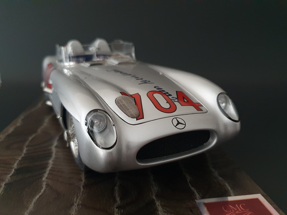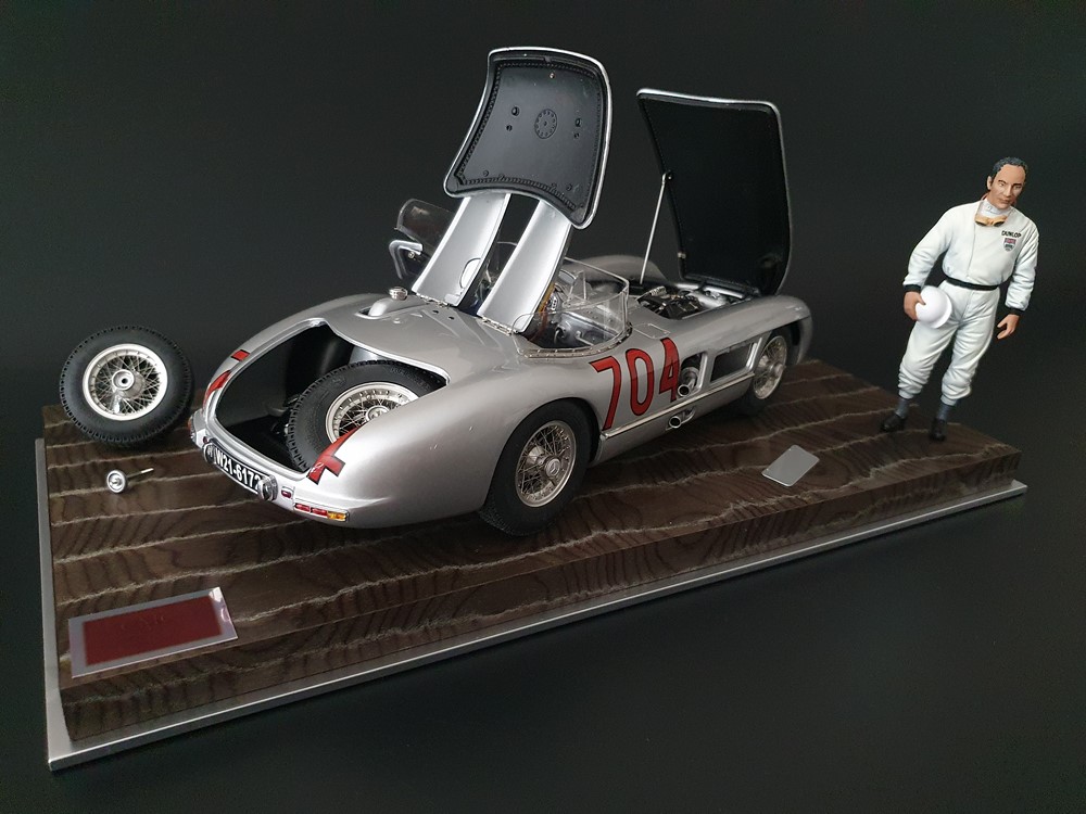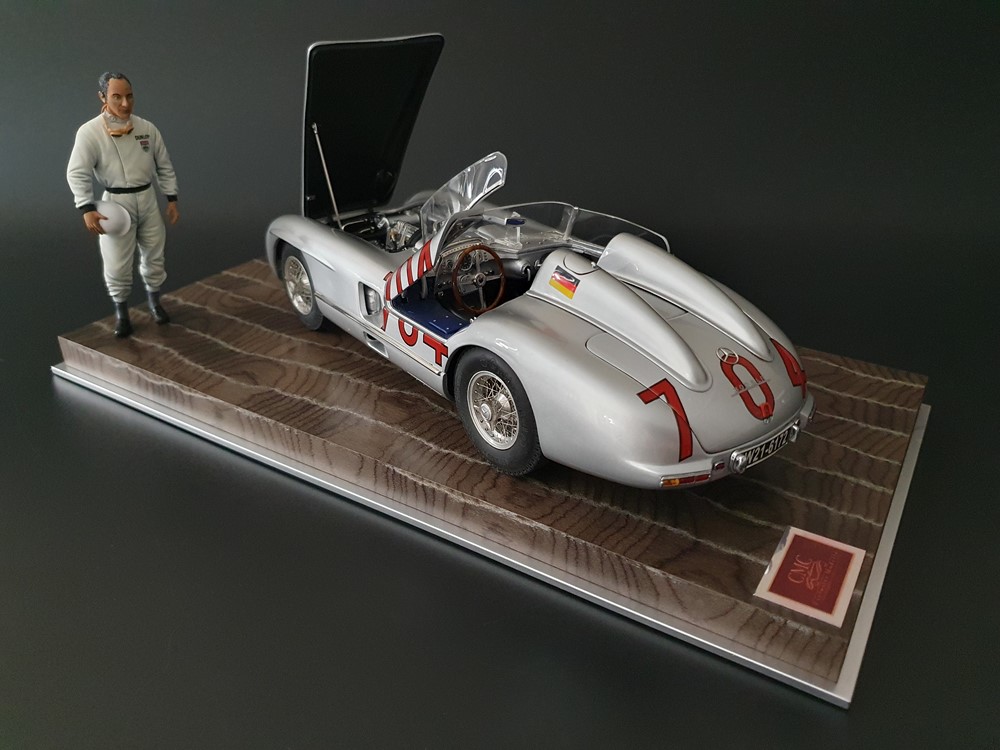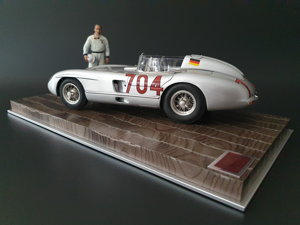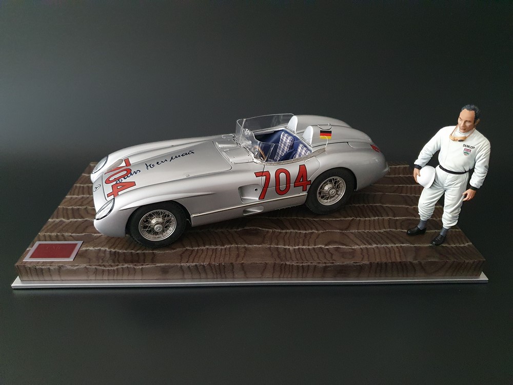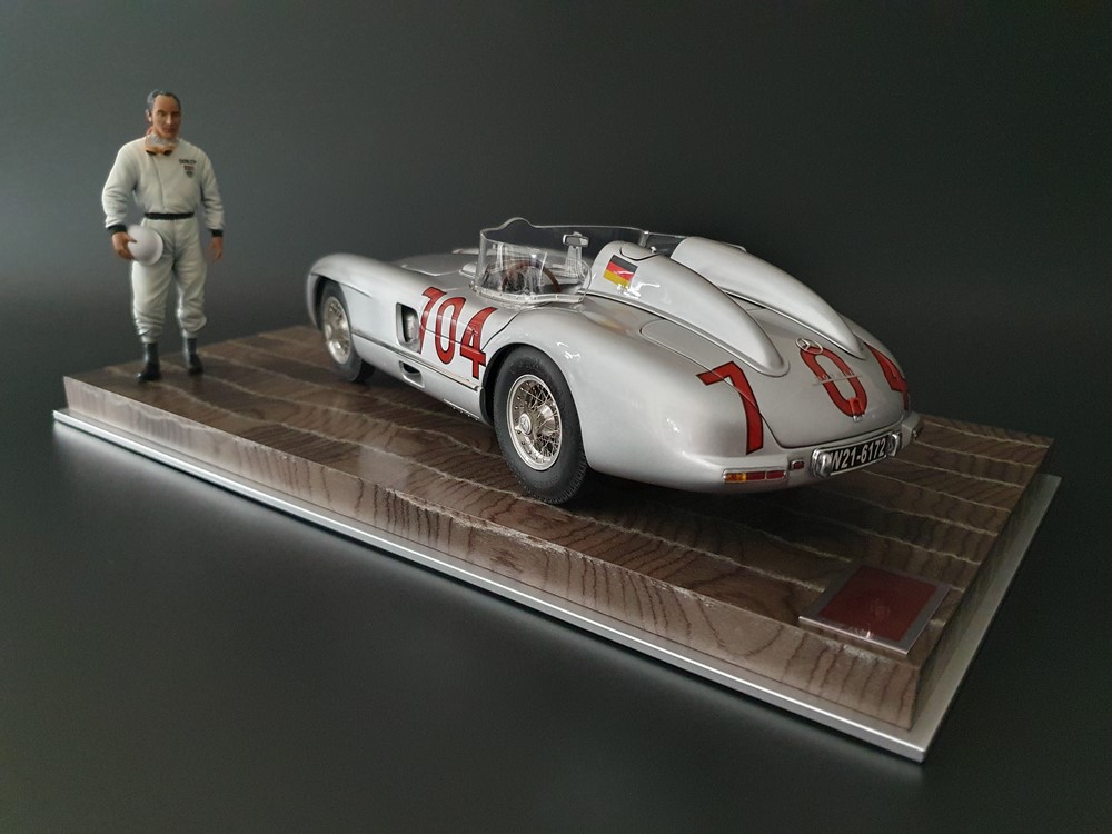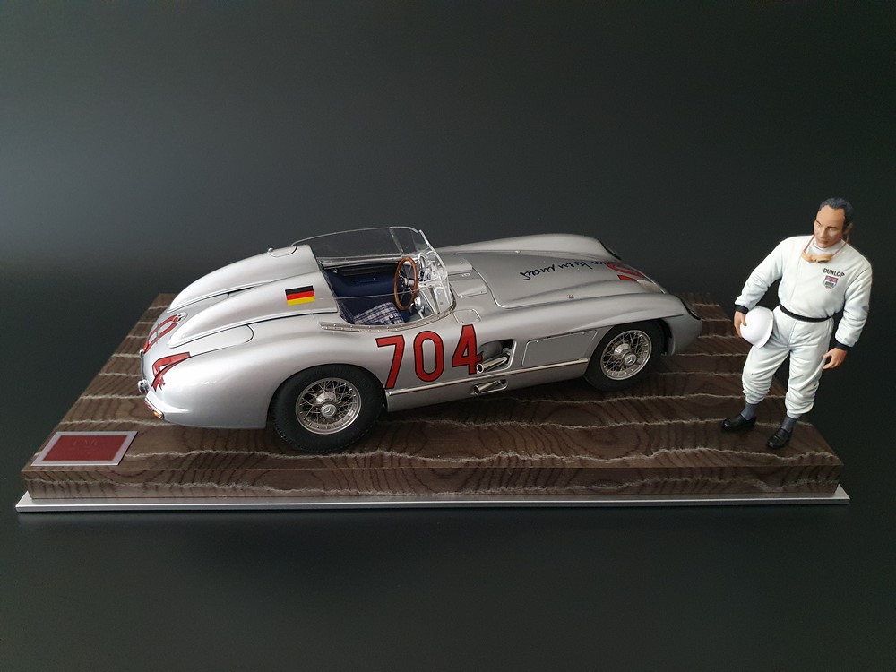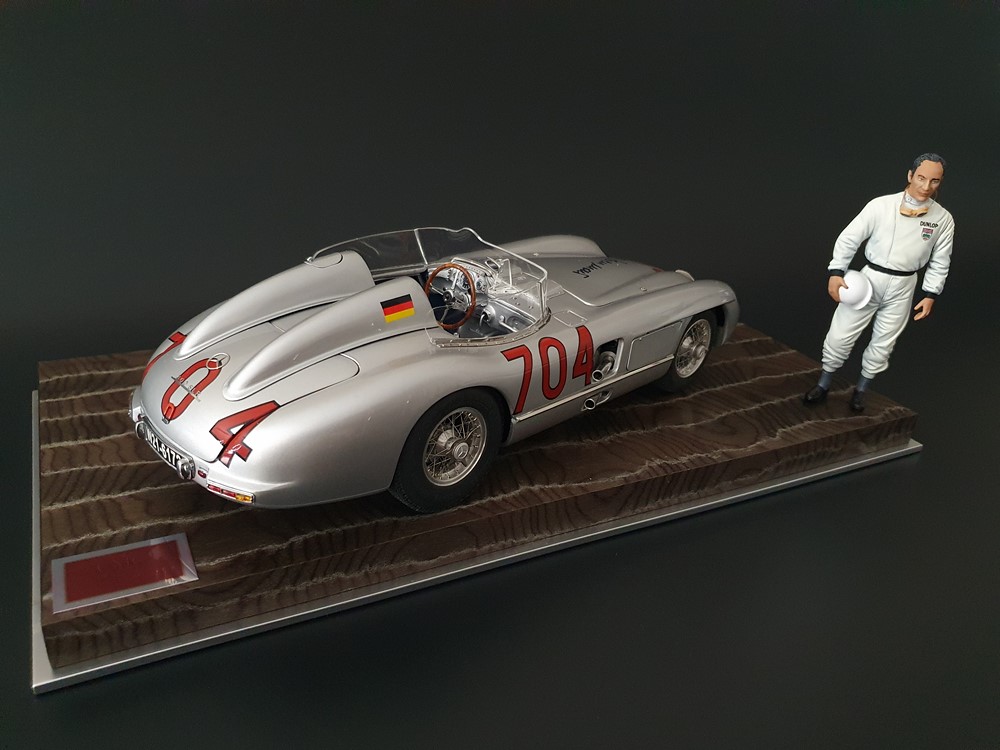 История:Спортивный автомобиль для гонок на выносливость, созданный на базе болида W196 Формулы-1, Mercedes 300 SLR, был разработан для участия в гоночном сезоне 1955 года. 8-цилиндровый двигатель был аналогичен двигателю W196, но увеличен до 3 литров, а также имел десмодромное управление клапанами и двойной распределительный вал. Вес автомобиля составлял 830 кг. 300SLR одержал победы в важных гонках, таких как Mille Miglia (Мосс/Дженкинсон), Targa Florio (Мосс/Коллинз) и Tourist Trophy (Мосс/Фитч), но попал в печально известную аварию в Ле-Мане, в результате которой погиб Пьер Леве и множество зрителей. В конце 1956 года Mercedes прекратил участие в гонках. 1927 год вошел в историю как год рождения Mille Miglia, знаменитой гоночной трассы протяженностью 1600 км, проходящей по Италии. К 1930 году имя Mercedes-Benz было тесно связано с этой гонкой на выносливость. Первая победа пришла к Mercedes-Benz в 1931 году. В 7:04 утра 1 мая 1955 года автомобиль 300 SLR со стартовым номером 704 (стартовый номер = время старта) покинул стартовую площадку в Брешии. За рулем находились Ханс Херрманн и его штурман Герман Эгер, которые отправились побороться за 22-й титул чемпиона 1600-километровой гонки Mille Miglia. Однако неисправная крышка топливного бака привела к опасному разливу топлива, из-за чего гонщики сошли с дистанции, проехав более половины дистанции. Это стало досадной неожиданностью для Херрманна, который имел все шансы на победу. В 1955 году Mercedes-Benz впервые представил на Mille Miglia свой 300 SLR. Среди его сильнейших конкурентов были Ferrari, Maserati и Aston Martin. Каждую минуту один из участвующих автомобилей получал разрешение на старт. С 1949 года стартовый порядок определялся жеребьевкой, так что каждый стартовый номер служил записью времени старта. Молодой, но очень опытный британский гонщик Стирлинг Мосс вместе со своим штурманом Денисом Дженкинсоном («Дженксом») получили стартовый номер 722. Это означает, что их точное время старта было 7:22 утра. Какую незабываемую гонку они показали в тот день! Денис Дженкинсон изобрел так называемую «роликовую карту» — своего рода «навигационную систему», которая вошла в историю автогонок. Эта «роликовая карта» представляла собой шестиметровый бумажный рулон с подробной информацией о трассе, собранной во время тренировок. Благодаря этому он мог давать своему пилоту очень точные указания. Благодаря своему мастерству вождения, стремлению к победе и надежности своего Mercedes-Benz 300 SLR, Стирлинг Мосс уже в Риме вышел в лидеры. Через 10 часов 17 минут и 48 секунд дуэт Мосса и Дженкинсона пересек финишную черту, став победителями. Они достигли невероятной средней скорости 157,65 км/ч - рекорда, который оставался непревзойденным еще долгое время. Дж. М. Фанхио, также управлявший 300 SLR, финишировал вторым, завершив триумфальную победу Mercedes-Benz. После такой победы все испытания, через которые пришлось пройти гонщикам и автомобилю - болезненные толчки от бесчисленных бордюров и жесткие приземления после прыжков на полной скорости по неровным и ухабистым дорогам - были забыты. В конце гонки единственным оставшимся торможением было трение металла о металл, потому что фрикционная колодка была полностью изношена.