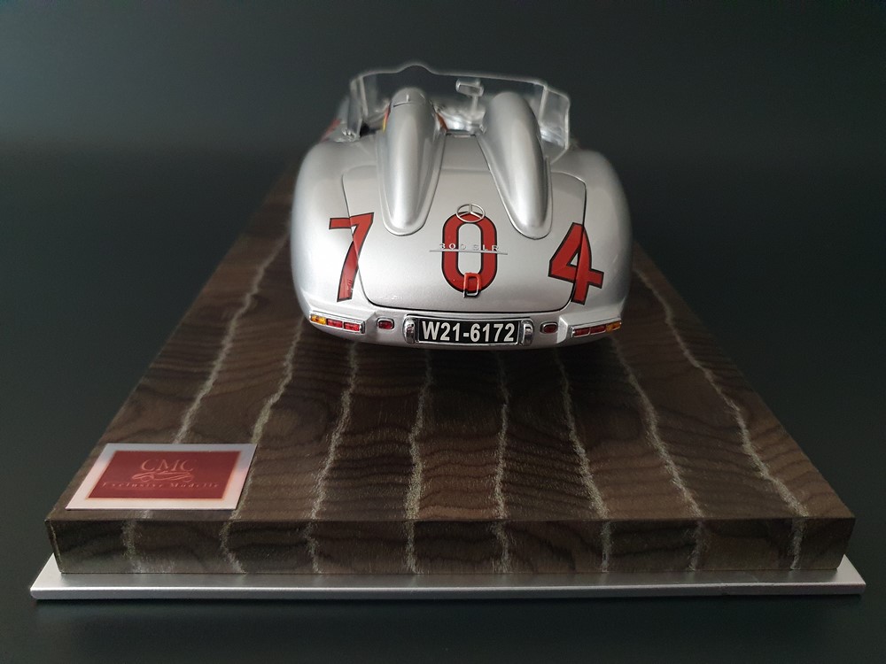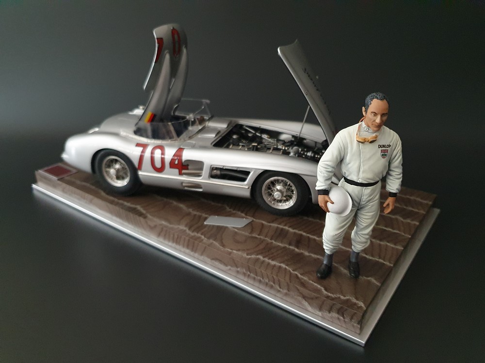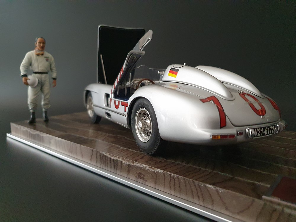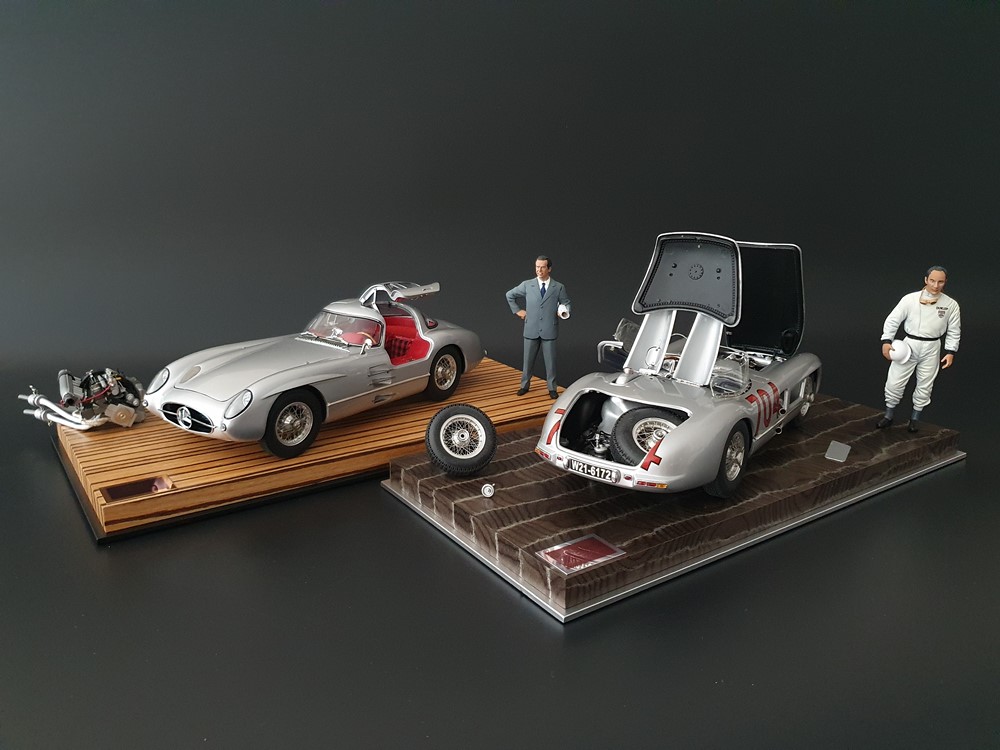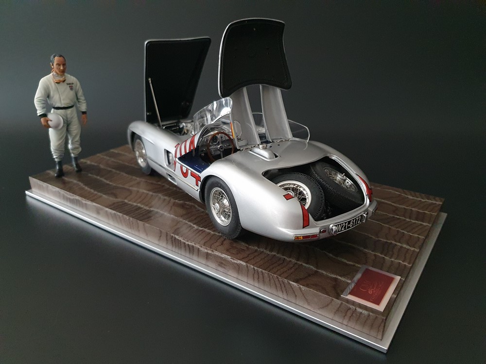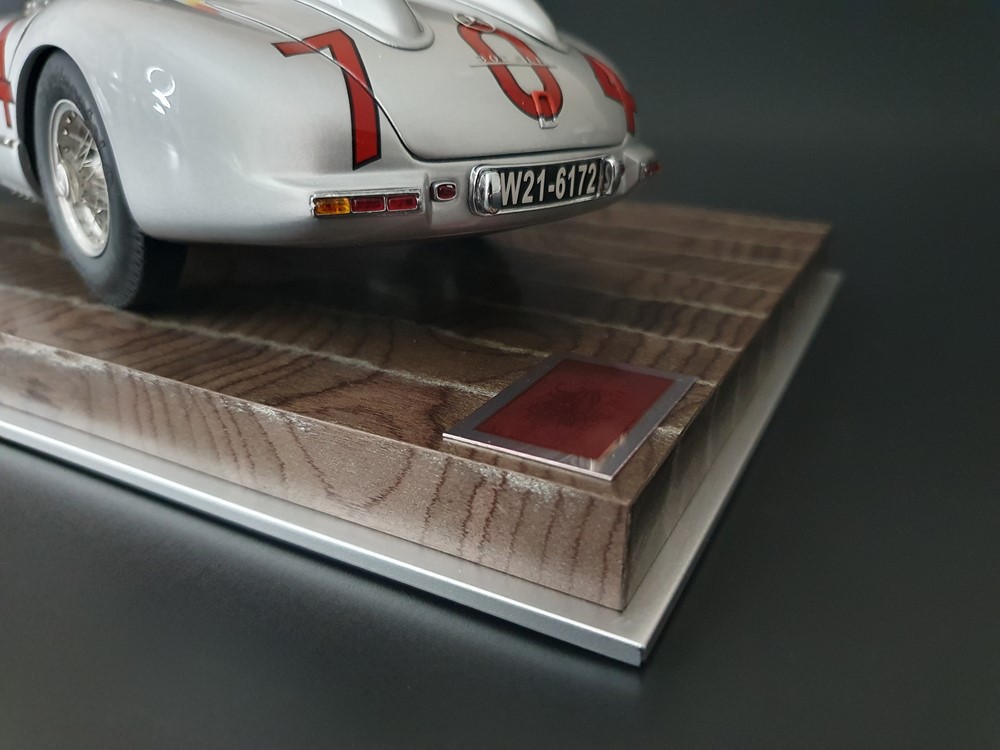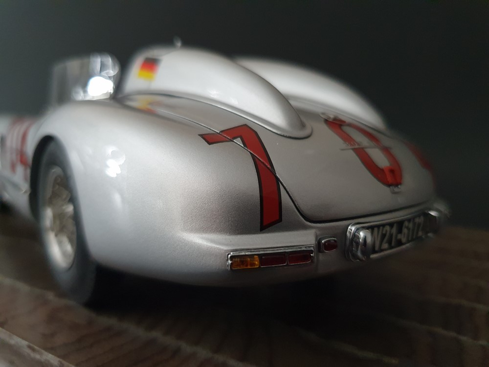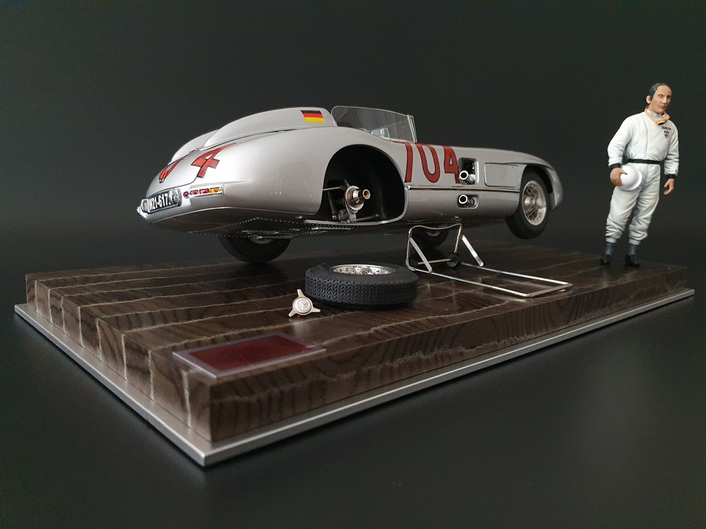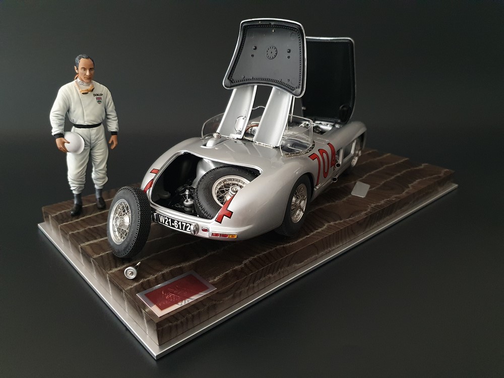 История:Спортивный автомобиль для гонок на выносливость, созданный на базе болида W196 Формулы-1, Mercedes 300 SLR, был разработан для участия в гоночном сезоне 1955 года. 8-цилиндровый двигатель был аналогичен двигателю W196, но увеличен до 3 литров, а также имел десмодромное управление клапанами и двойной распределительный вал. Вес автомобиля составлял 830 кг. 300SLR одержал победы в важных гонках, таких как Mille Miglia (Мосс/Дженкинсон), Targa Florio (Мосс/Коллинз) и Tourist Trophy (Мосс/Фитч), но попал в печально известную аварию в Ле-Мане, в результате которой погиб Пьер Леве и множество зрителей. В конце 1956 года Mercedes прекратил участие в гонках. 1927 год вошел в историю как год рождения Mille Miglia, знаменитой гоночной трассы протяженностью 1600 км, проходящей по Италии. К 1930 году имя Mercedes-Benz было тесно связано с этой гонкой на выносливость. Первая победа пришла к Mercedes-Benz в 1931 году. В 7:04 утра 1 мая 1955 года автомобиль 300 SLR со стартовым номером 704 (стартовый номер = время старта) покинул стартовую площадку в Брешии. За рулем находились Ханс Херрманн и его штурман Герман Эгер, которые отправились побороться за 22-й титул чемпиона 1600-километровой гонки Mille Miglia. Однако неисправная крышка топливного бака привела к опасному разливу топлива, из-за чего гонщики сошли с дистанции, проехав более половины дистанции. Это стало досадной неожиданностью для Херрманна, который имел все шансы на победу. В 1955 году Mercedes-Benz впервые представил на Mille Miglia свой 300 SLR. Среди его сильнейших конкурентов были Ferrari, Maserati и Aston Martin. Каждую минуту один из участвующих автомобилей получал разрешение на старт. С 1949 года стартовый порядок определялся жеребьевкой, так что каждый стартовый номер служил записью времени старта. Молодой, но очень опытный британский гонщик Стирлинг Мосс вместе со своим штурманом Денисом Дженкинсоном («Дженксом») получили стартовый номер 722. Это означает, что их точное время старта было 7:22 утра. Какую незабываемую гонку они показали в тот день! Денис Дженкинсон изобрел так называемую «роликовую карту» — своего рода «навигационную систему», которая вошла в историю автогонок. Эта «роликовая карта» представляла собой шестиметровый бумажный рулон с подробной информацией о трассе, собранной во время тренировок. Благодаря этому он мог давать своему пилоту очень точные указания. Благодаря своему мастерству вождения, стремлению к победе и надежности своего Mercedes-Benz 300 SLR, Стирлинг Мосс уже в Риме вышел в лидеры. Через 10 часов 17 минут и 48 секунд дуэт Мосса и Дженкинсона пересек финишную черту, став победителями. Они достигли невероятной средней скорости 157,65 км/ч - рекорда, который оставался непревзойденным еще долгое время. Дж. М. Фанхио, также управлявший 300 SLR, финишировал вторым, завершив триумфальную победу Mercedes-Benz. После такой победы все испытания, через которые пришлось пройти гонщикам и автомобилю - болезненные толчки от бесчисленных бордюров и жесткие приземления после прыжков на полной скорости по неровным и ухабистым дорогам - были забыты. В конце гонки единственным оставшимся торможением было трение металла о металл, потому что фрикционная колодка была полностью изношена.