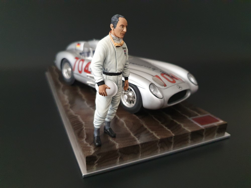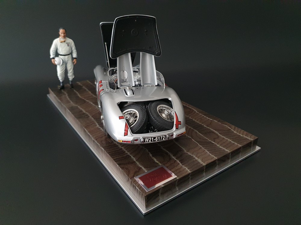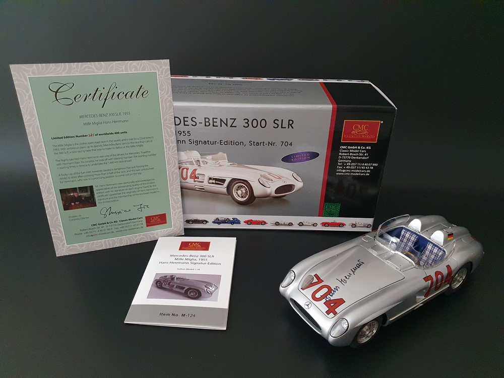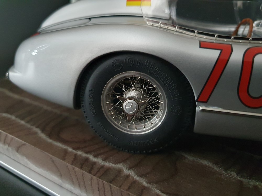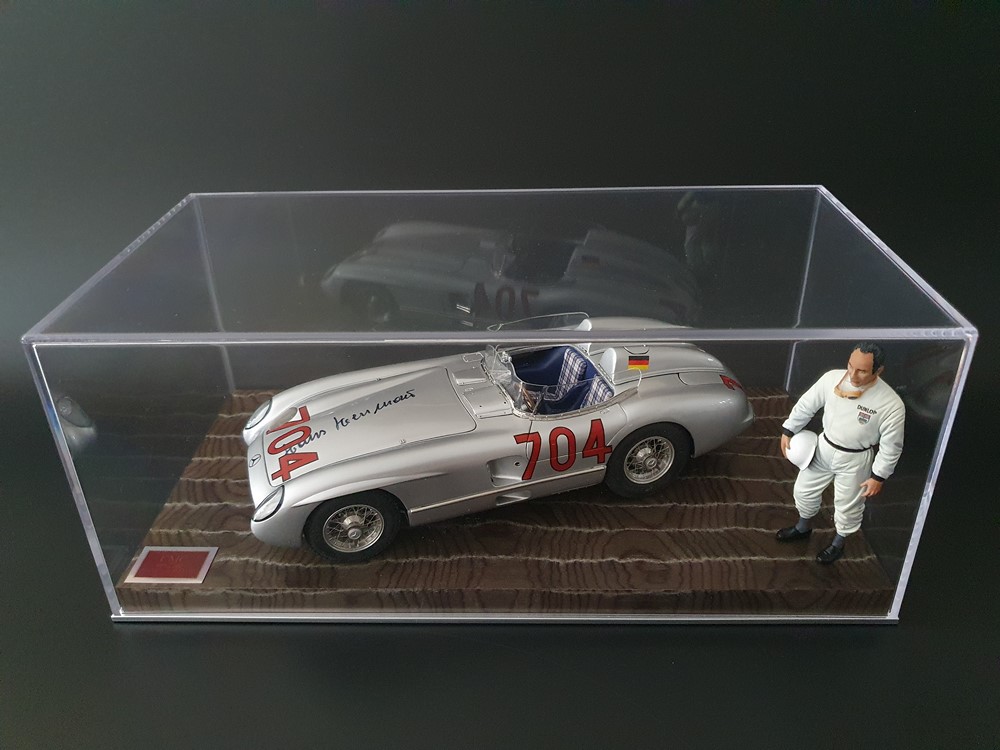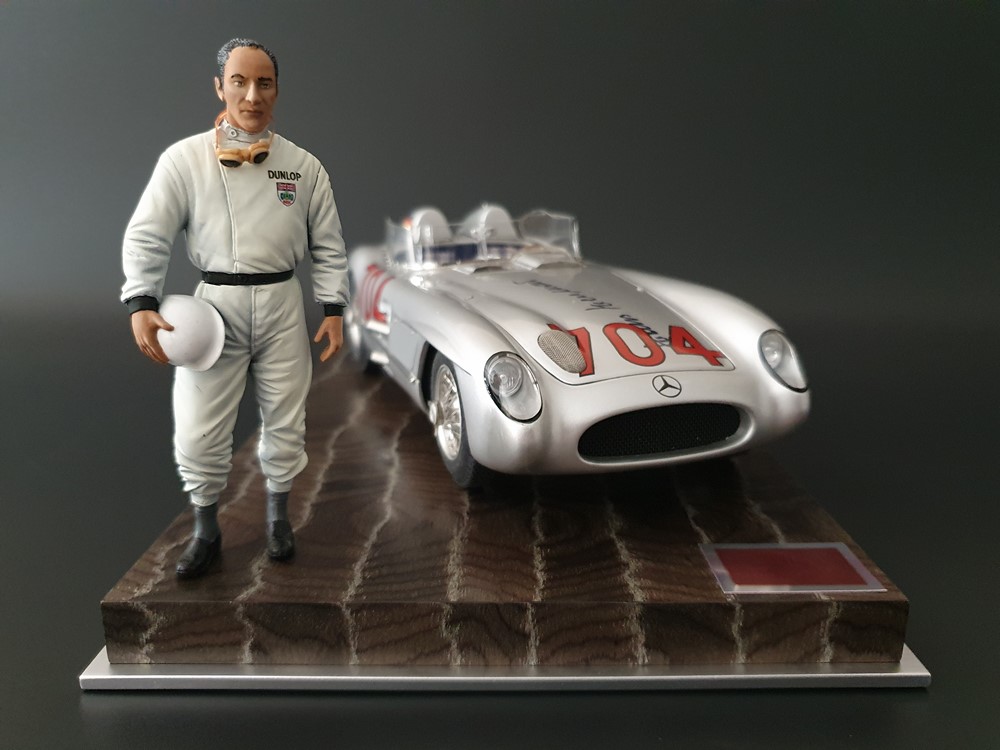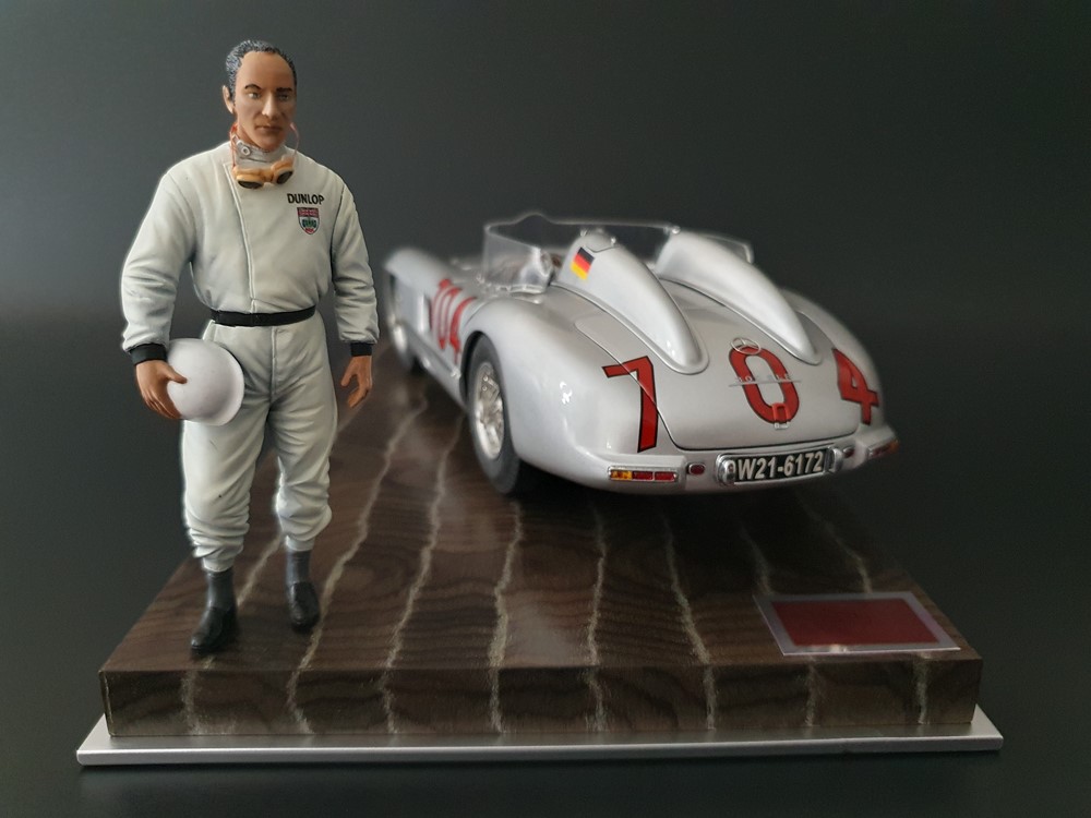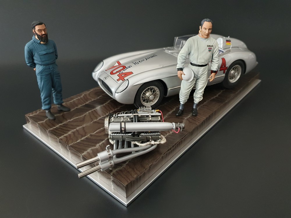История:Спортивный автомобиль для гонок на выносливость, созданный на базе болида W196 Формулы-1, Mercedes 300 SLR, был разработан для участия в гоночном сезоне 1955 года. 8-цилиндровый двигатель был аналогичен двигателю W196, но увеличен до 3 литров, а также имел десмодромное управление клапанами и двойной распределительный вал. Вес автомобиля составлял 830 кг. 300SLR одержал победы в важных гонках, таких как Mille Miglia (Мосс/Дженкинсон), Targa Florio (Мосс/Коллинз) и Tourist Trophy (Мосс/Фитч), но попал в печально известную аварию в Ле-Мане, в результате которой погиб Пьер Леве и множество зрителей. В конце 1956 года Mercedes прекратил участие в гонках. 1927 год вошел в историю как год рождения Mille Miglia, знаменитой гоночной трассы протяженностью 1600 км, проходящей по Италии. К 1930 году имя Mercedes-Benz было тесно связано с этой гонкой на выносливость. Первая победа пришла к Mercedes-Benz в 1931 году. В 7:04 утра 1 мая 1955 года автомобиль 300 SLR со стартовым номером 704 (стартовый номер = время старта) покинул стартовую площадку в Брешии. За рулем находились Ханс Херрманн и его штурман Герман Эгер, которые отправились побороться за 22-й титул чемпиона 1600-километровой гонки Mille Miglia. Однако неисправная крышка топливного бака привела к опасному разливу топлива, из-за чего гонщики сошли с дистанции, проехав более половины дистанции. Это стало досадной неожиданностью для Херрманна, который имел все шансы на победу. В 1955 году Mercedes-Benz впервые представил на Mille Miglia свой 300 SLR. Среди его сильнейших конкурентов были Ferrari, Maserati и Aston Martin. Каждую минуту один из участвующих автомобилей получал разрешение на старт. С 1949 года стартовый порядок определялся жеребьевкой, так что каждый стартовый номер служил записью времени старта. Молодой, но очень опытный британский гонщик Стирлинг Мосс вместе со своим штурманом Денисом Дженкинсоном («Дженксом») получили стартовый номер 722. Это означает, что их точное время старта было 7:22 утра. Какую незабываемую гонку они показали в тот день! Денис Дженкинсон изобрел так называемую «роликовую карту» — своего рода «навигационную систему», которая вошла в историю автогонок. Эта «роликовая карта» представляла собой шестиметровый бумажный рулон с подробной информацией о трассе, собранной во время тренировок. Благодаря этому он мог давать своему пилоту очень точные указания. Благодаря своему мастерству вождения, стремлению к победе и надежности своего Mercedes-Benz 300 SLR, Стирлинг Мосс уже в Риме вышел в лидеры. Через 10 часов 17 минут и 48 секунд дуэт Мосса и Дженкинсона пересек финишную черту, став победителями. Они достигли невероятной средней скорости 157,65 км/ч - рекорда, который оставался непревзойденным еще долгое время. Дж. М. Фанхио, также управлявший 300 SLR, финишировал вторым, завершив триумфальную победу Mercedes-Benz. После такой победы все испытания, через которые пришлось пройти гонщикам и автомобилю - болезненные толчки от бесчисленных бордюров и жесткие приземления после прыжков на полной скорости по неровным и ухабистым дорогам - были забыты. В конце гонки единственным оставшимся торможением было трение металла о металл, потому что фрикционная колодка была полностью изношена.