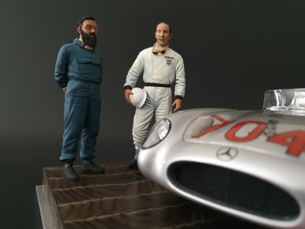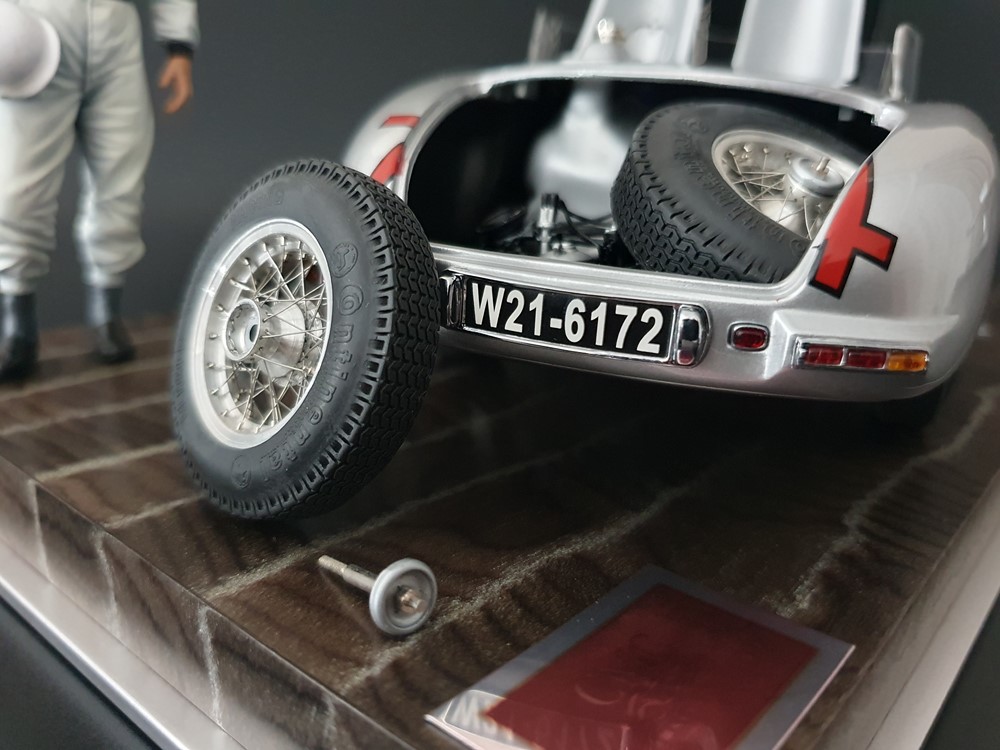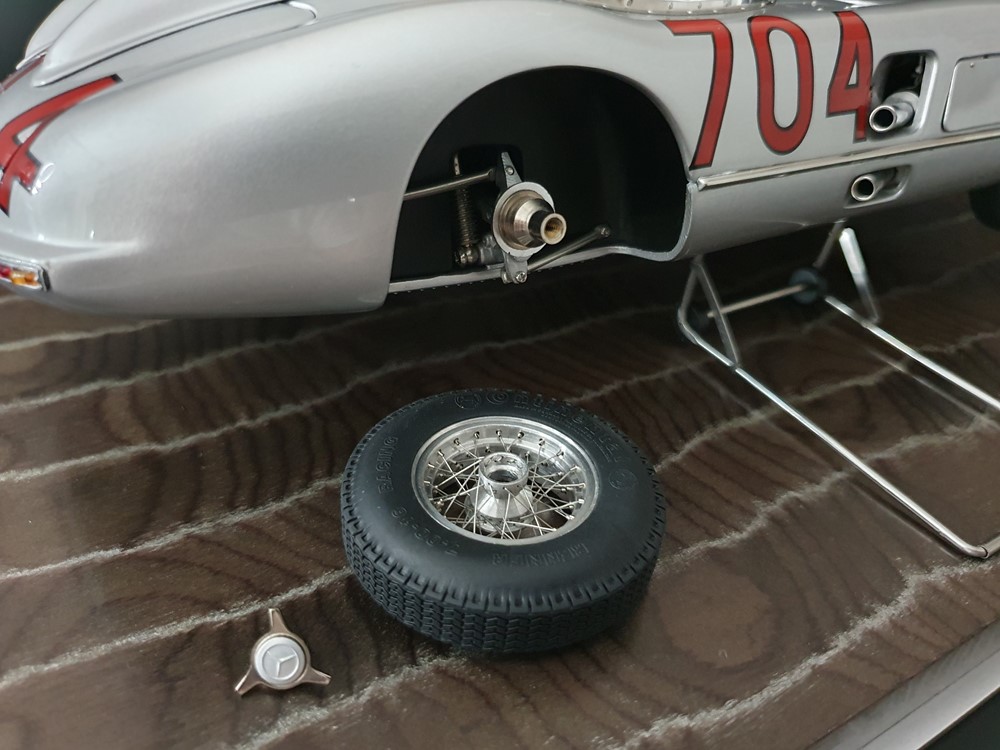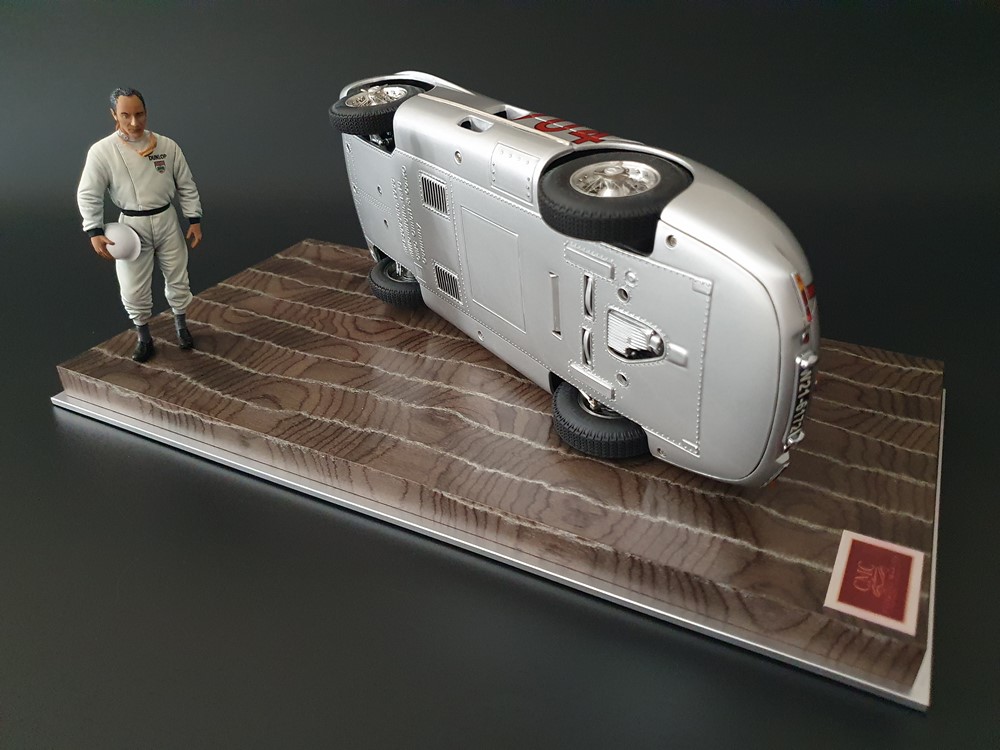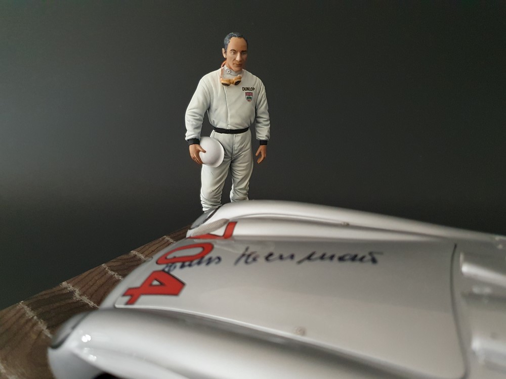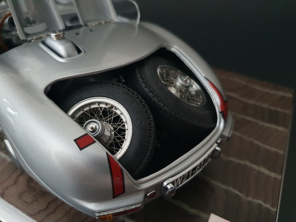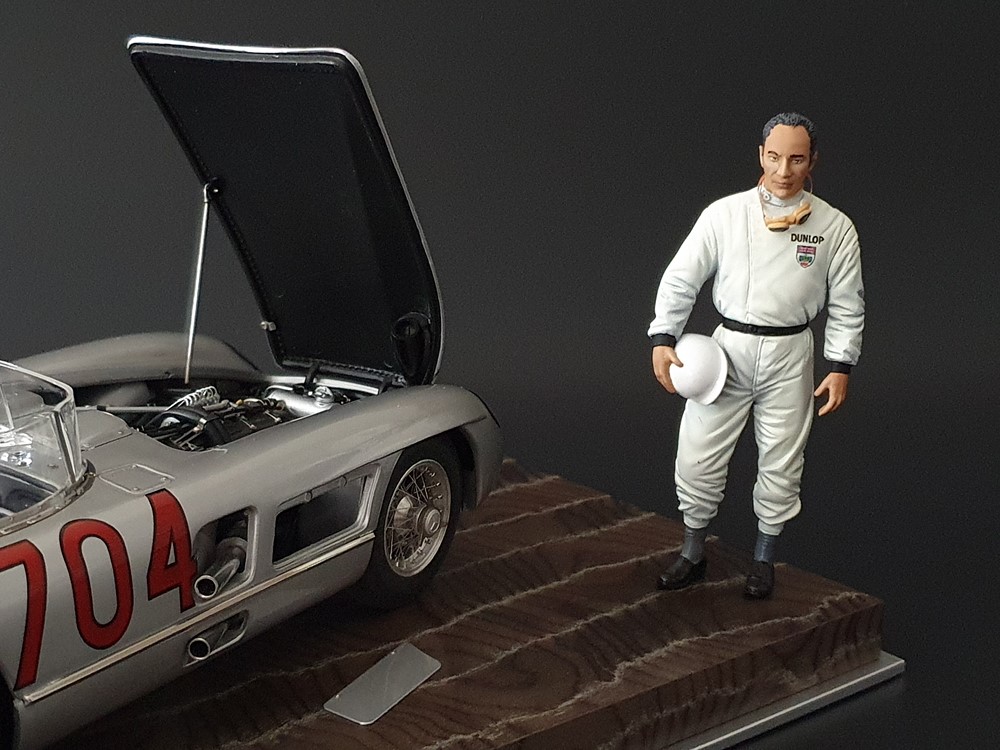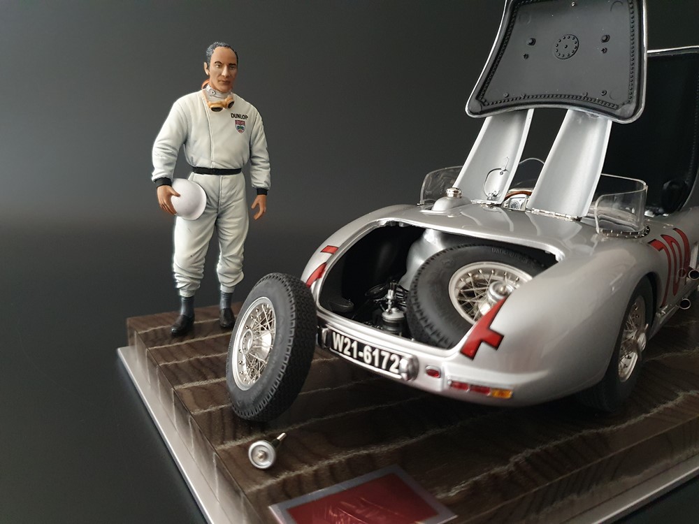 История:Спортивный автомобиль для гонок на выносливость, созданный на базе болида W196 Формулы-1, Mercedes 300 SLR, был разработан для участия в гоночном сезоне 1955 года. 8-цилиндровый двигатель был аналогичен двигателю W196, но увеличен до 3 литров, а также имел десмодромное управление клапанами и двойной распределительный вал. Вес автомобиля составлял 830 кг. 300SLR одержал победы в важных гонках, таких как Mille Miglia (Мосс/Дженкинсон), Targa Florio (Мосс/Коллинз) и Tourist Trophy (Мосс/Фитч), но попал в печально известную аварию в Ле-Мане, в результате которой погиб Пьер Леве и множество зрителей. В конце 1956 года Mercedes прекратил участие в гонках. 1927 год вошел в историю как год рождения Mille Miglia, знаменитой гоночной трассы протяженностью 1600 км, проходящей по Италии. К 1930 году имя Mercedes-Benz было тесно связано с этой гонкой на выносливость. Первая победа пришла к Mercedes-Benz в 1931 году. В 7:04 утра 1 мая 1955 года автомобиль 300 SLR со стартовым номером 704 (стартовый номер = время старта) покинул стартовую площадку в Брешии. За рулем находились Ханс Херрманн и его штурман Герман Эгер, которые отправились побороться за 22-й титул чемпиона 1600-километровой гонки Mille Miglia. Однако неисправная крышка топливного бака привела к опасному разливу топлива, из-за чего гонщики сошли с дистанции, проехав более половины дистанции. Это стало досадной неожиданностью для Херрманна, который имел все шансы на победу. В 1955 году Mercedes-Benz впервые представил на Mille Miglia свой 300 SLR. Среди его сильнейших конкурентов были Ferrari, Maserati и Aston Martin. Каждую минуту один из участвующих автомобилей получал разрешение на старт. С 1949 года стартовый порядок определялся жеребьевкой, так что каждый стартовый номер служил записью времени старта. Молодой, но очень опытный британский гонщик Стирлинг Мосс вместе со своим штурманом Денисом Дженкинсоном («Дженксом») получили стартовый номер 722. Это означает, что их точное время старта было 7:22 утра. Какую незабываемую гонку они показали в тот день! Денис Дженкинсон изобрел так называемую «роликовую карту» — своего рода «навигационную систему», которая вошла в историю автогонок. Эта «роликовая карта» представляла собой шестиметровый бумажный рулон с подробной информацией о трассе, собранной во время тренировок. Благодаря этому он мог давать своему пилоту очень точные указания. Благодаря своему мастерству вождения, стремлению к победе и надежности своего Mercedes-Benz 300 SLR, Стирлинг Мосс уже в Риме вышел в лидеры. Через 10 часов 17 минут и 48 секунд дуэт Мосса и Дженкинсона пересек финишную черту, став победителями. Они достигли невероятной средней скорости 157,65 км/ч - рекорда, который оставался непревзойденным еще долгое время. Дж. М. Фанхио, также управлявший 300 SLR, финишировал вторым, завершив триумфальную победу Mercedes-Benz. После такой победы все испытания, через которые пришлось пройти гонщикам и автомобилю - болезненные толчки от бесчисленных бордюров и жесткие приземления после прыжков на полной скорости по неровным и ухабистым дорогам - были забыты. В конце гонки единственным оставшимся торможением было трение металла о металл, потому что фрикционная колодка была полностью изношена.