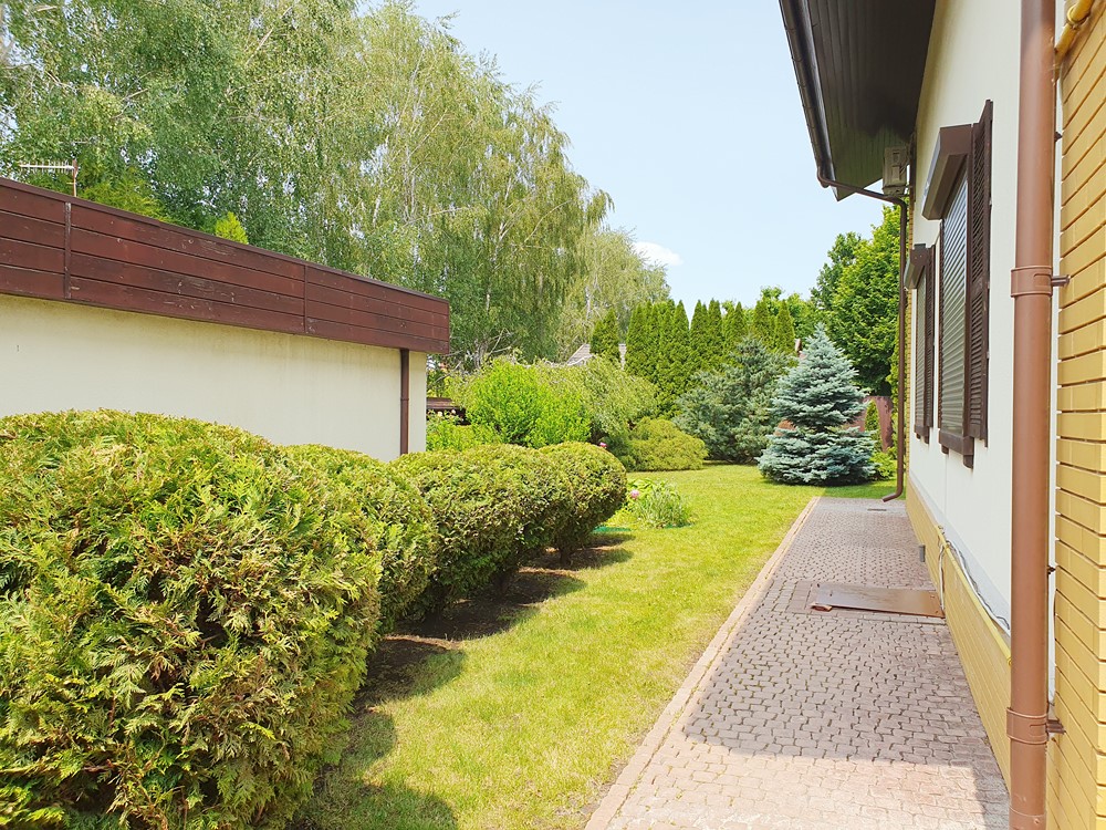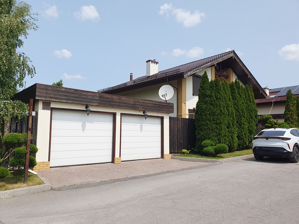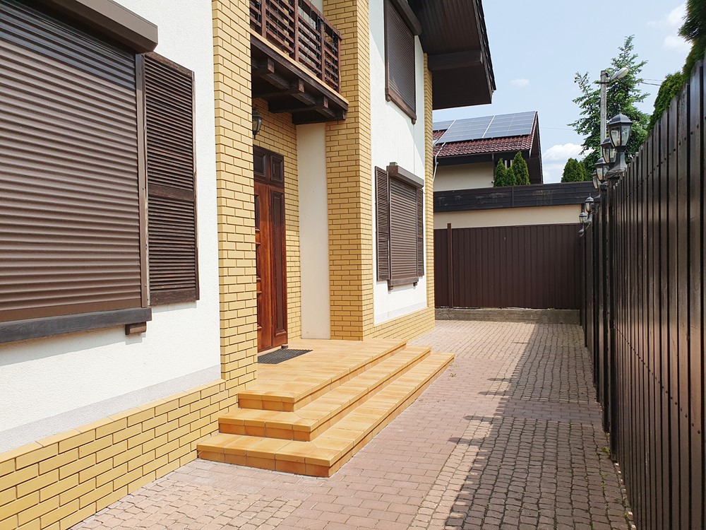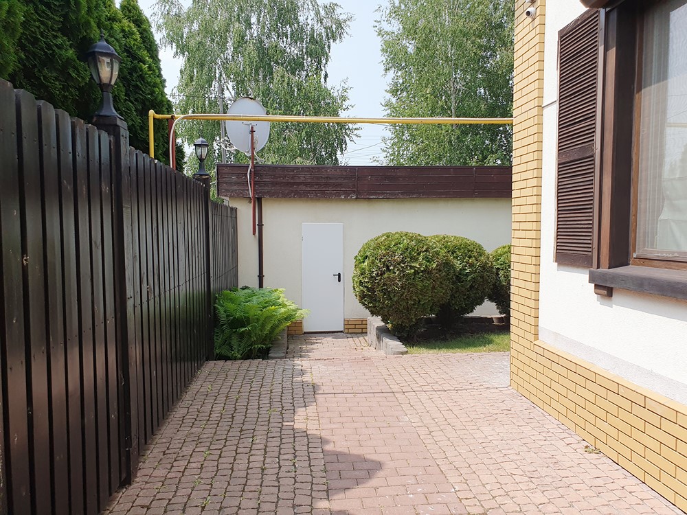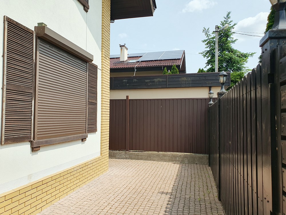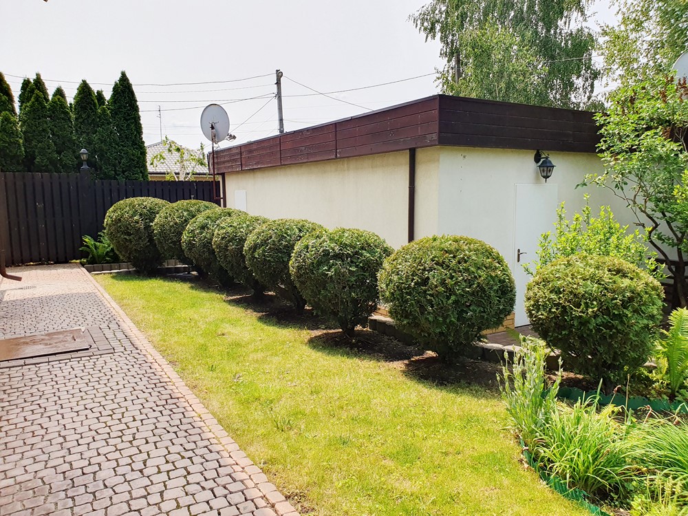 Двор:Огорожен капитальным забором, взрослое озеленение, тротуарная брусчатка, отдельно стоящий гараж на две машины с генератором, автоматические ворота, газон с автоматическим поливом, вольер на две собаки