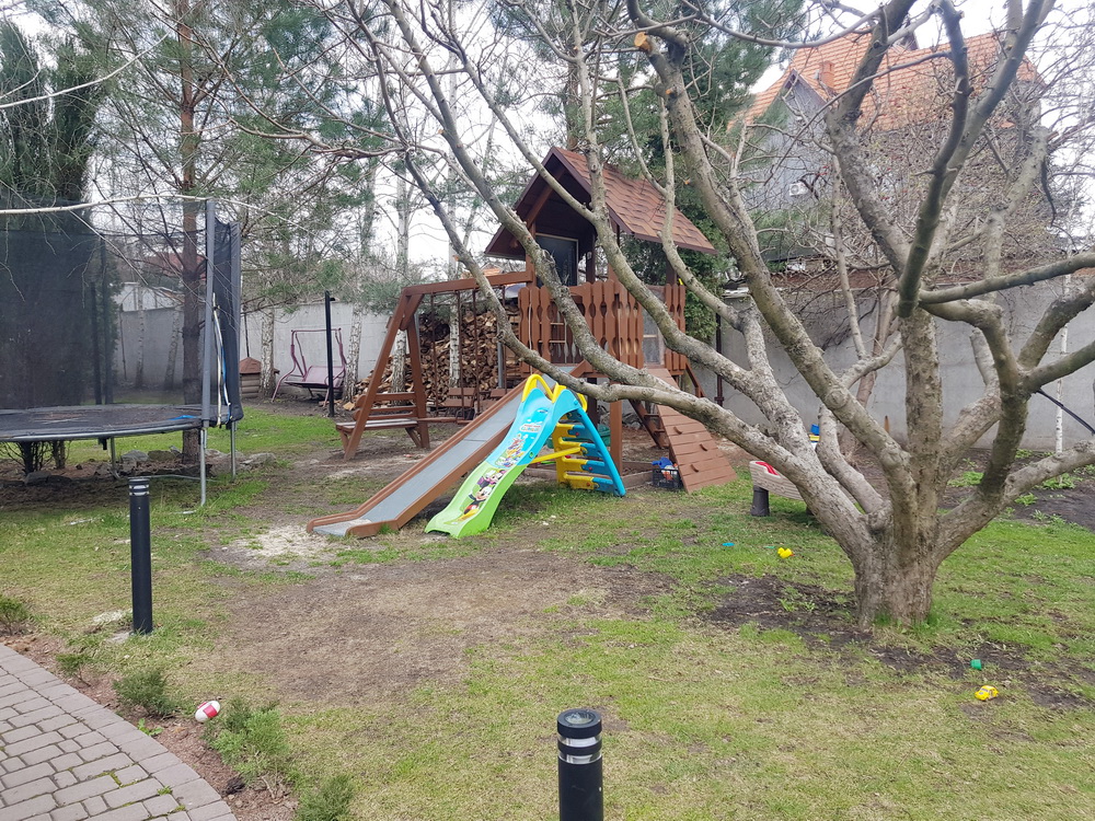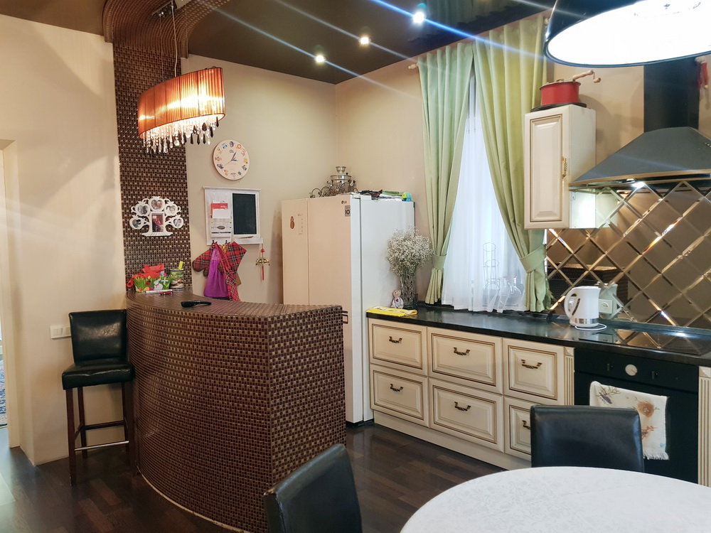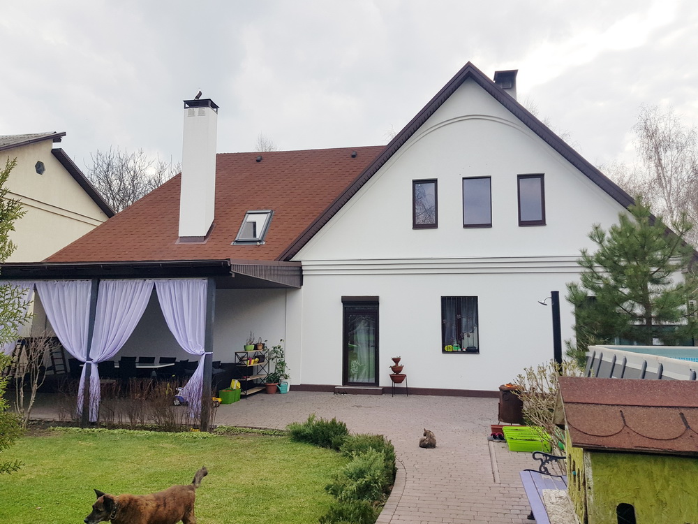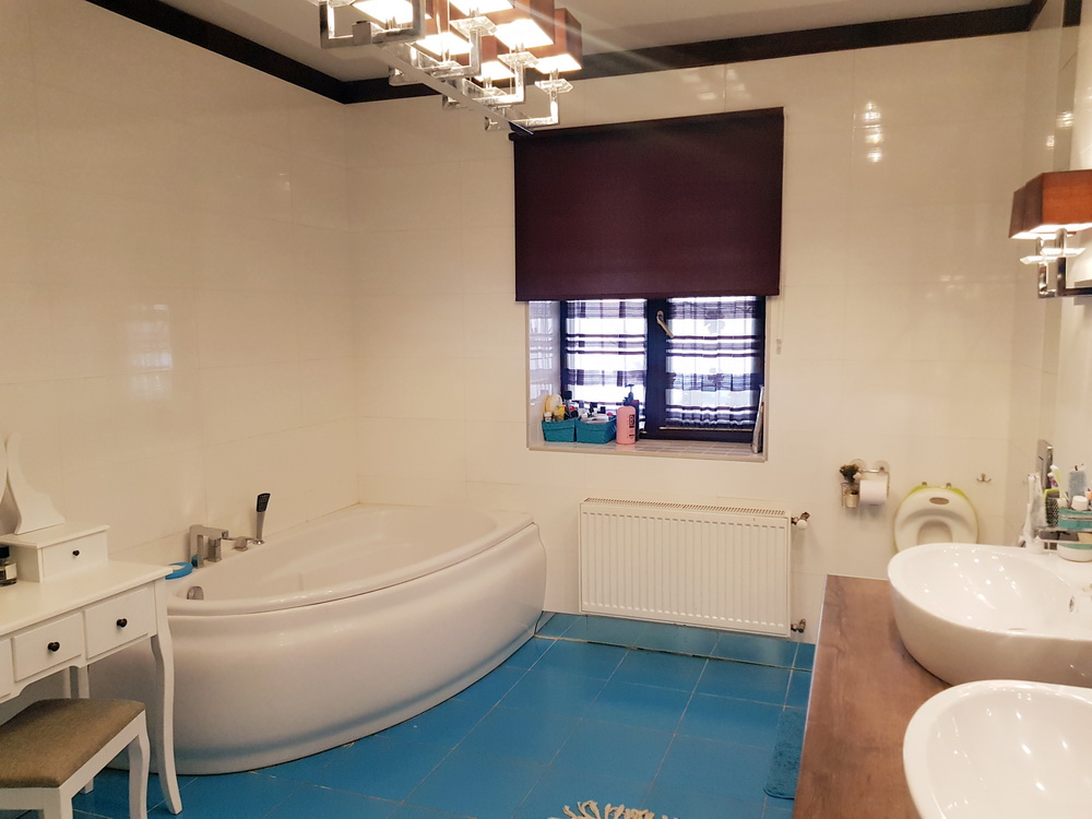 337м.кв. 2-х этажный, первый этаж все с ремонтом и обстановкой + огромная терраса 45м.кв. с садовой мебелью, второй после строителей. Энергоэффективный дом – затраты на отопление 1000гр. в месяц. С горячей водой (бойлер косвенного нагрева). Планировка: 1-й этаж: гостиная, кухня, 2 спальни, два санузла, топочная. 2-й этаж после строителей: 3 спальни, кабинет, холл и санузел.