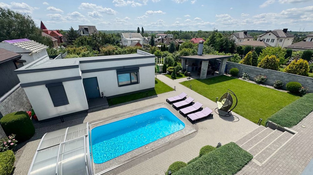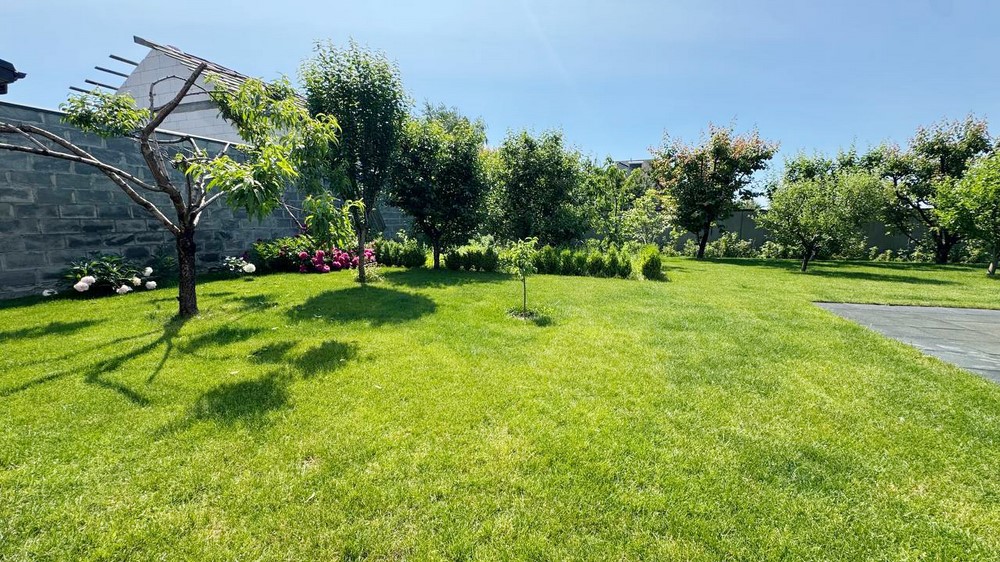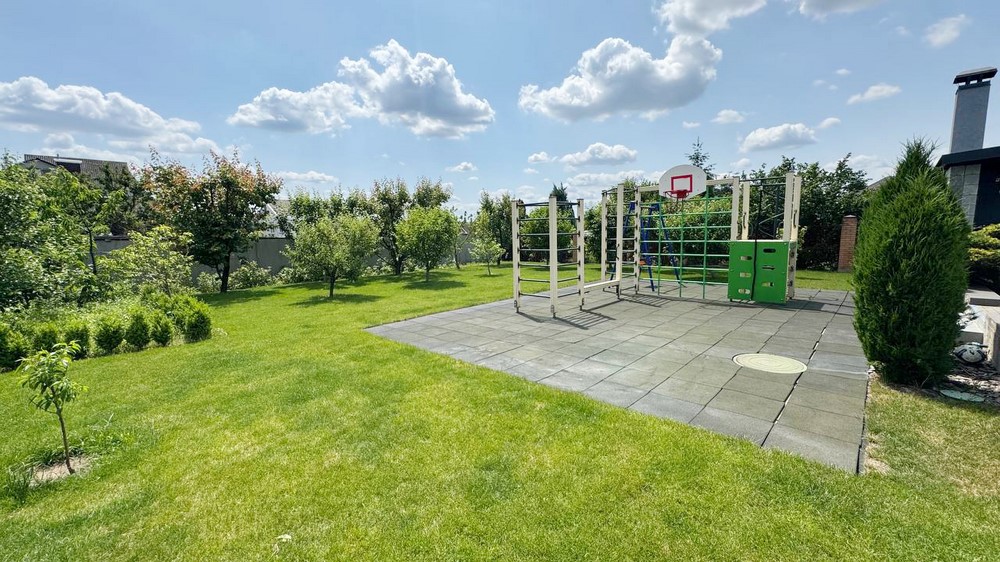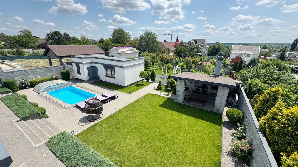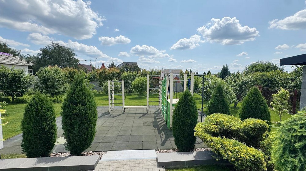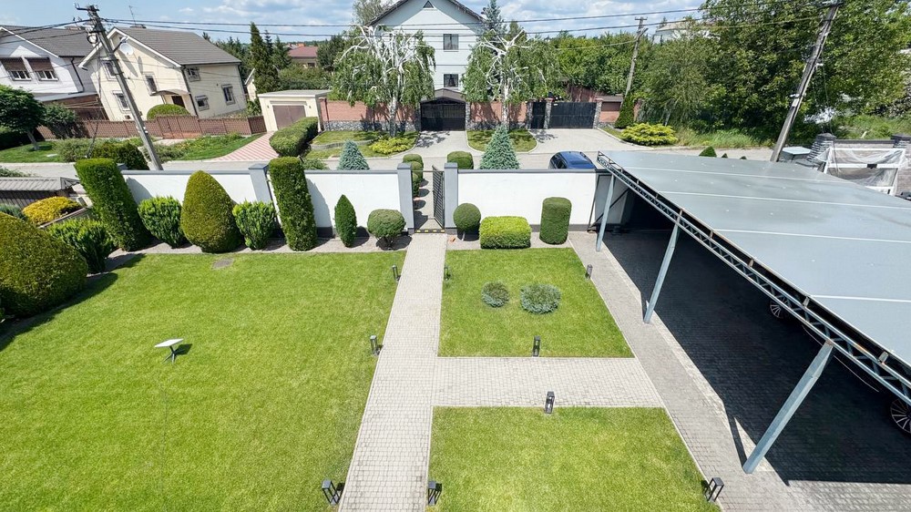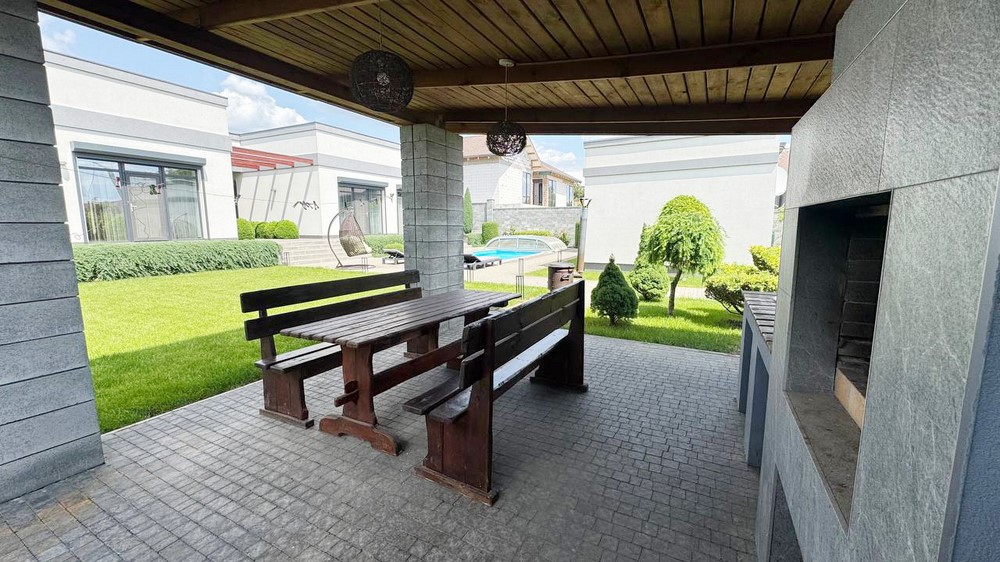 Двор:Озеленение, дорожки выложены брусчаткой, автоматический полив газона, ночная подсветка территории, бассейн с павильоном, отдельно стоящее здание 50м.кв. - сауна с комнатой отдыха + свой санузел, отдельно стоящая крытая зона барбекю, парковка на 4-автомобиля, огорожен капитальным забором