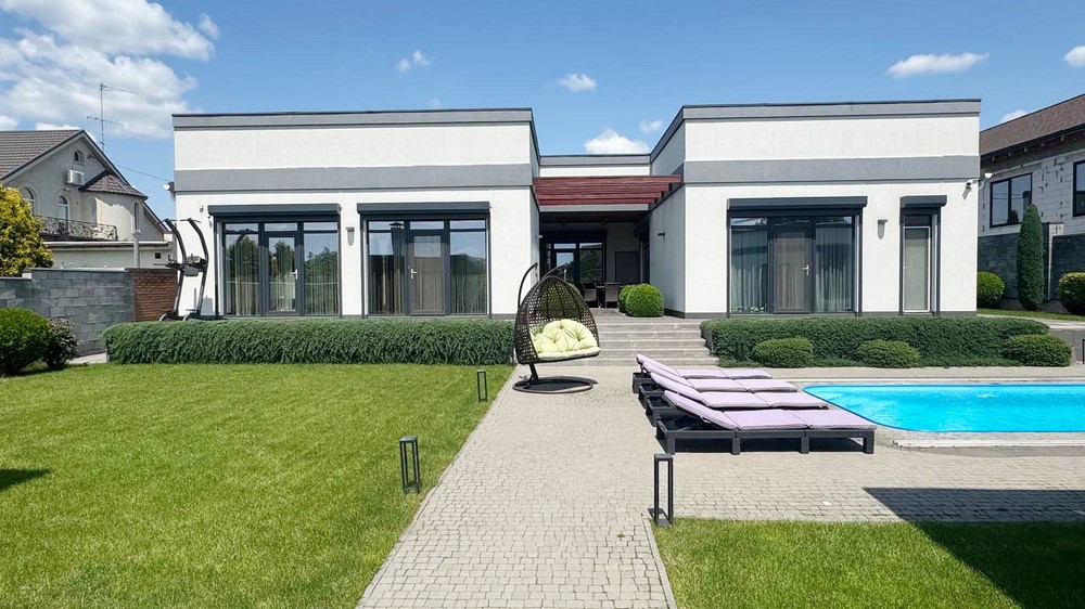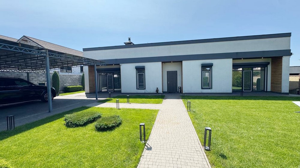 200м.кв. 1-но этажный, стены газобетон, крыша 2-х скатная мягкая кровля, панорамные окна, солнечные батареи, действующий камин, кондиционеры, сигнализация, видеонаблюдение, датчики движения, электрическое отопление. В доме выполнен современный ремонт в стиле «Хайтек», с встроенной мебелью и бытовой техникой, кухня-студия с островом, 3-спальни, кабинет, гостиная, 2 санузла, гардеробная. Дом построен П-образной формы, за счет чего образовался уютный внутренний дворик.