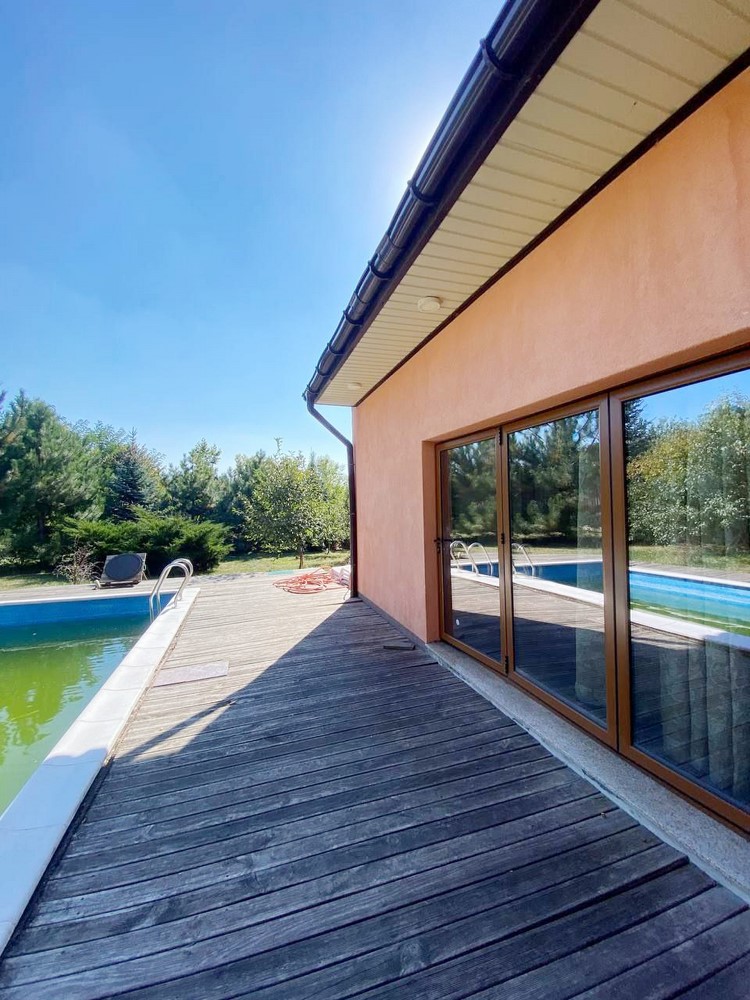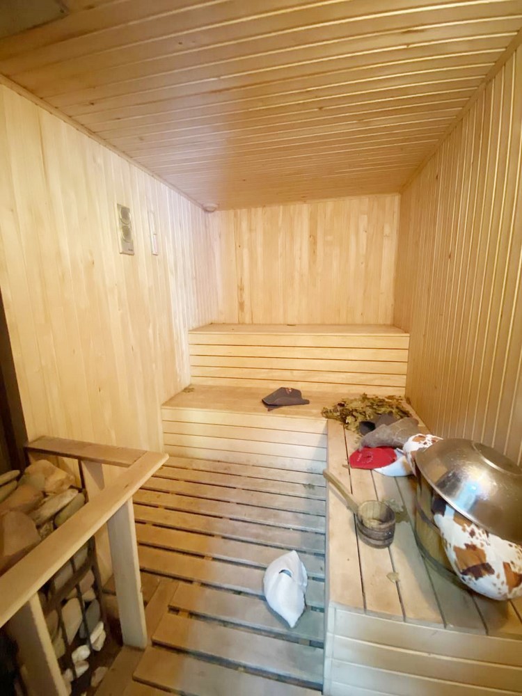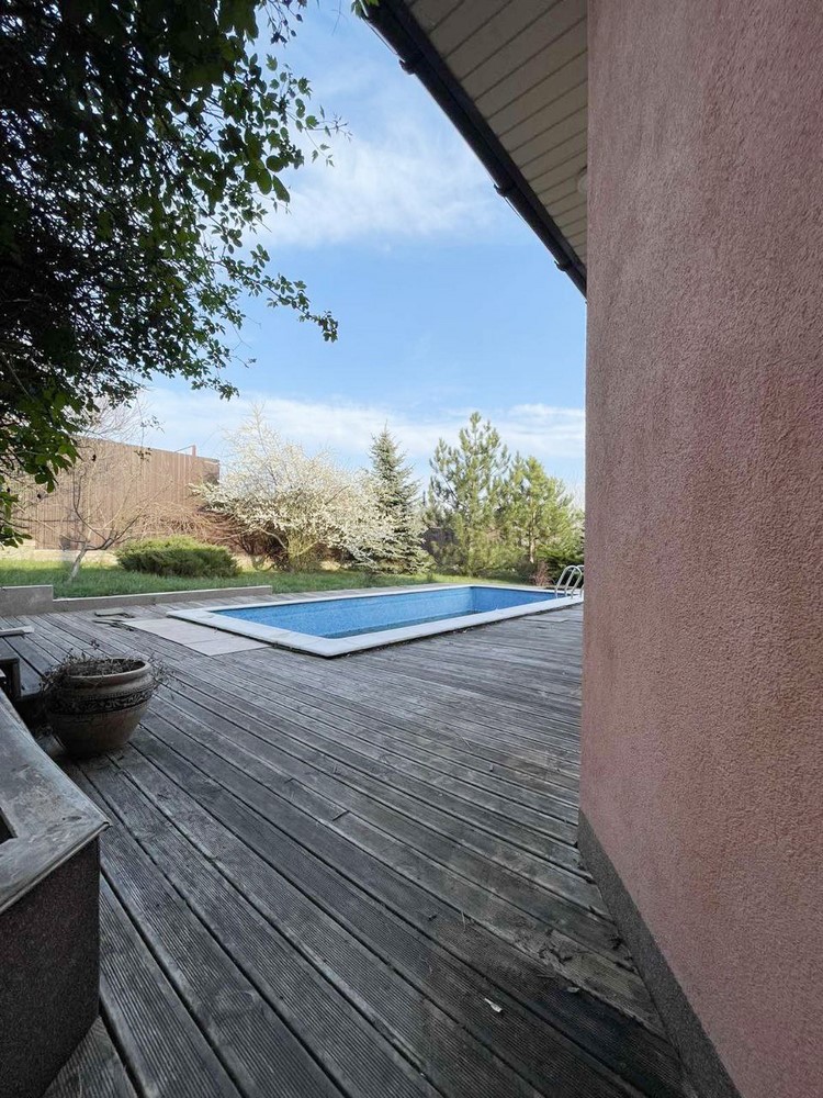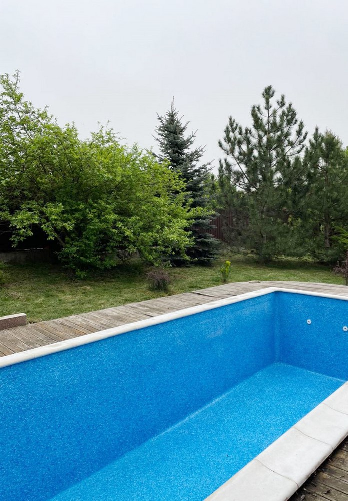 Двор:Огорожен забором, взрослое озеленение: сосны, можжевельники, туи, навес для машин, бассейн + террасная доска, тротуарная плитка, отдельно стоящий гостевой домик 45м.кв. с баней |