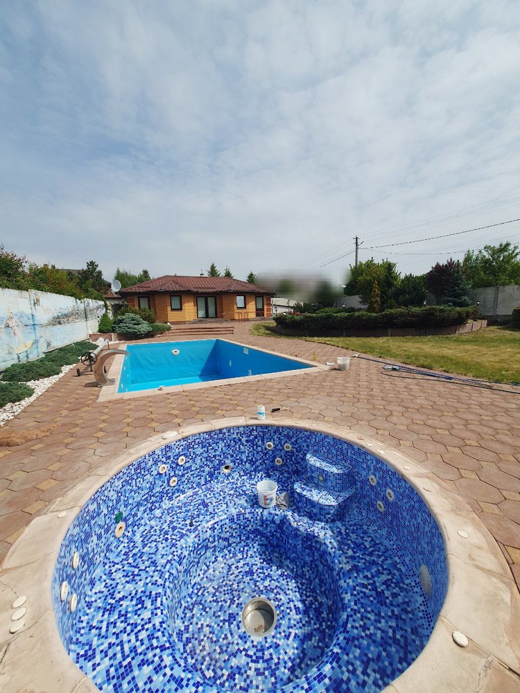 Двор: Огорожен капитальным забором, тротуарная плитка по территории, большой глубокий бассейн, отдельная джакузи, взрослое озеленение, капитальный вольер для большой собаки, отдельно стоящее помещение (без внутреннего ремонта)